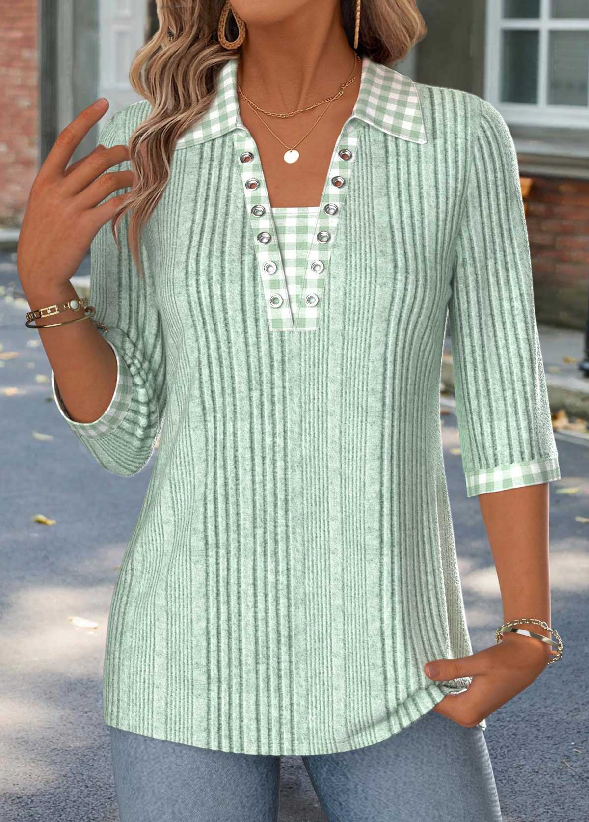 Sage Green Gingham Print 3/4 Sleeve T Shirt