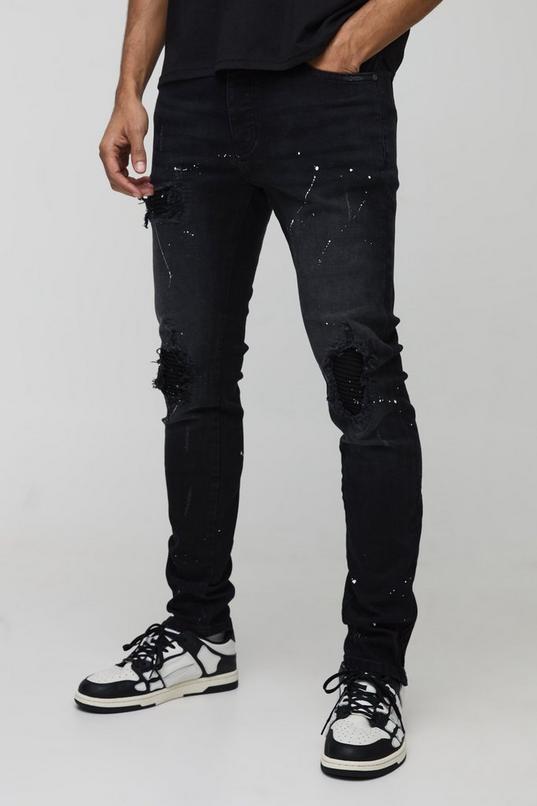 Paint Splatter Biker Rip & Repair Zip Hem Skinny Jeans