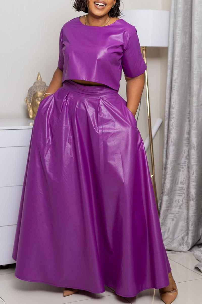 Plus Size Purple Business Casual Pu-Leather With Pockets Two Piece Skirt Sets[Pre-Order]