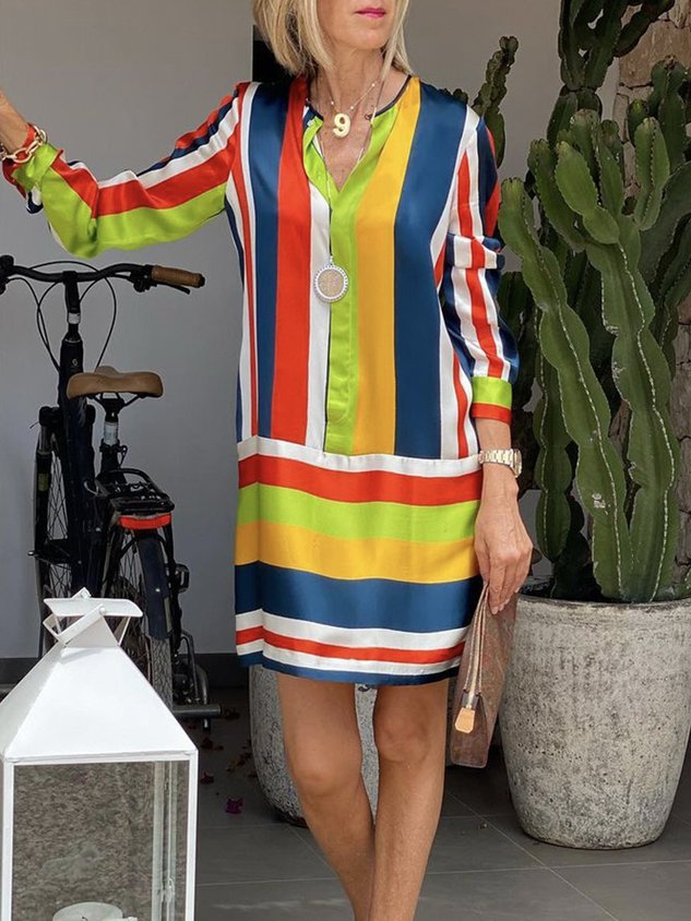 Half sleeve Elegant Shirt Collar Striped Loose Dress
