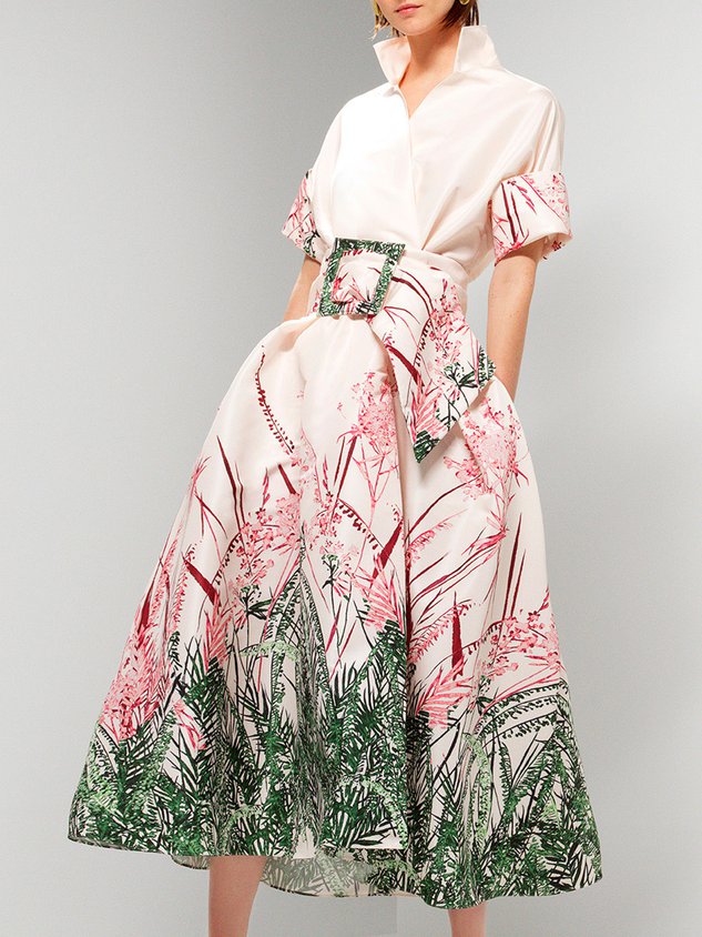Elegant Printed Short Sleeve Shirt Collar Dress