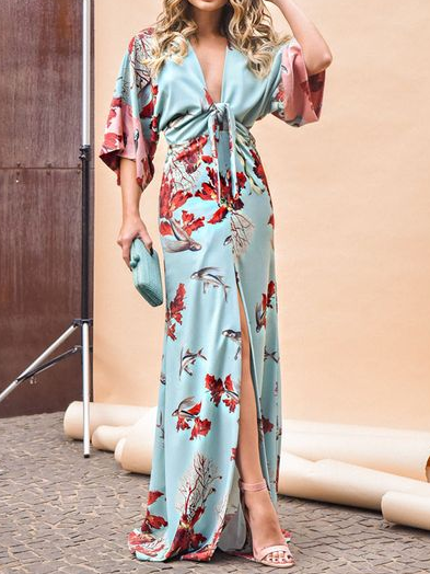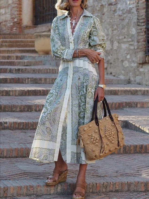 Vacation Shirt Collar Long Sleeve Floral Printed Dress