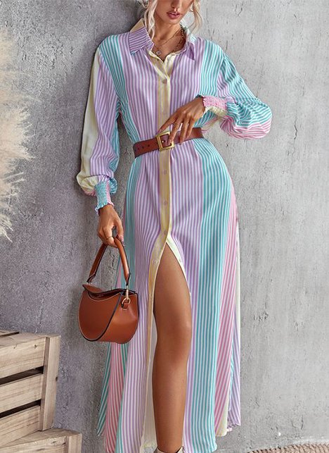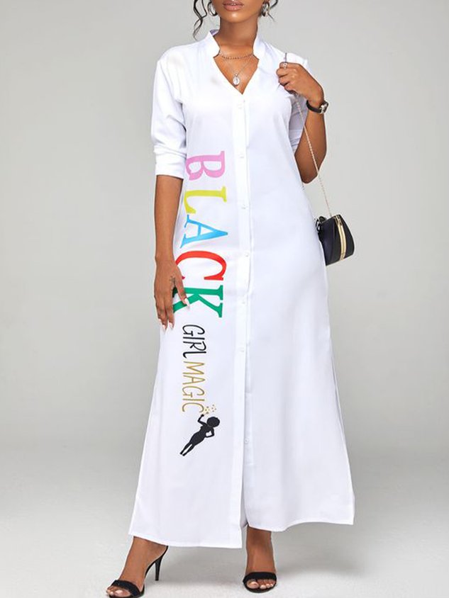Loosen Shirt Collar Letter Long Sleeve Woven Maxi Dress
