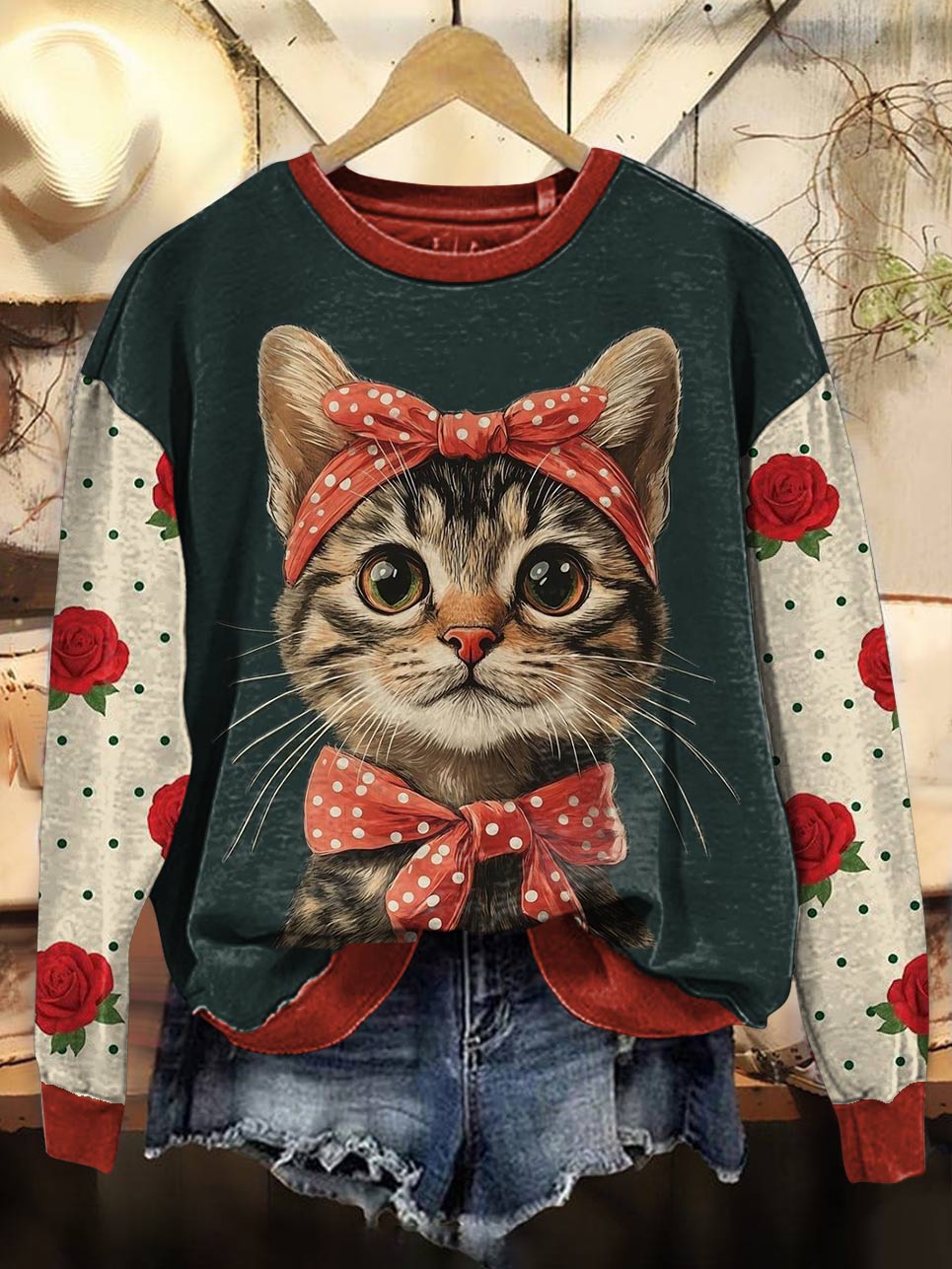 Cute Retro Cat Art Print Casual Cotton Sweatshirt