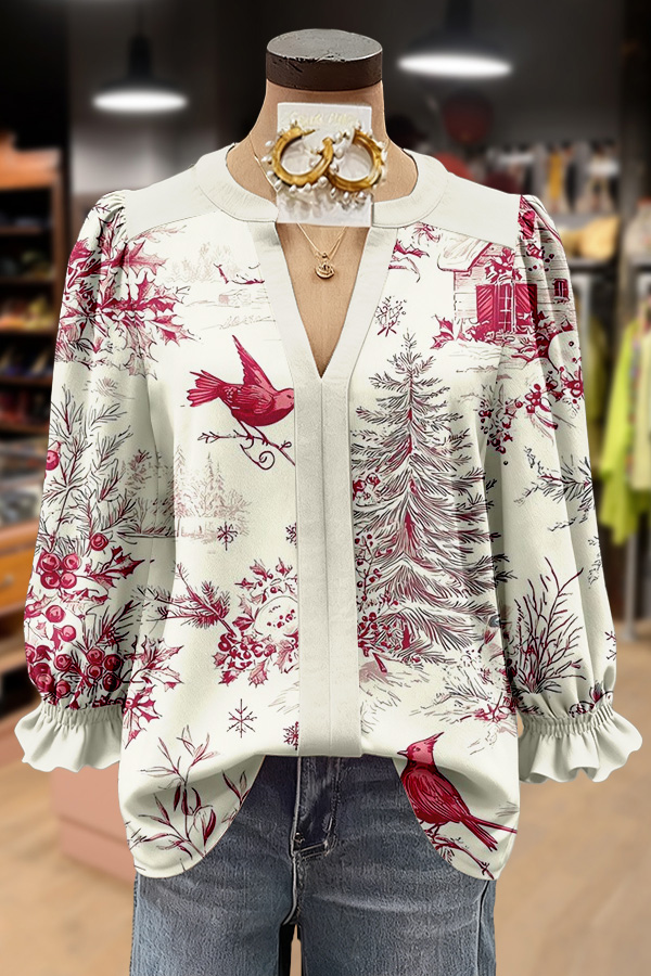 Chic Christmas Tree Print Notch Neck Top