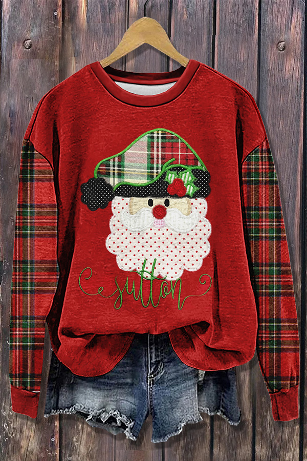 Christmas Santa Embroidered Plaid Long Sleeve Sweatshirt