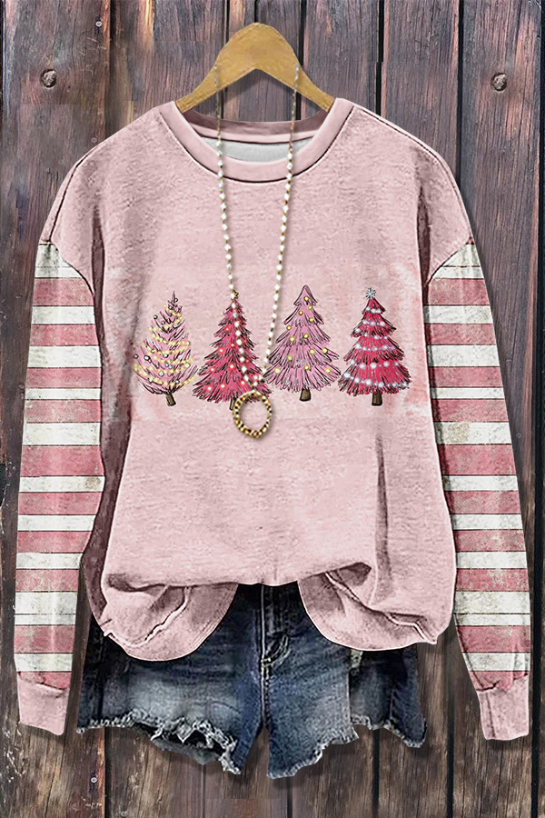 Sweet Christmas Tree Print Striped Long Sleeve Sweatshirt