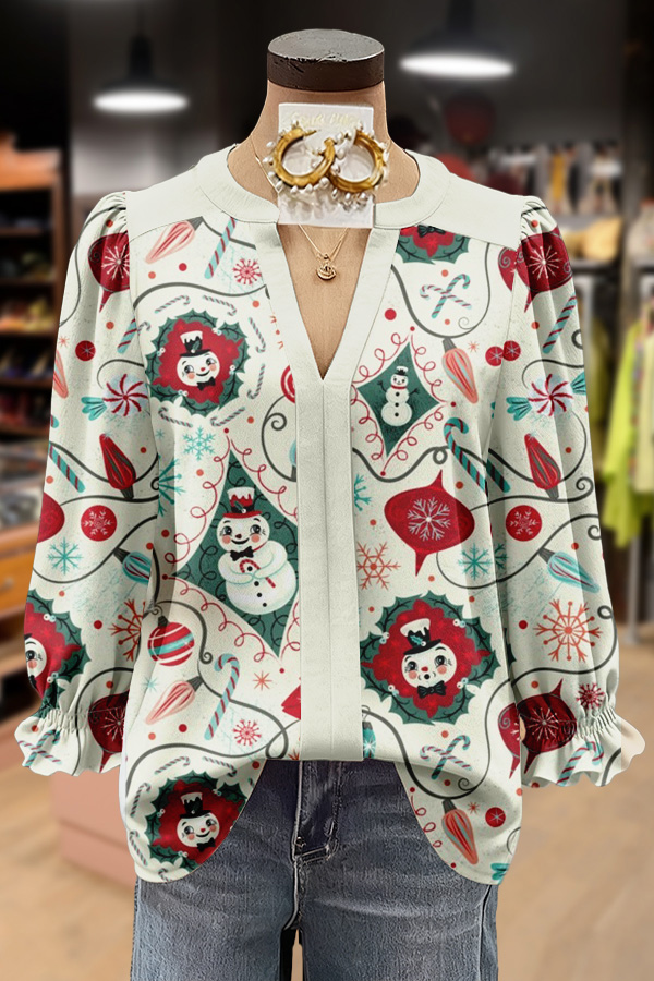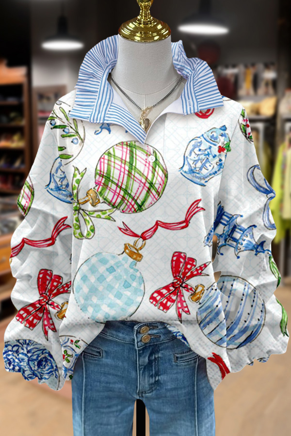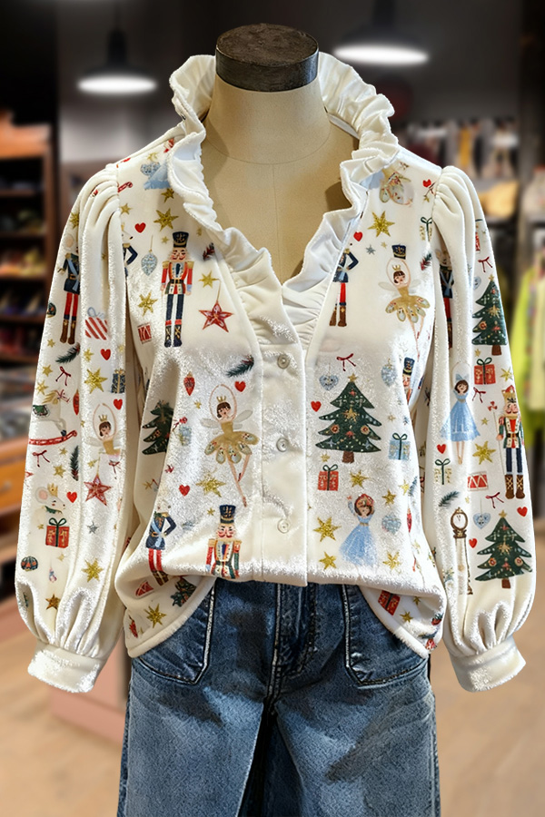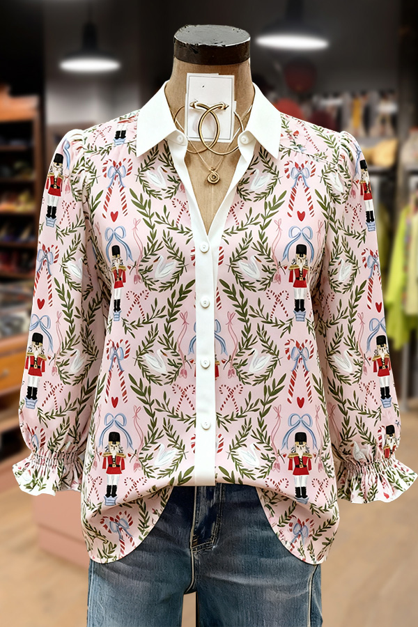 Sweet Nutcracker Print Collared Long Sleeve Top