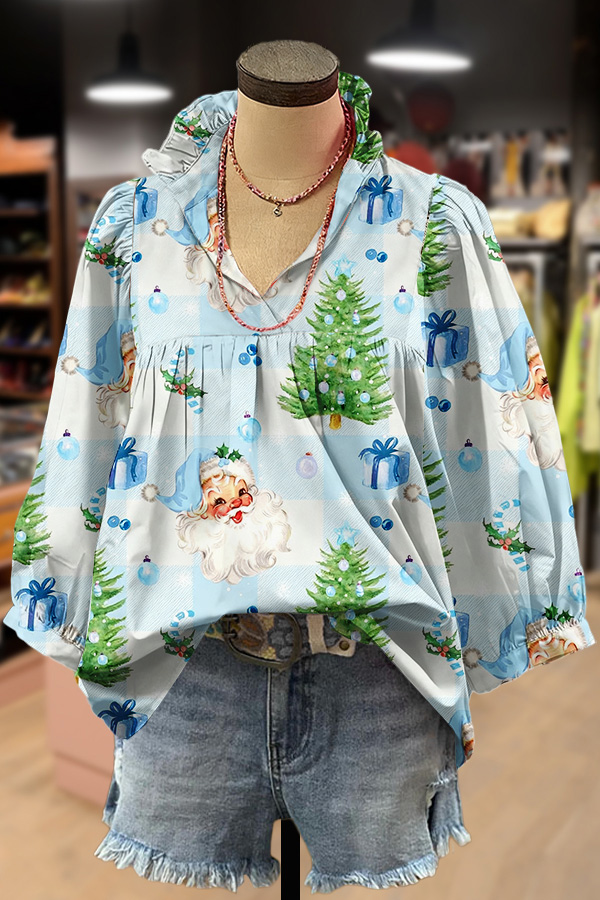 Christmas Nutcracker Print Ruffle Neck Velvet Top