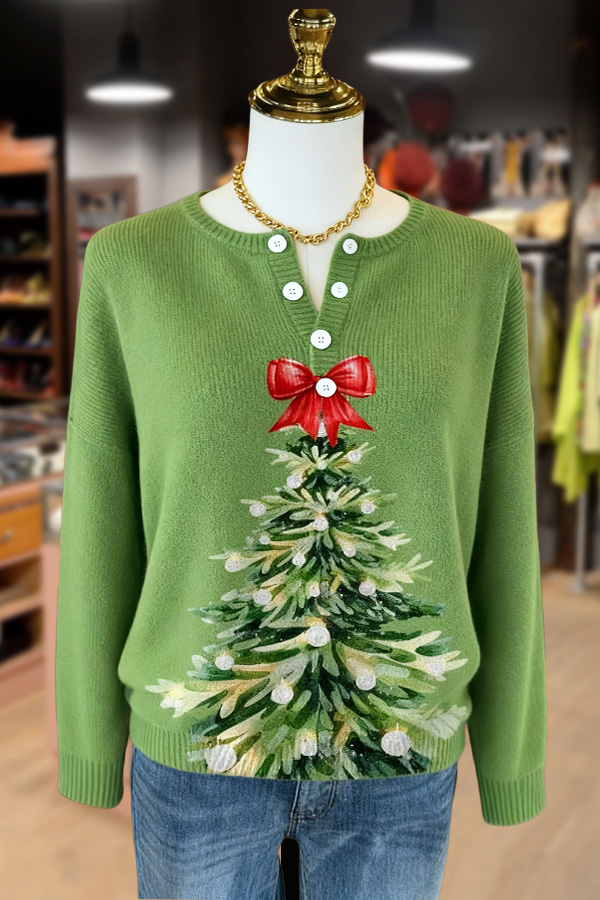 Christmas Tree Pattern Button Detailed Long Sleeve Sweater