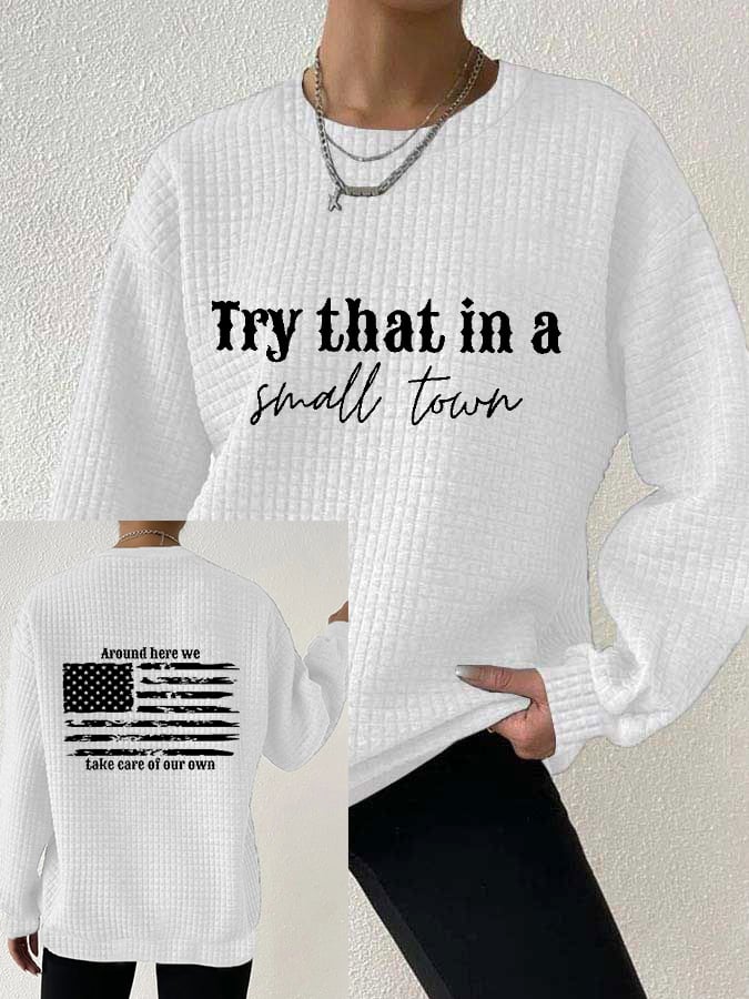 Women's Try That In A Small Town American Flag Print Waffle Sweatshirt