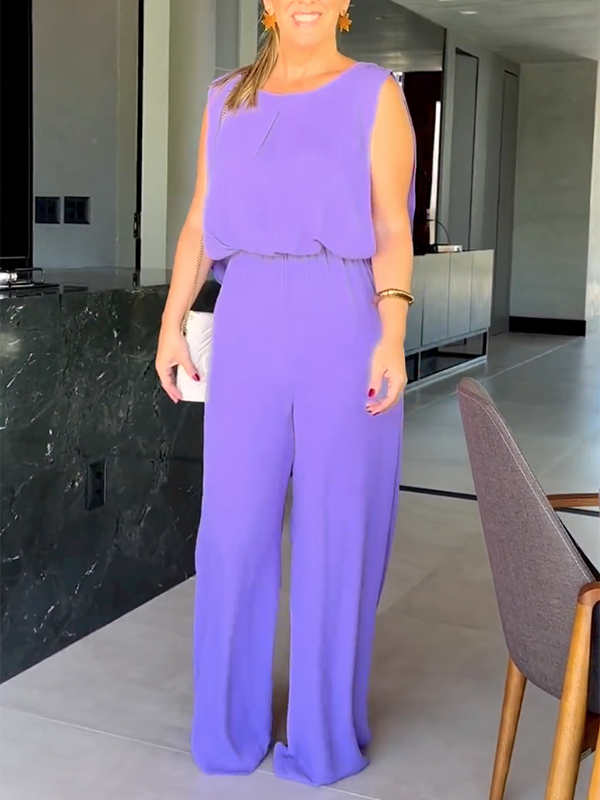 Solid Color Loose Sleeveless Round-Neck Jumpsuits