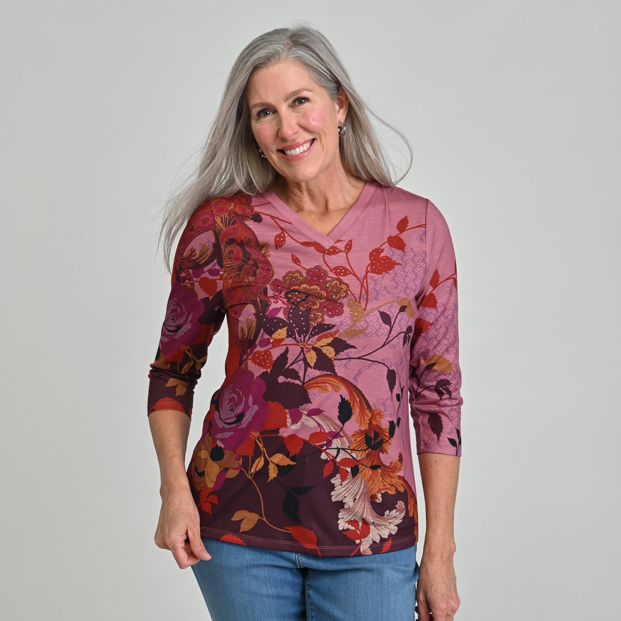 Printed 3/4 Sleeve V Neck Top