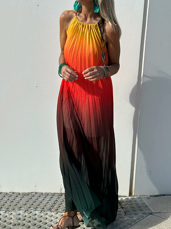 Multi-Colored Pleated Loose Sleeveless Halter-Neck Maxi Dresses