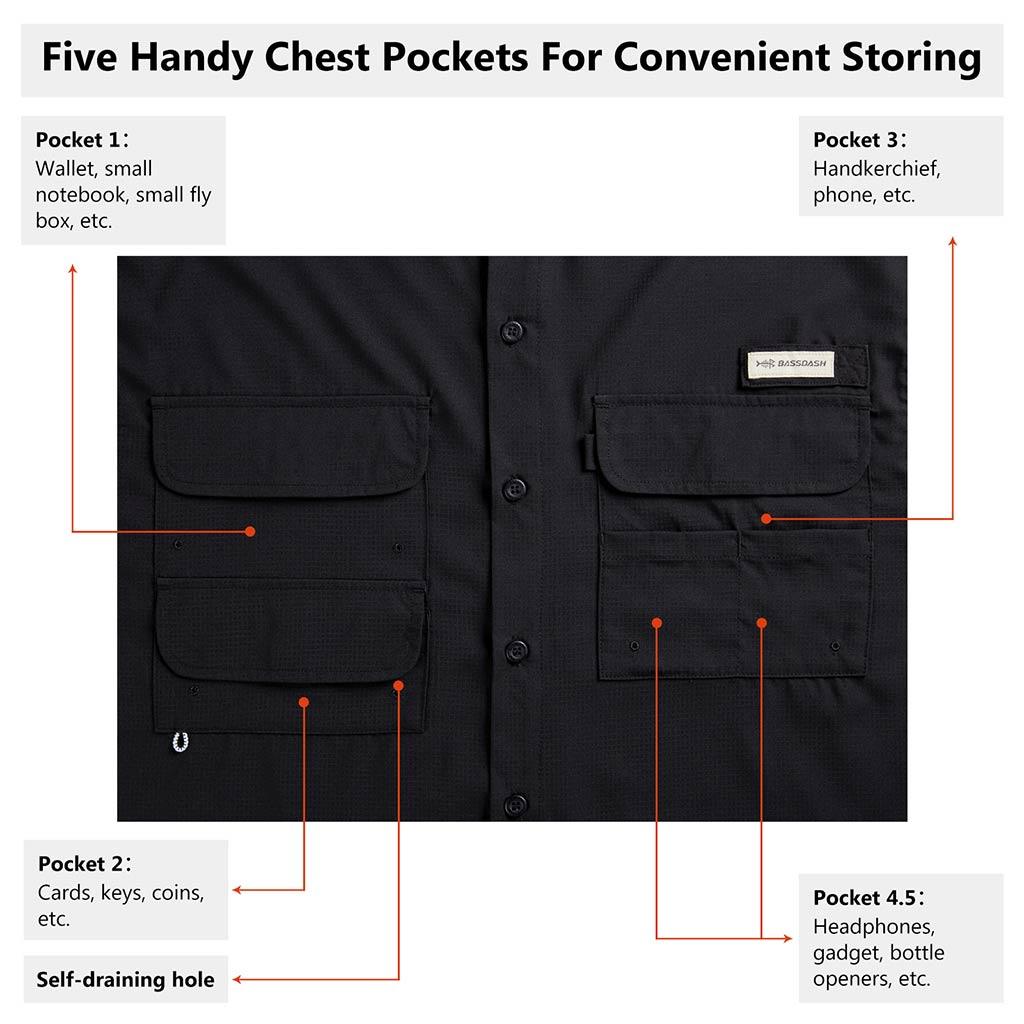 Handy feature design - five chest pockets with hook-and-loop closure for convenient storing; A rod holder loop at the left chest; A Glasses or Pen loop; An accessory loop under the right chest pocket. These performance designs can well keep your essentials at the ready and free up your hands