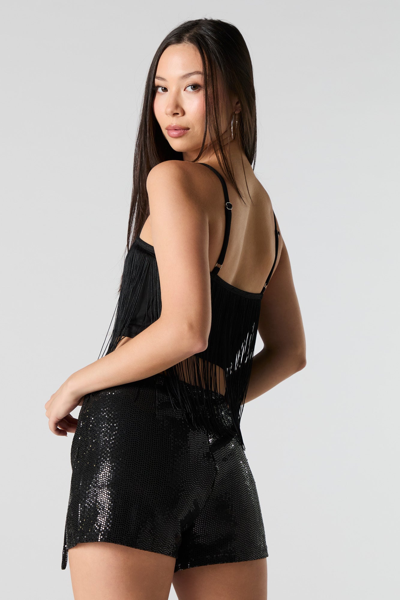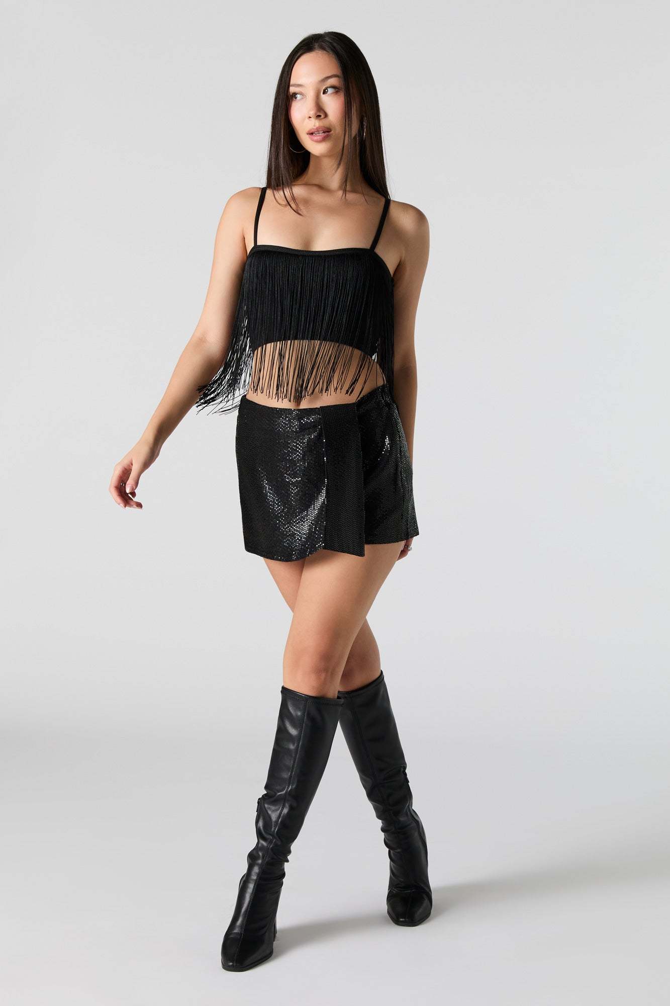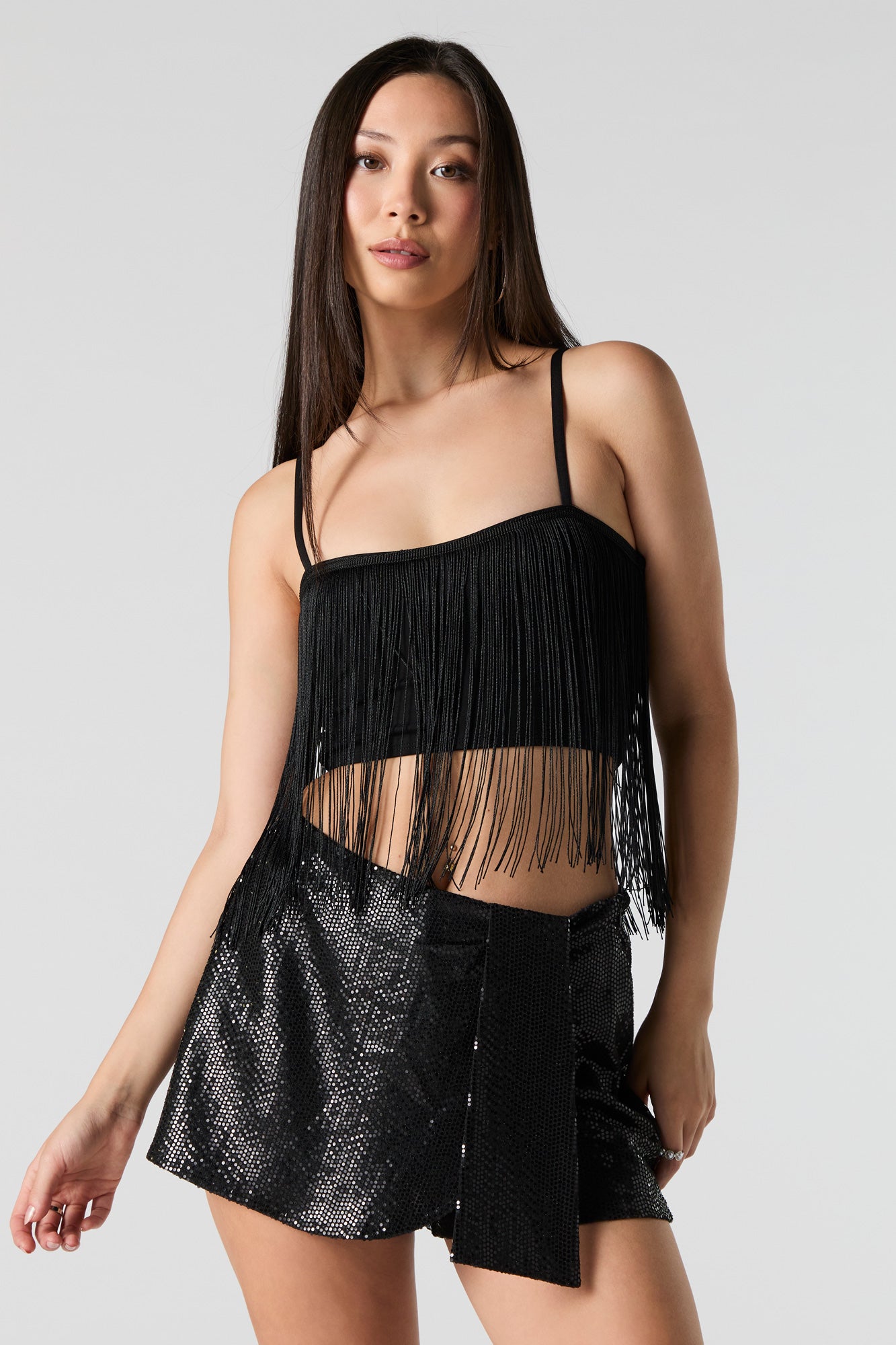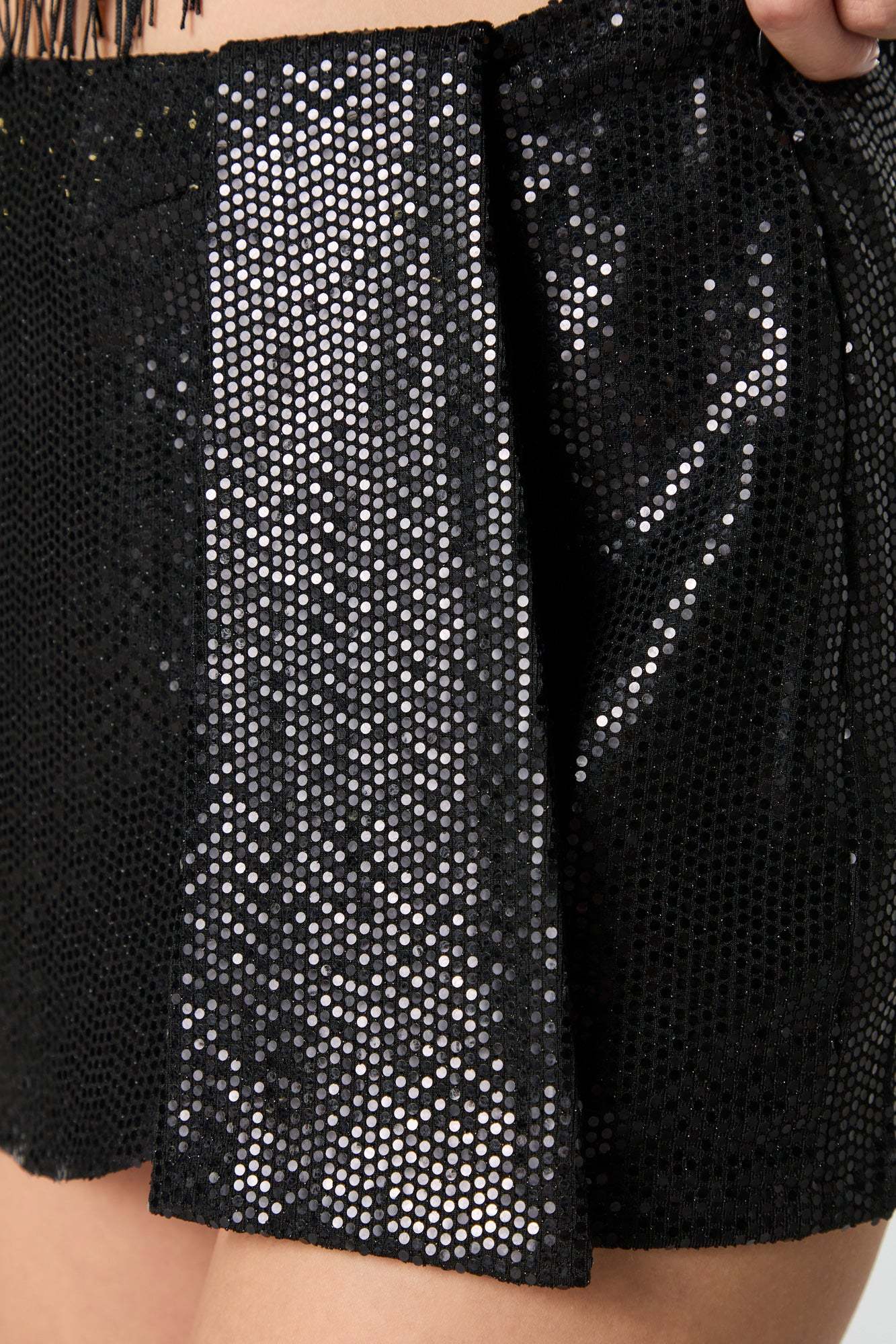 Why stay in when you could wear this? This skort features sequin material, built-in short, and mini length.