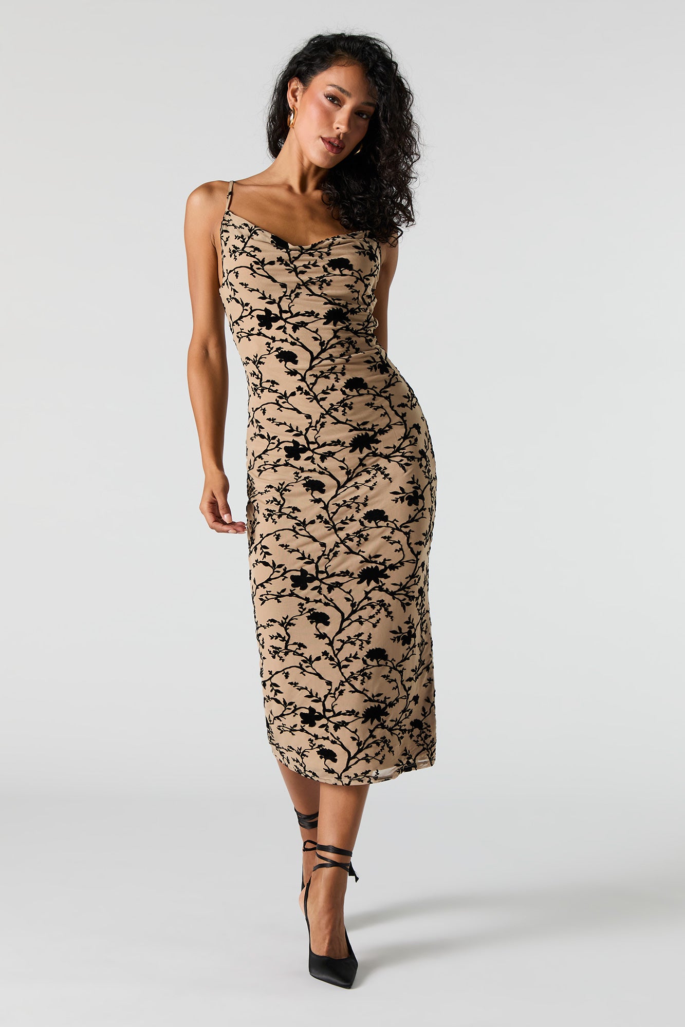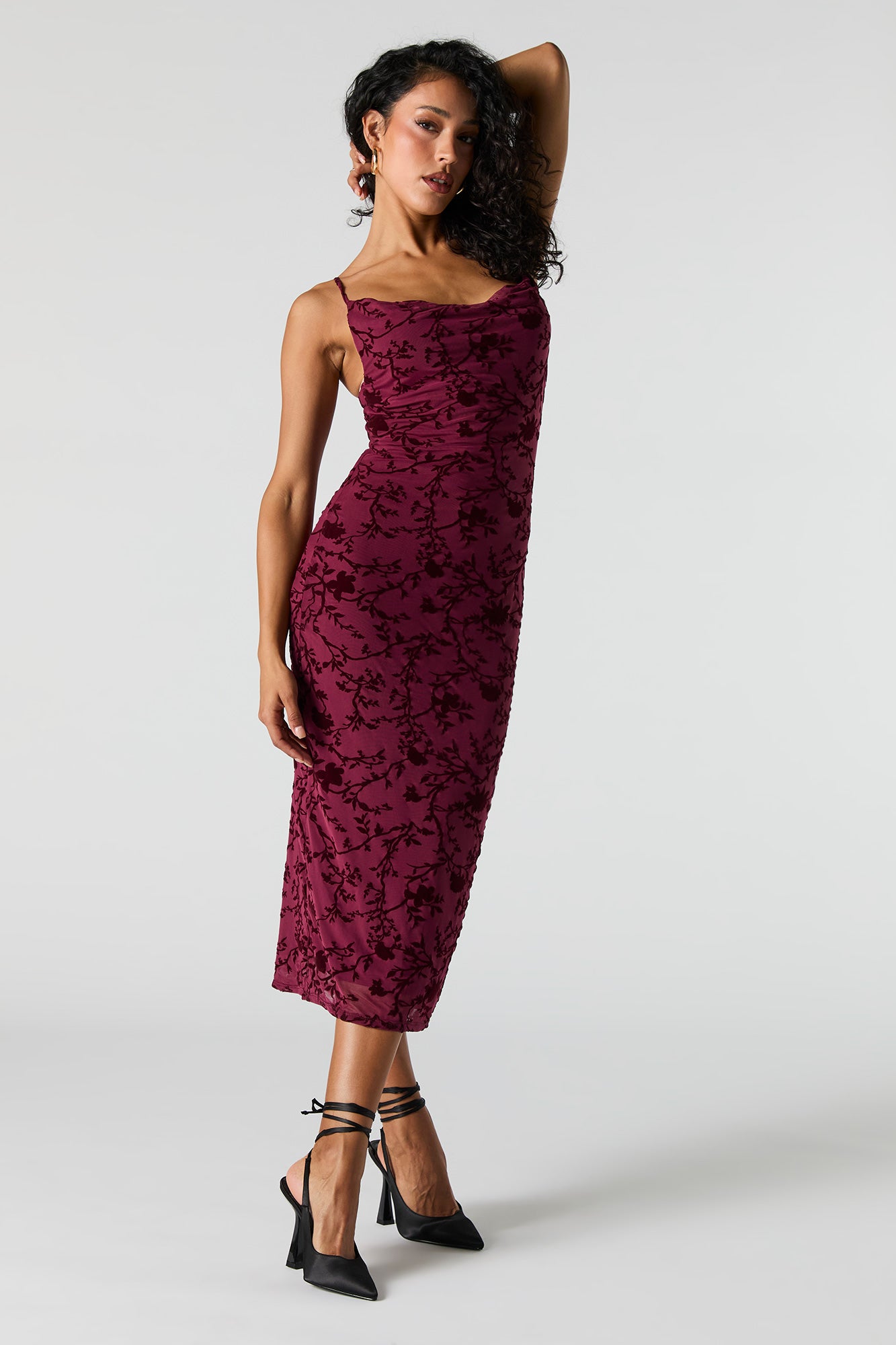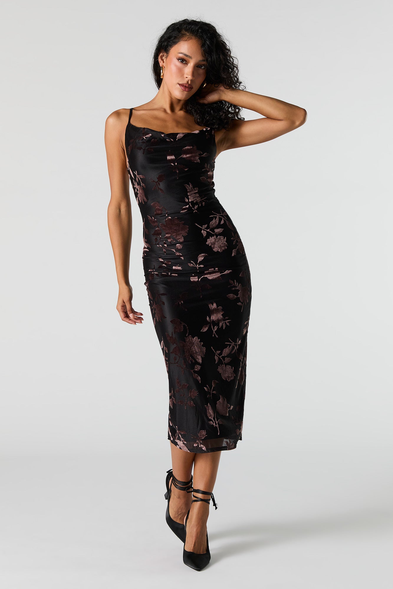 This dress features mesh material, floral print, cowl neckline, adjustable straps, mesh insert, and midi length.