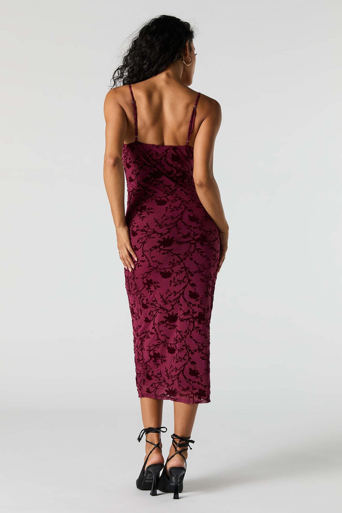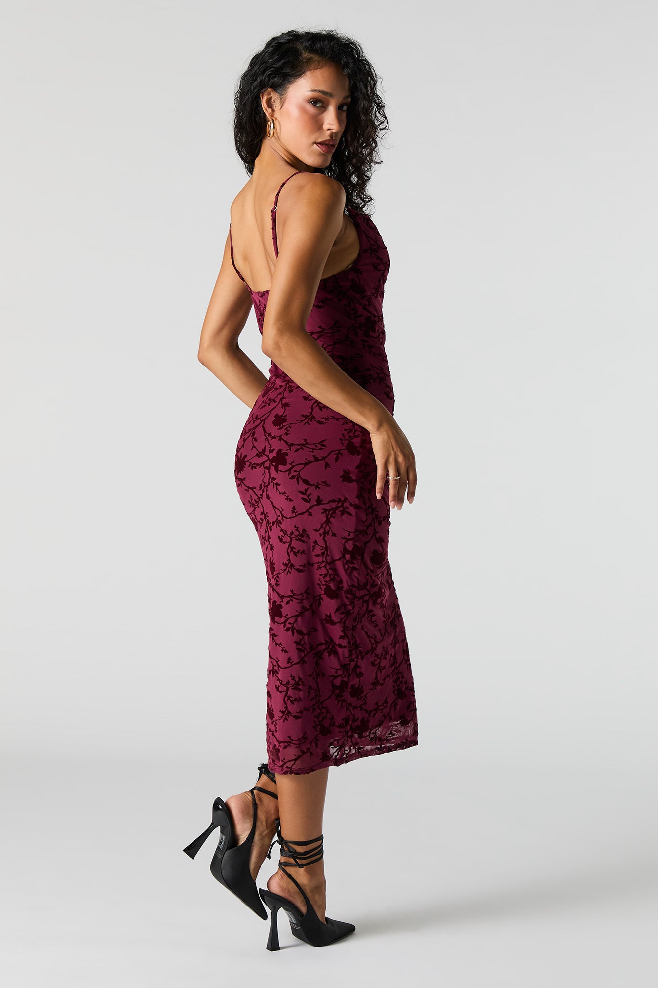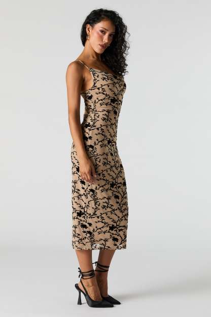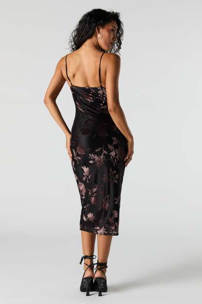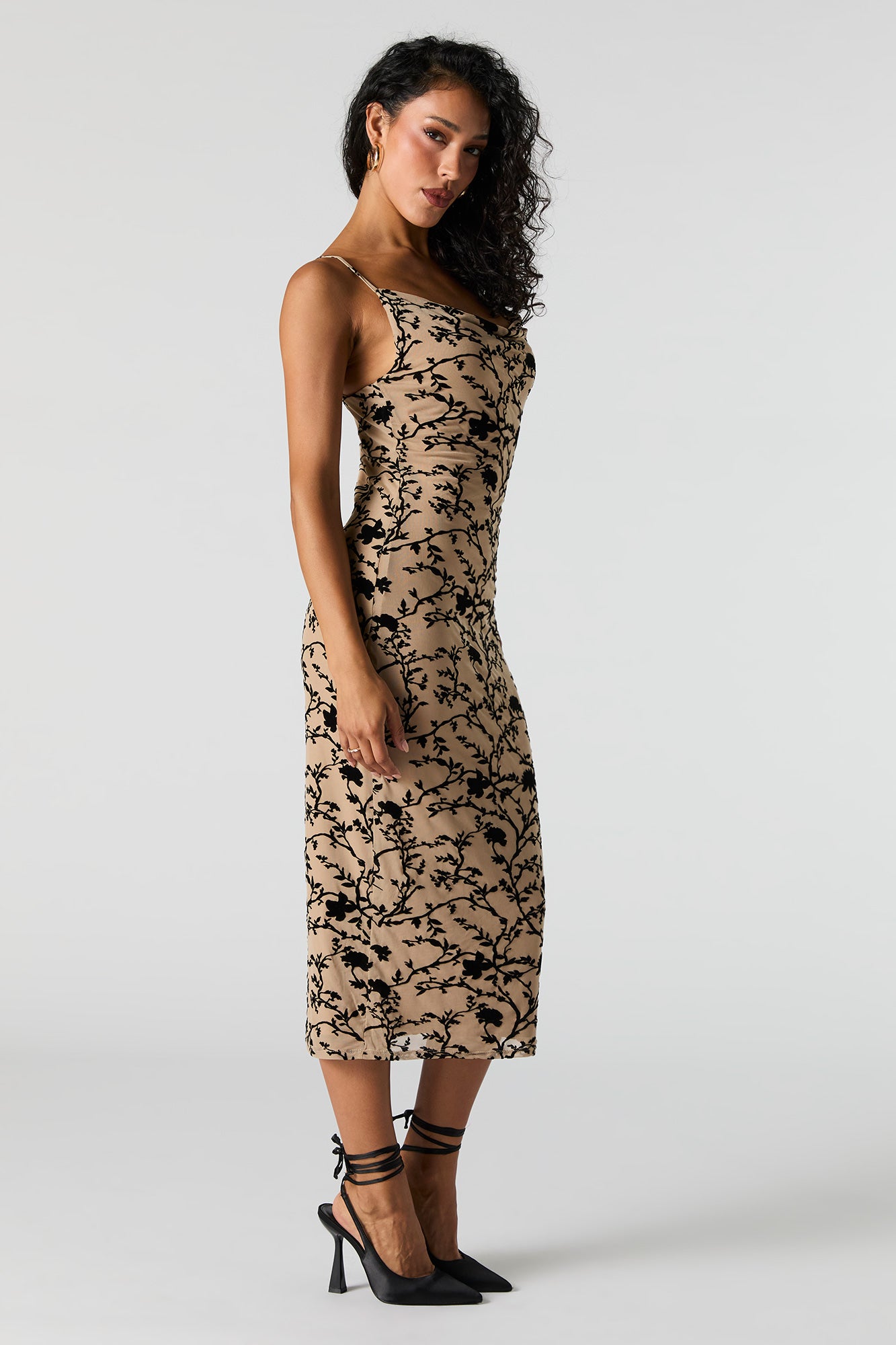 This dress features mesh material, floral print, cowl neckline, adjustable straps, mesh insert, and midi length.