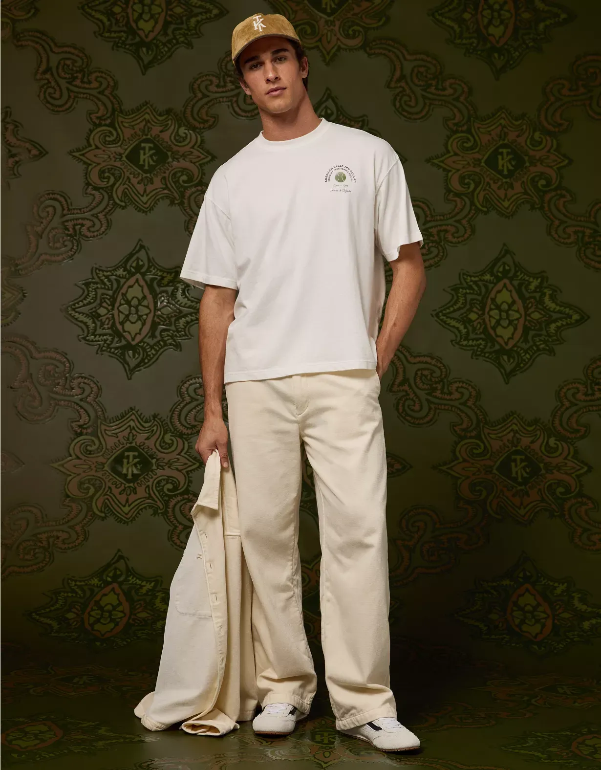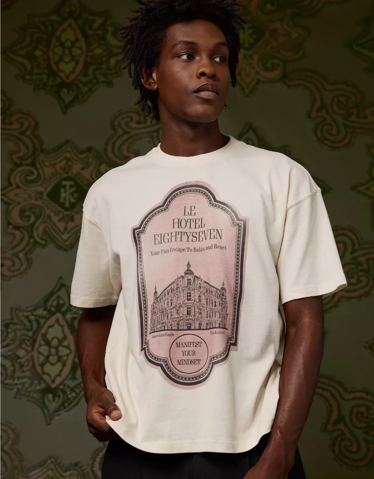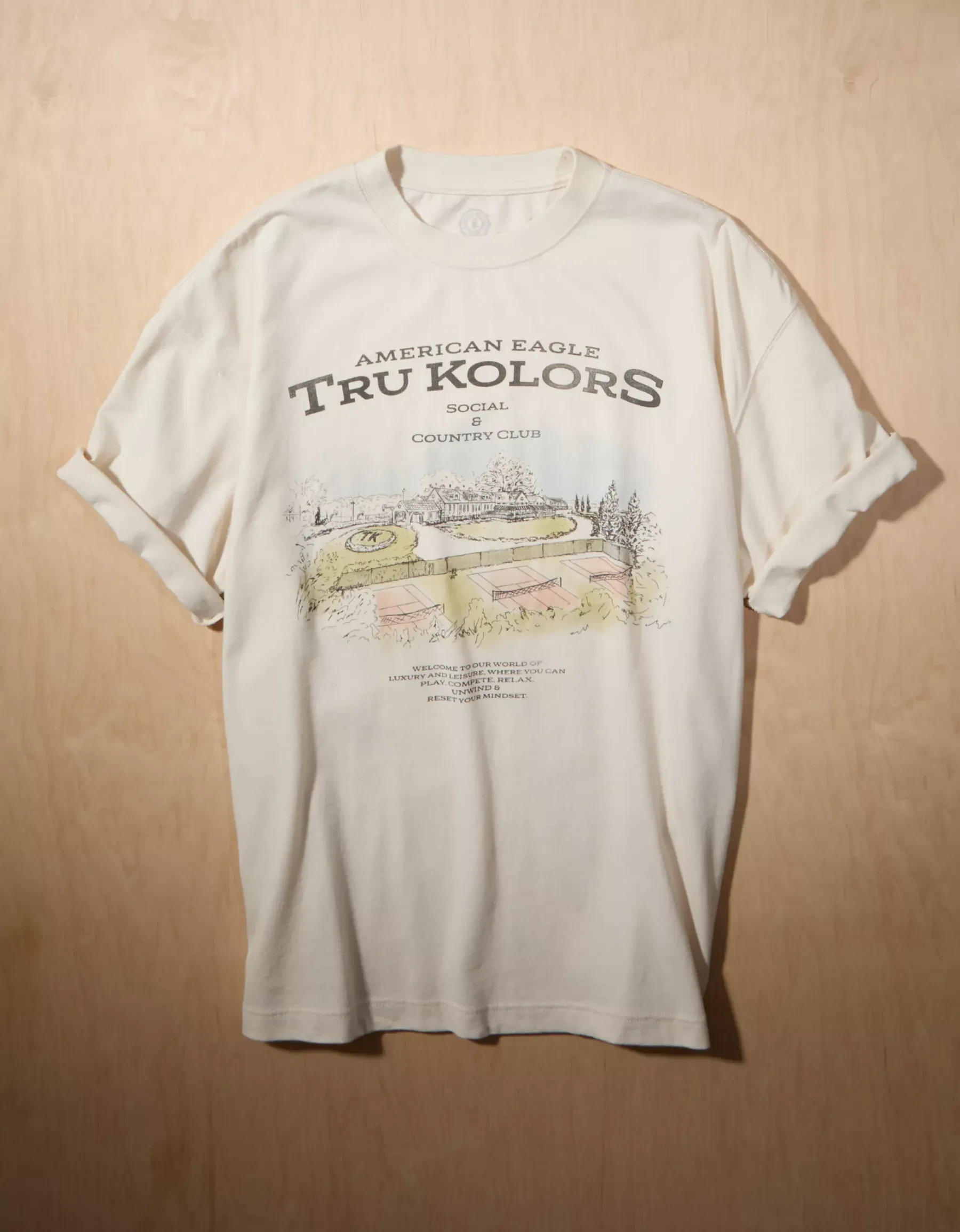 AE and Tru Kolors collaborated on this sueded cotton jersey tee, featuring a graphic that was handpicked by Travis Kelce and hand-sketched by the AE design team. Part of our exclusive, limited-edition collab with Tru Kolors by Travis KelceSueded cotton jerseyCrewneckGraphic at chest Lived-in wash for a vintage vibeExcluded from promotionsMaterials & Care