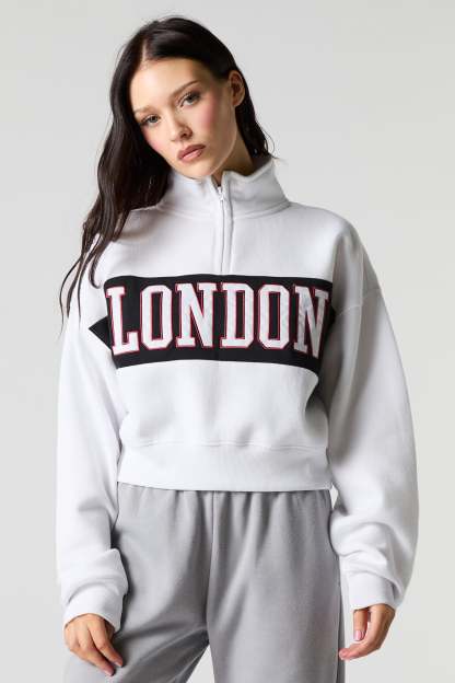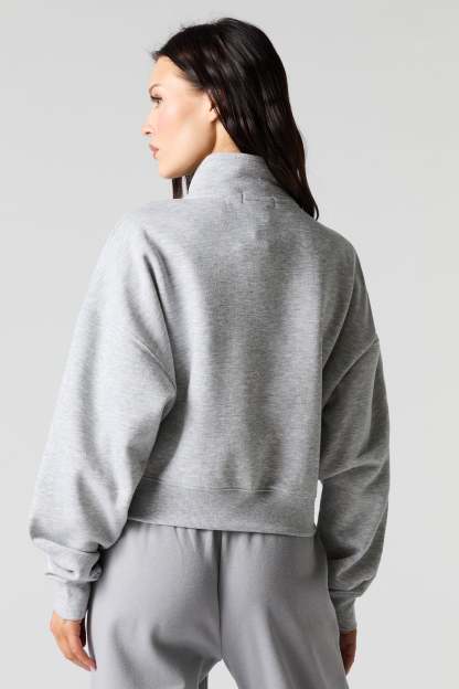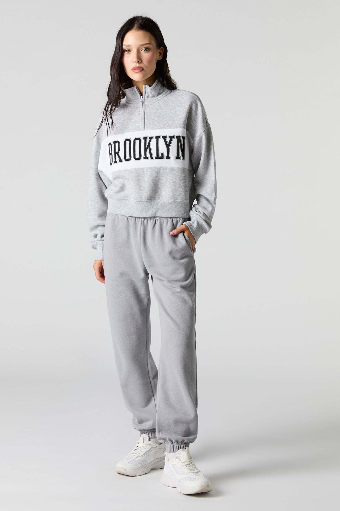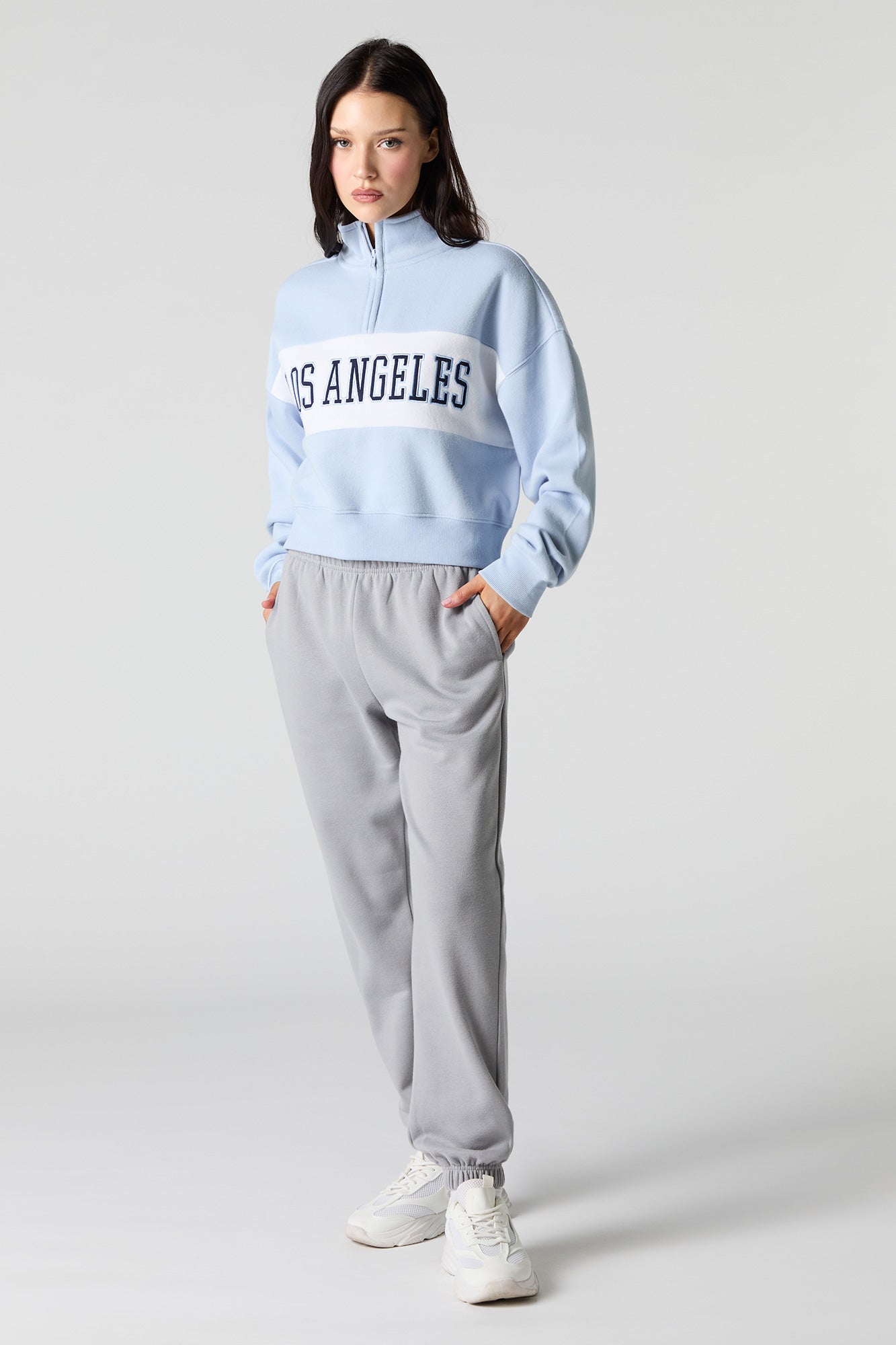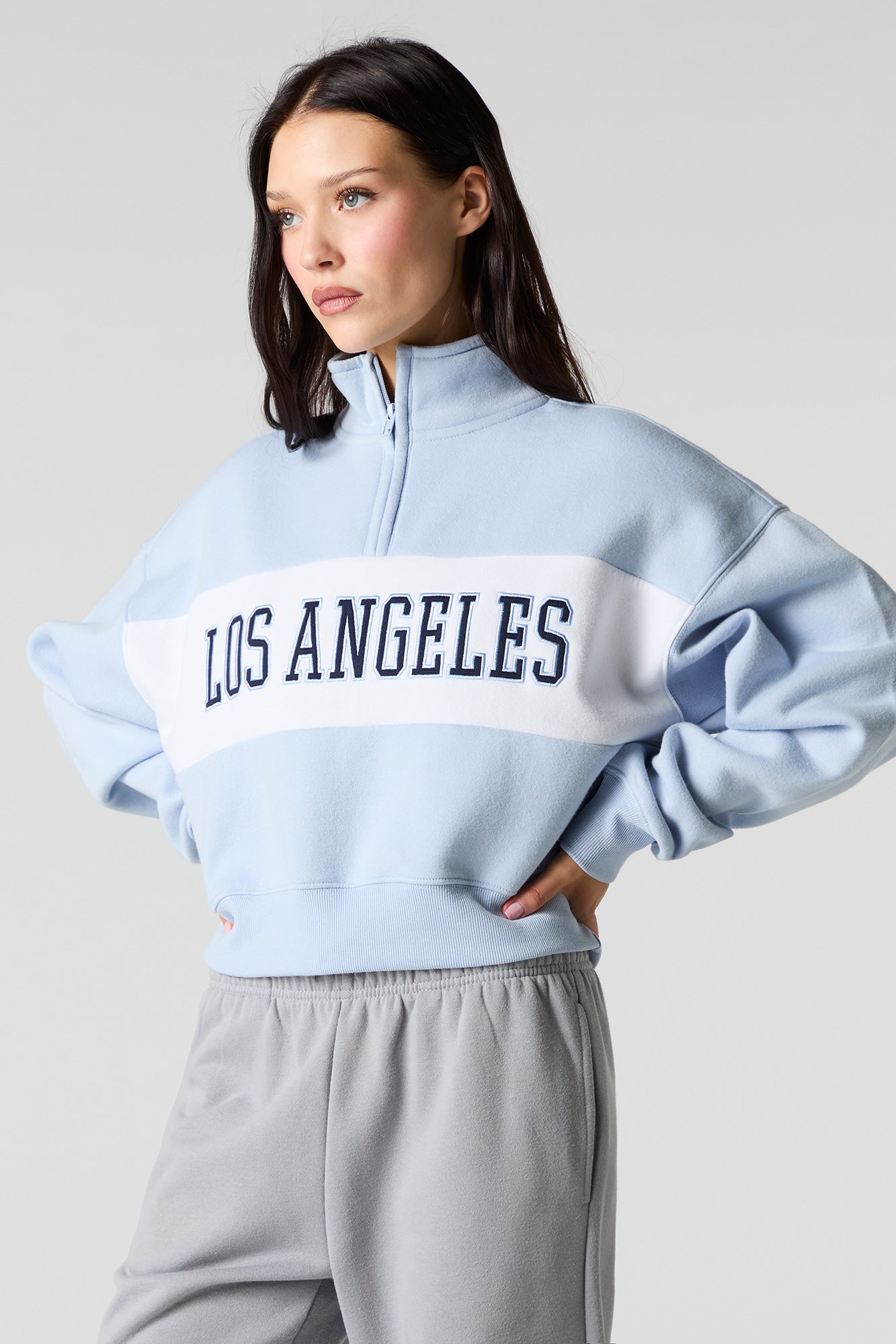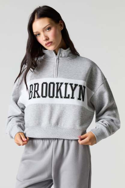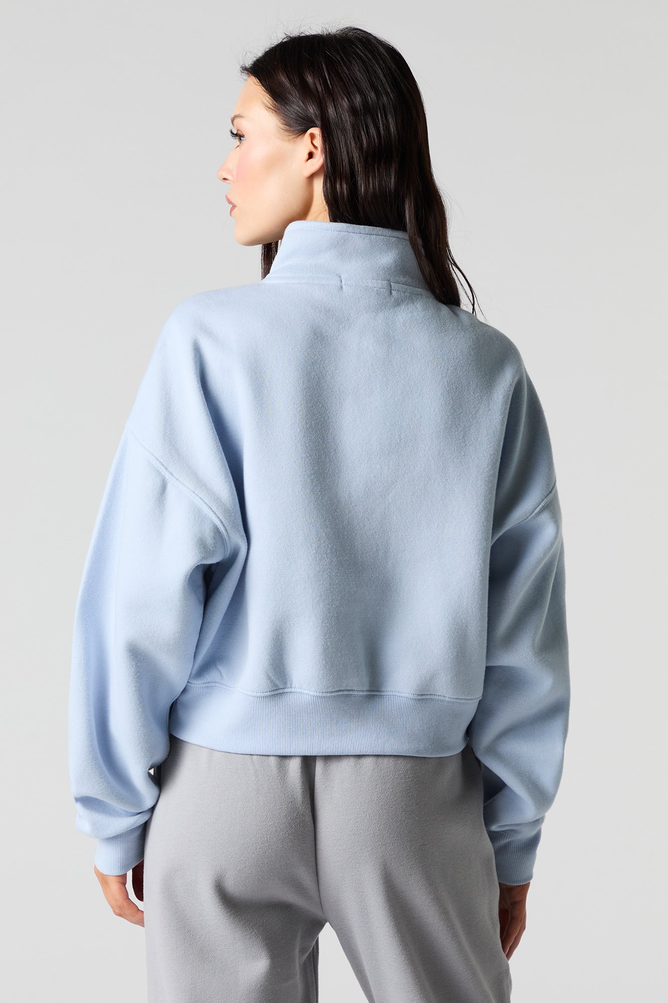 This sweatshirt features fleece material, twill embroidered front, quarter zip neckline, long sleeves, and ribbed knit trim.