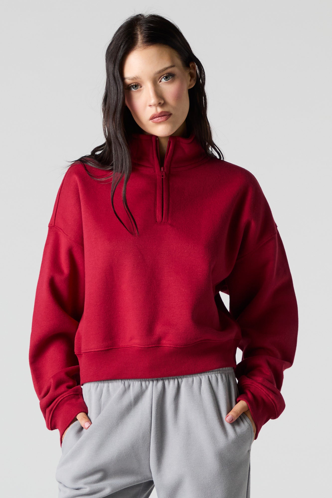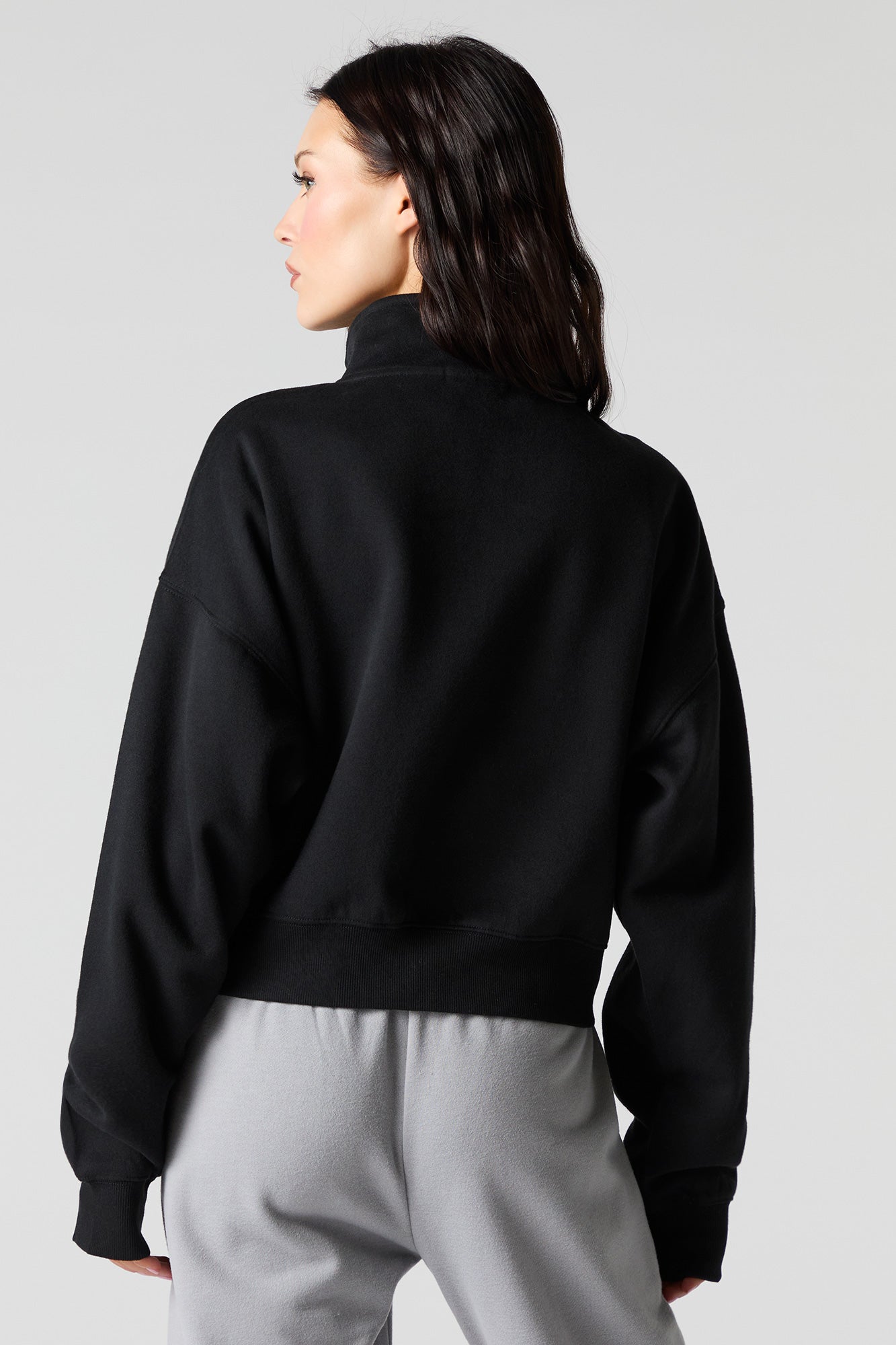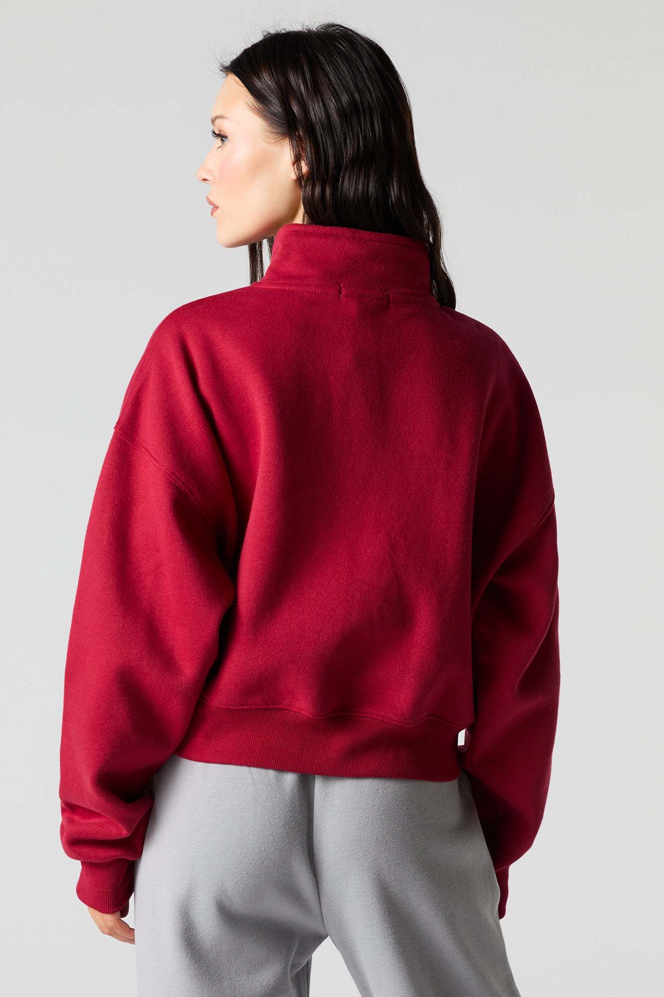 This sweatshirt features fleece material, quarter zip neckline, long sleeves, and ribbed knit trim.