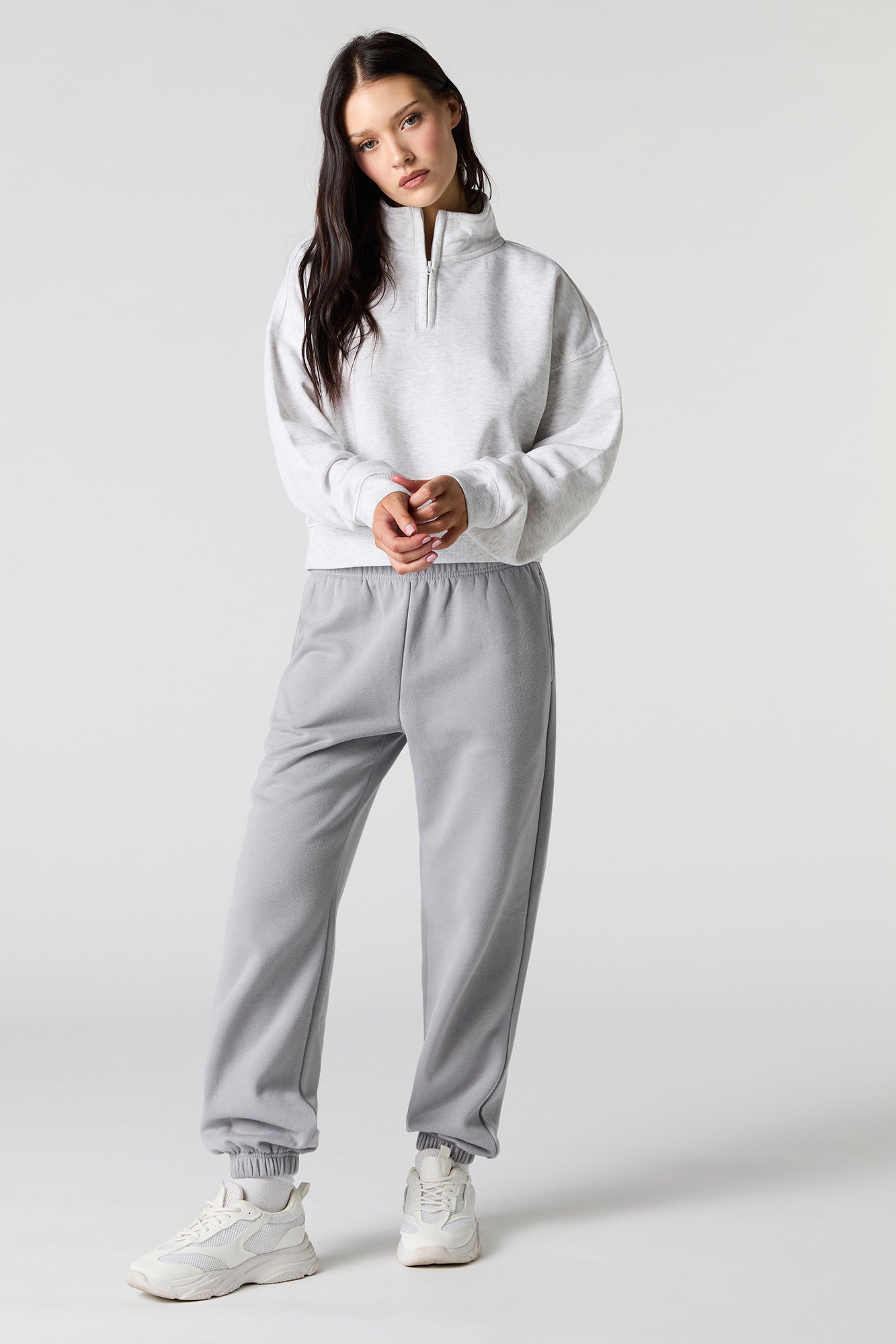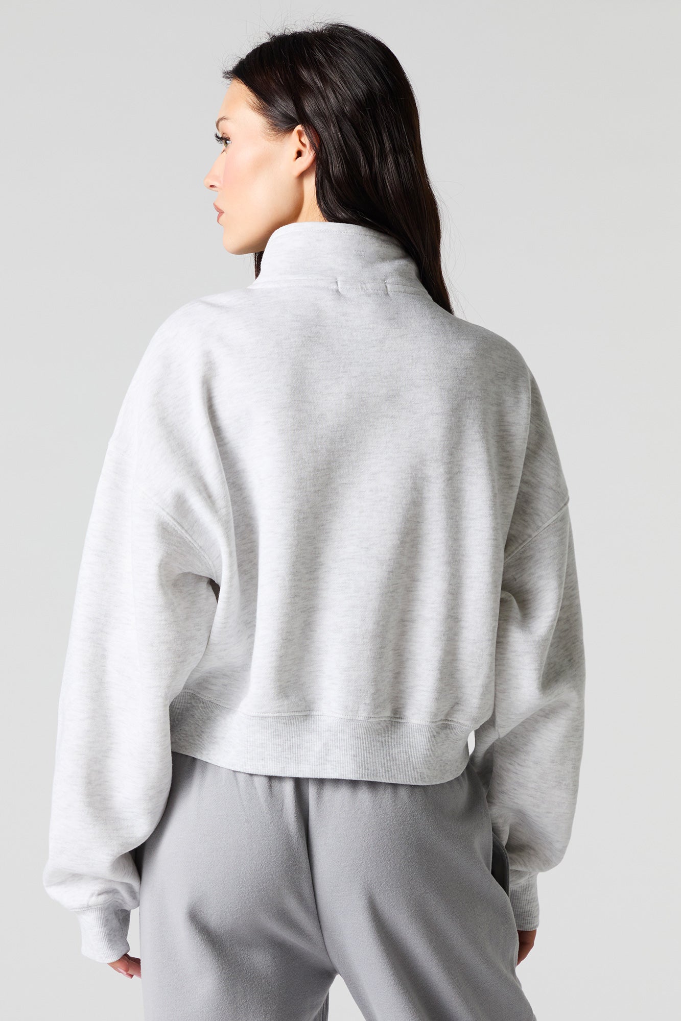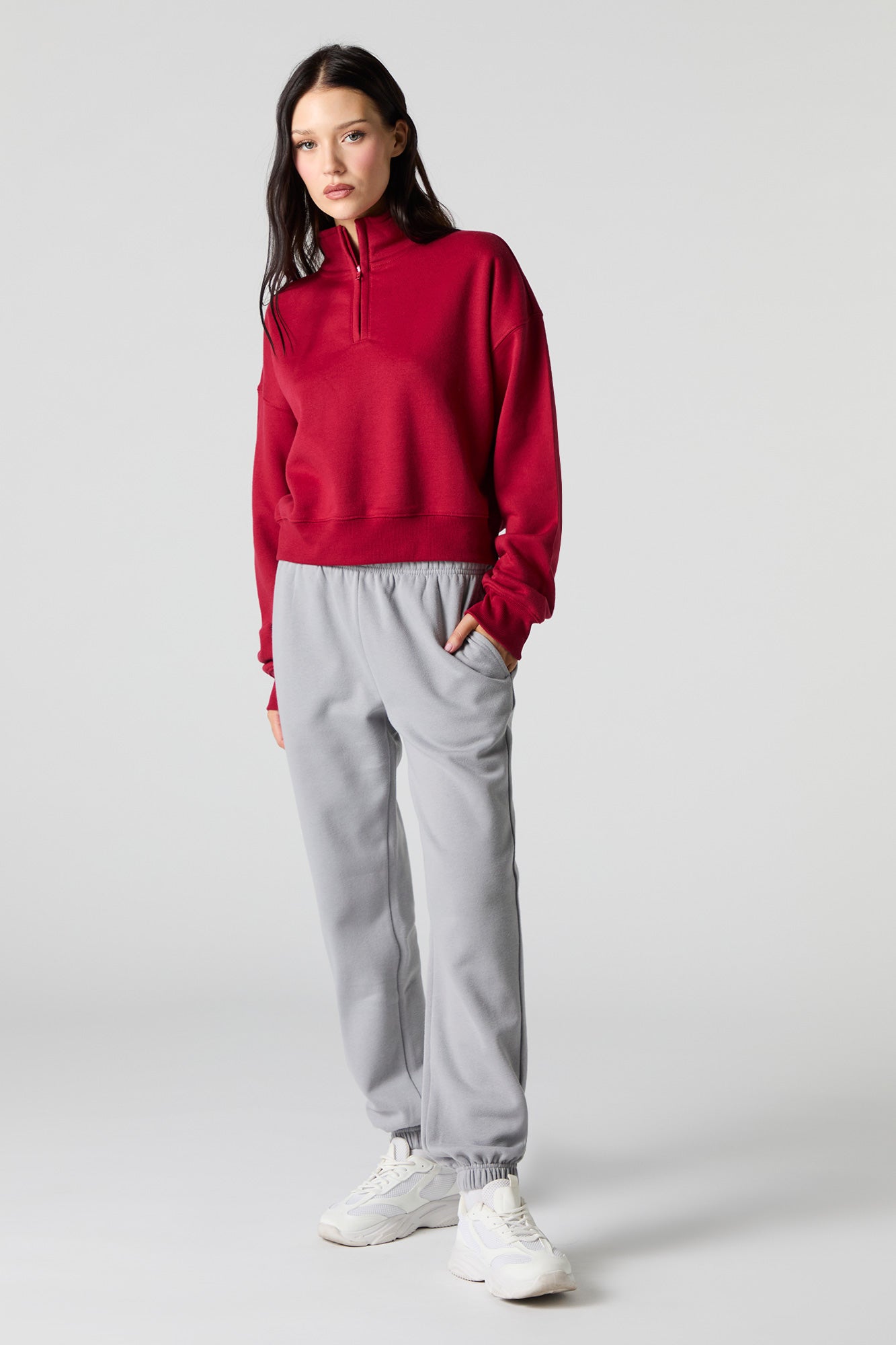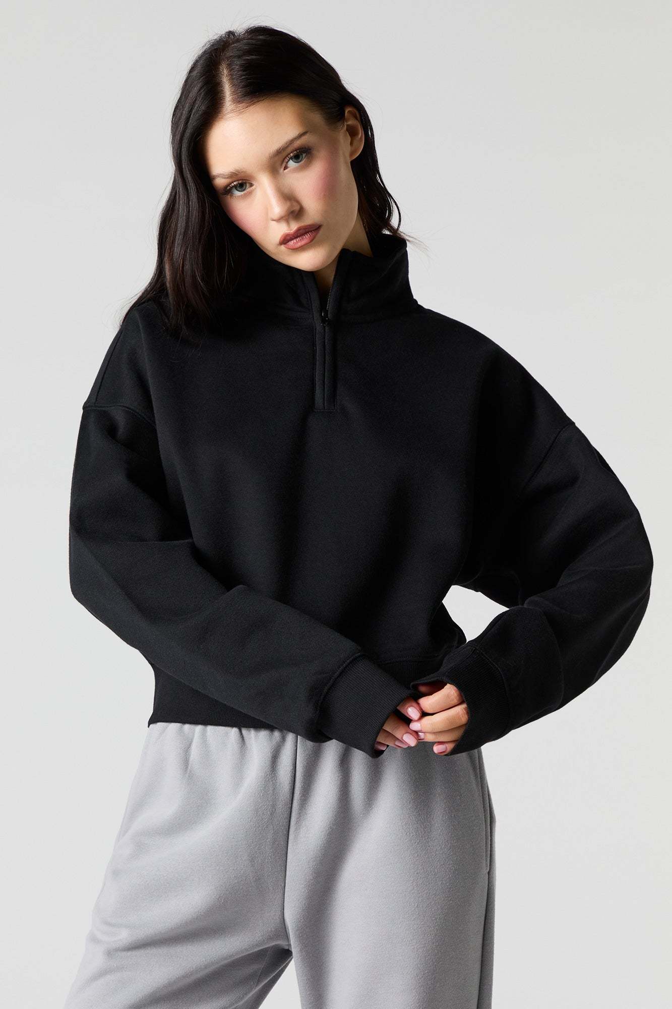 This sweatshirt features fleece material, quarter zip neckline, long sleeves, and ribbed knit trim.