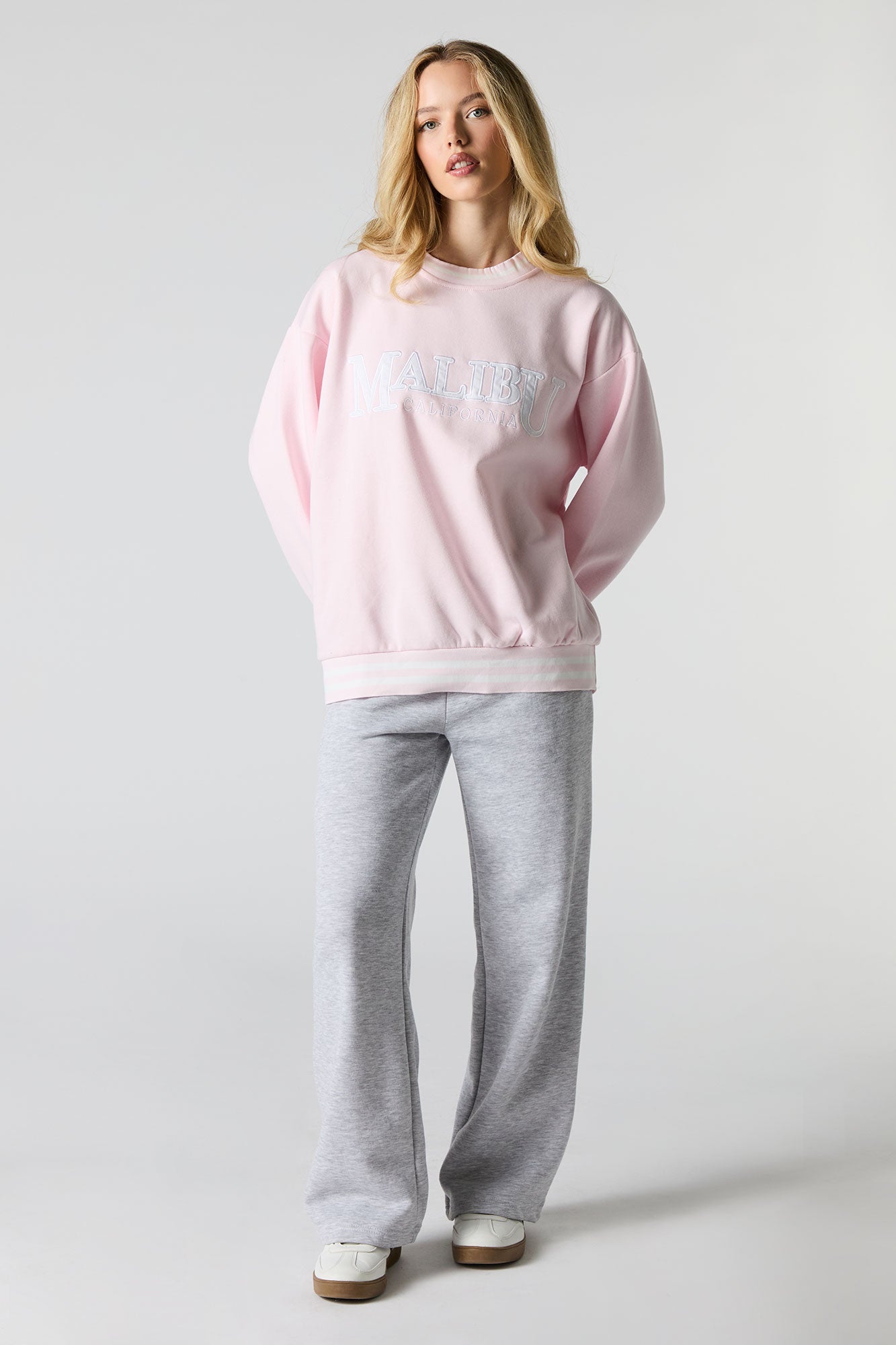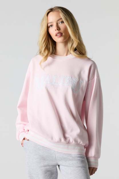 This sweatshirt features oversized fit, fleece material, twill embroidered front, crew neckline, long sleeves, and striped ribbed knit trim.