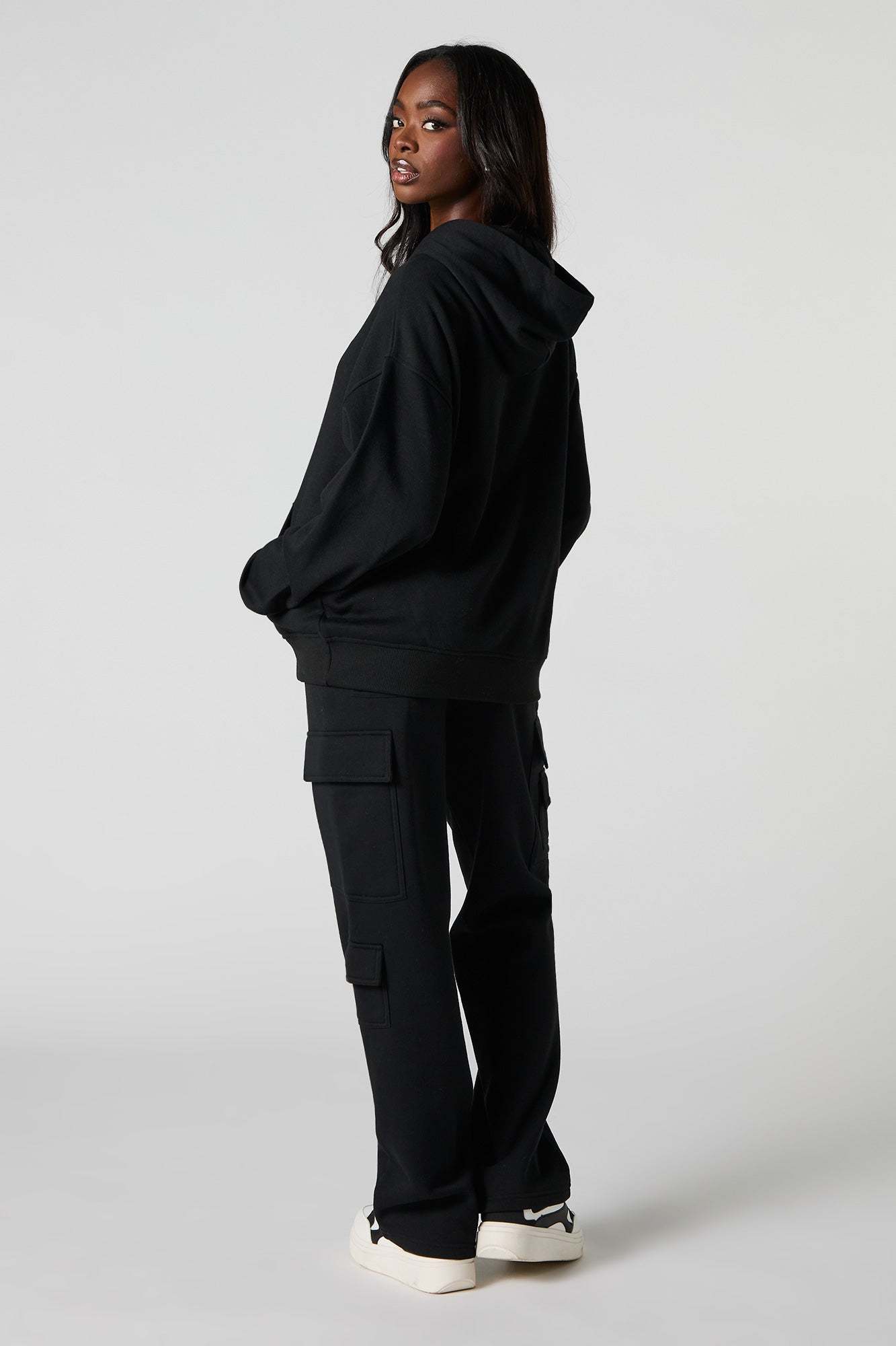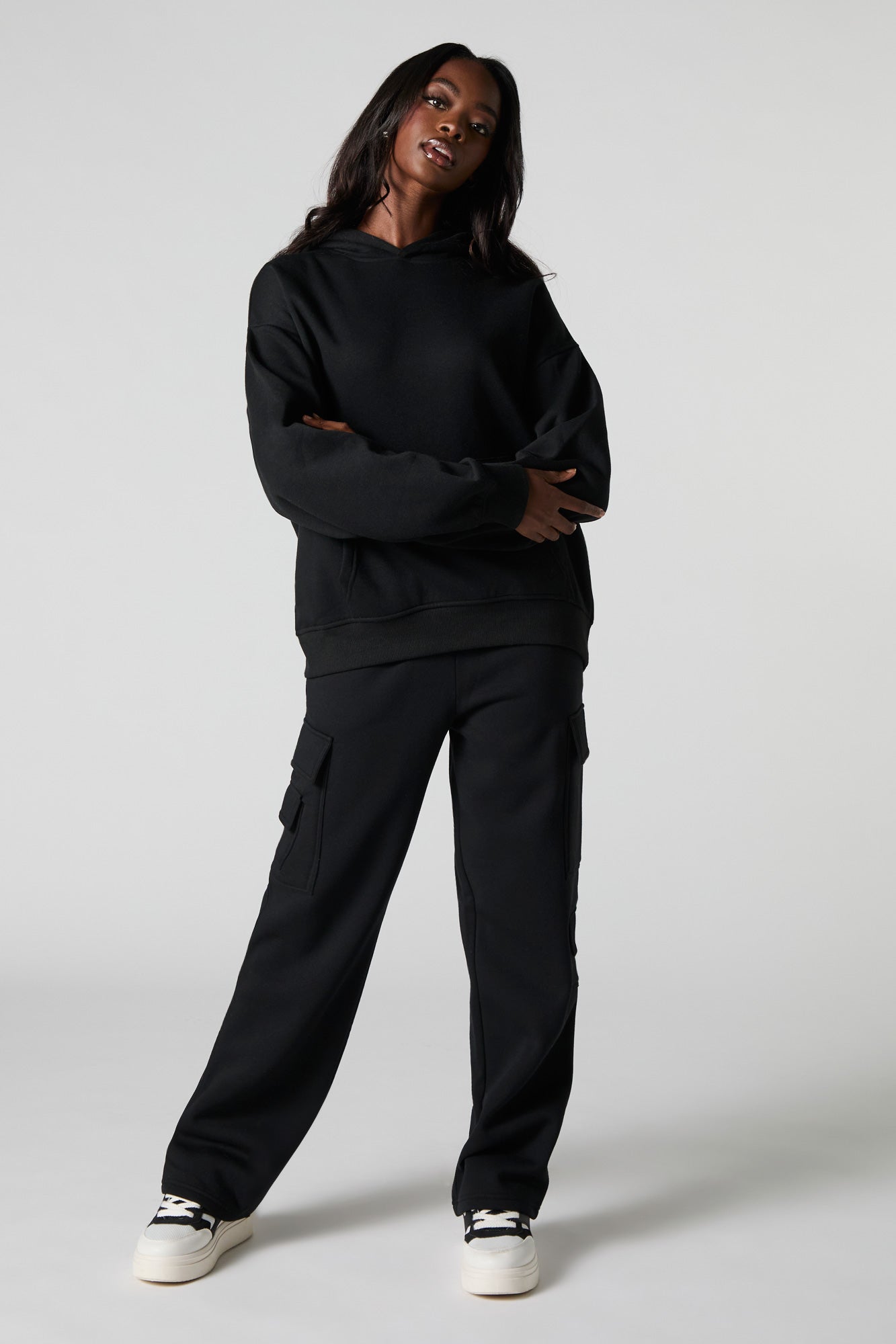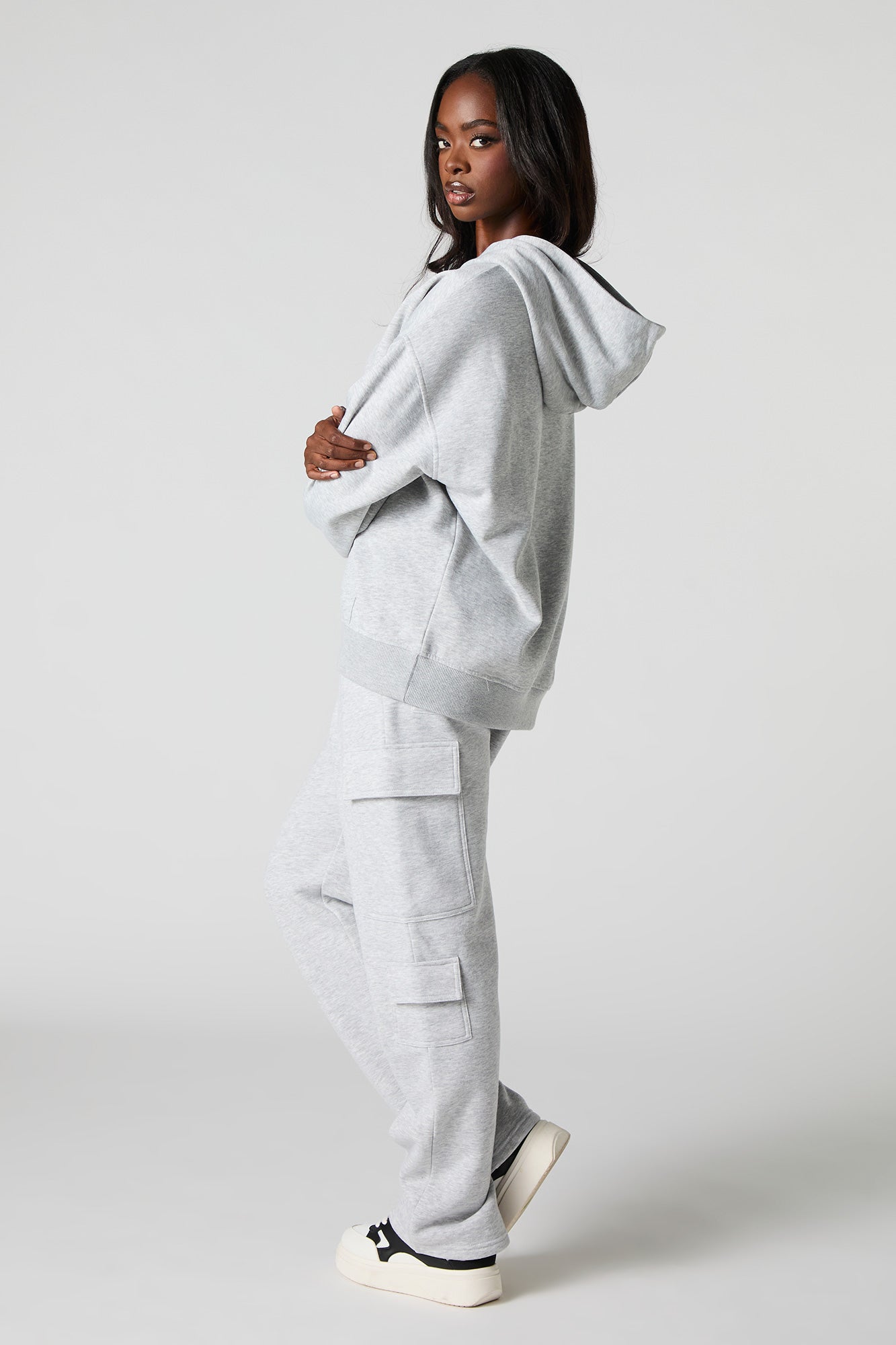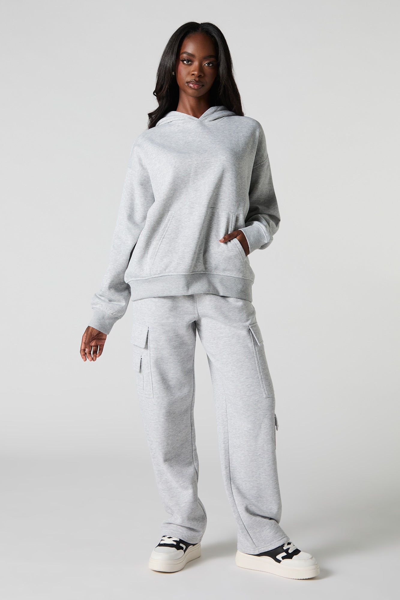 Comfort level: 100. This sweatpant features fleece material, elastic waist, slide-in pockets, cargo pockets, and straight leg. Pair with our to complete the look.