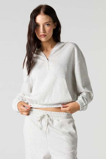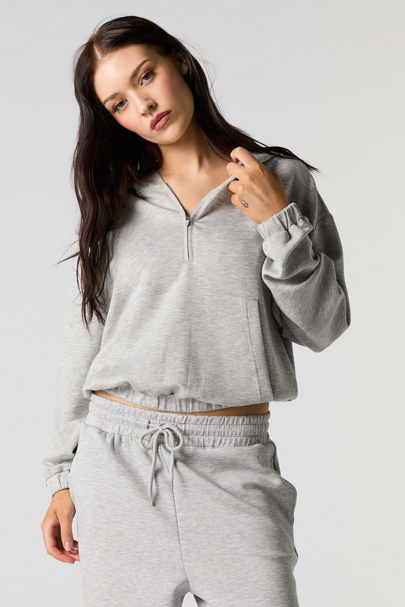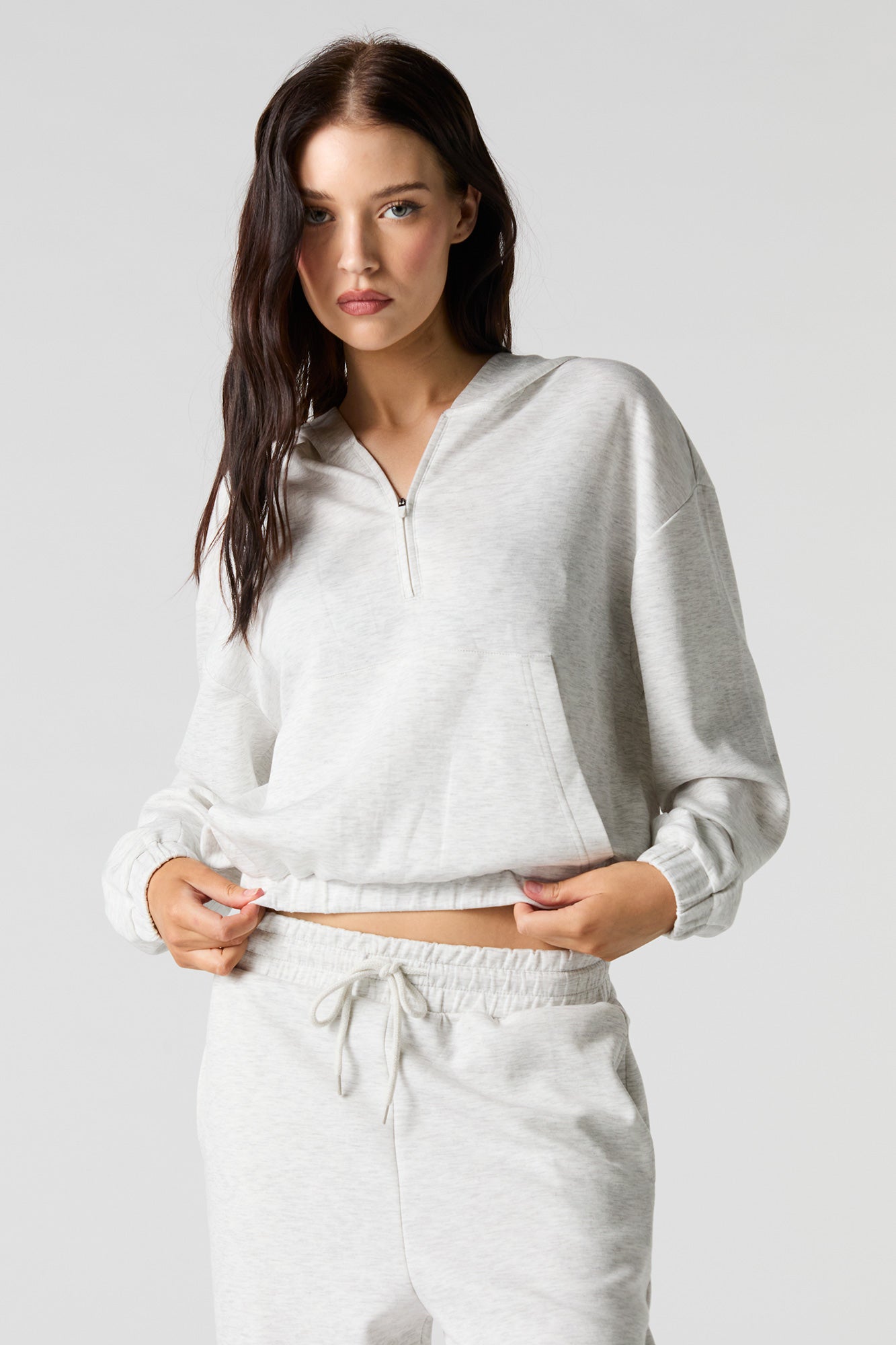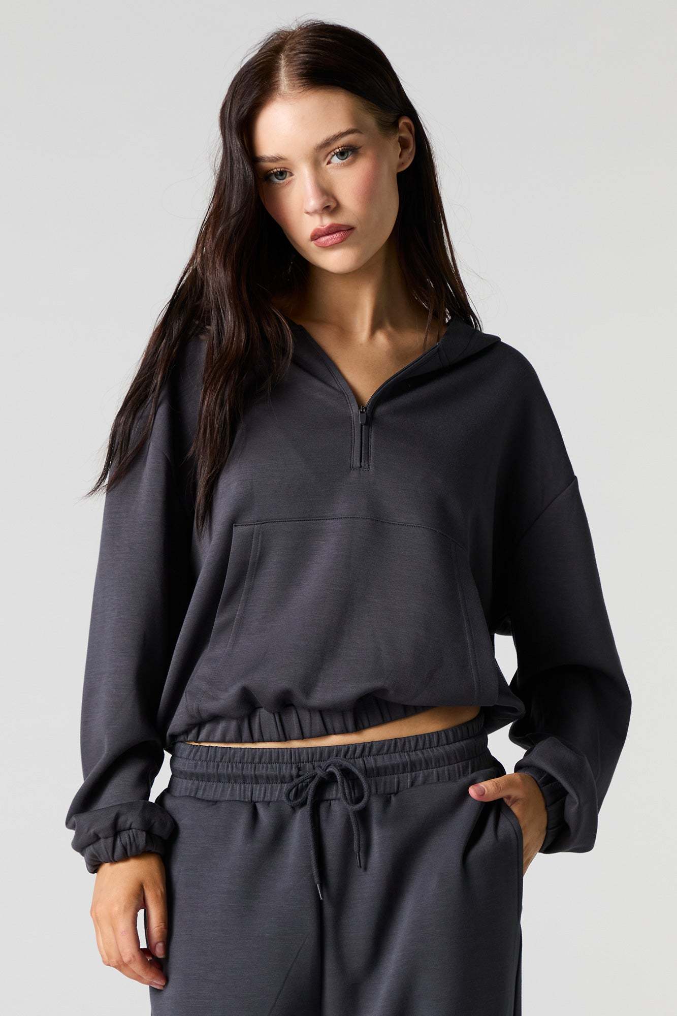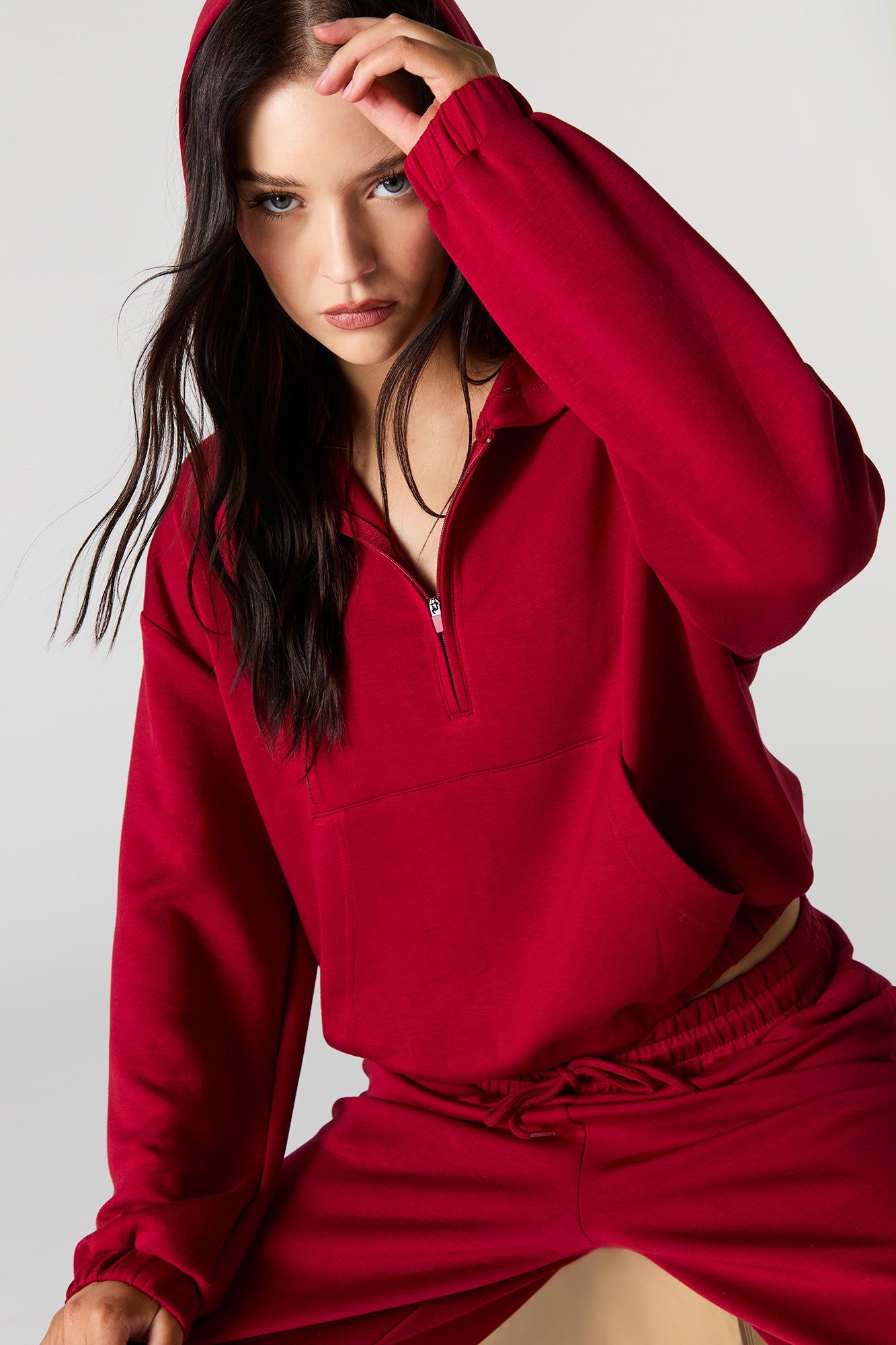 This active hoodie features fleece material, quarter zip neckline , hood, kangaroo pocket, long sleeves, and cinched hem. Pair with our to complete the look.