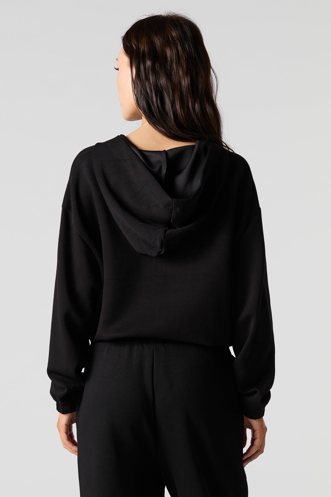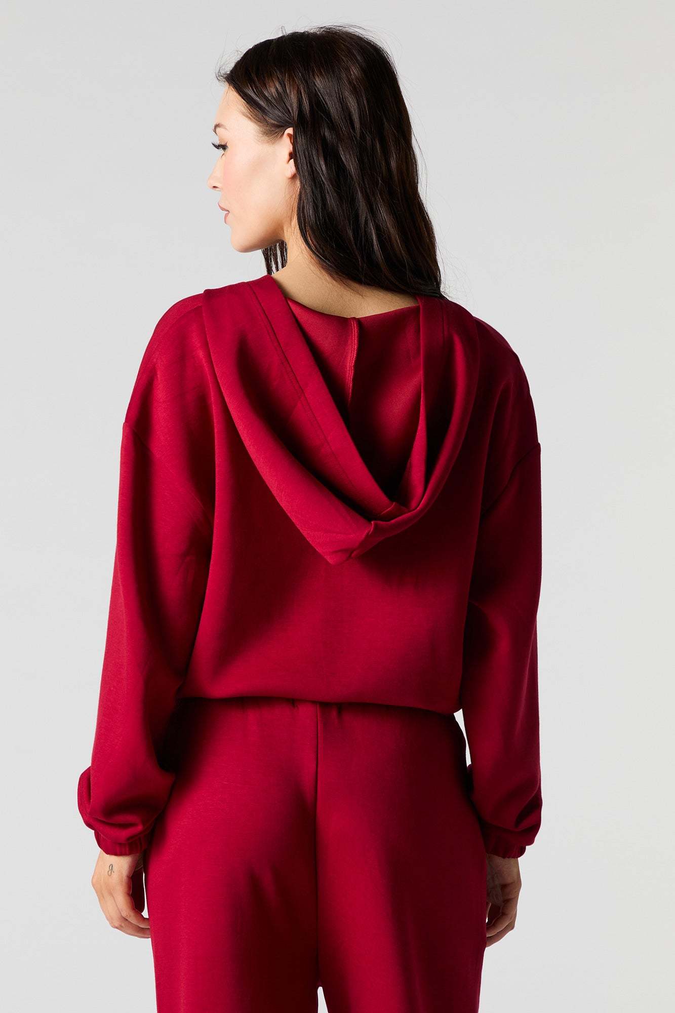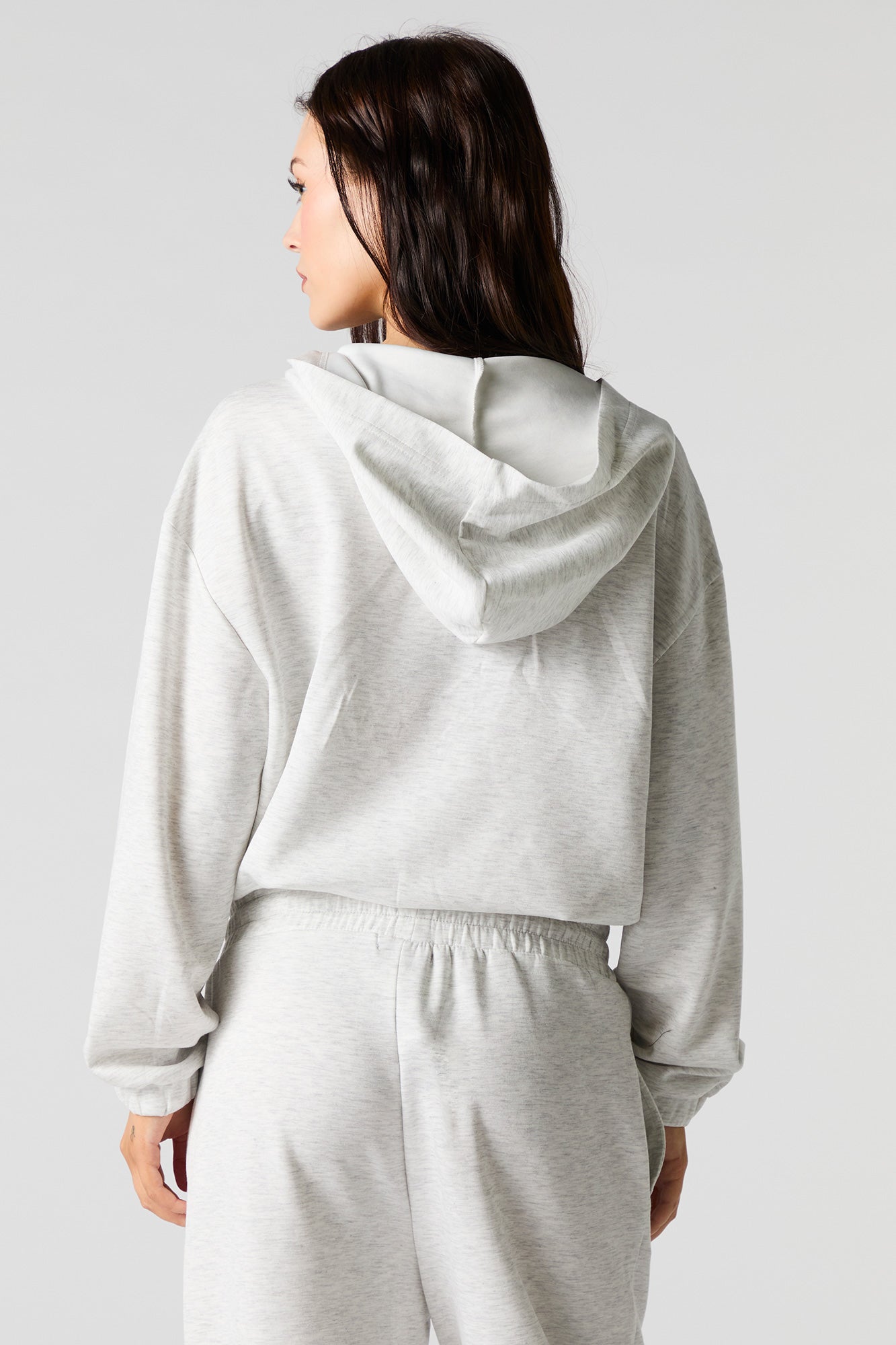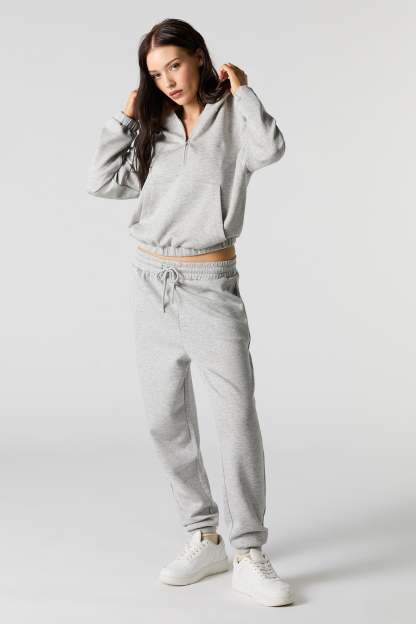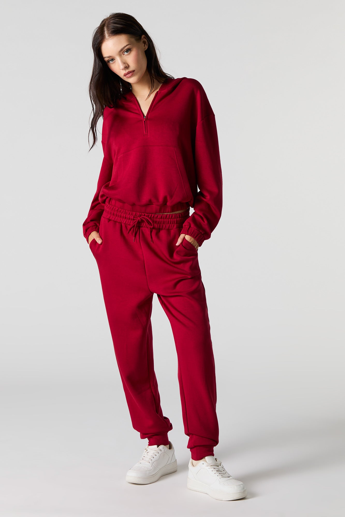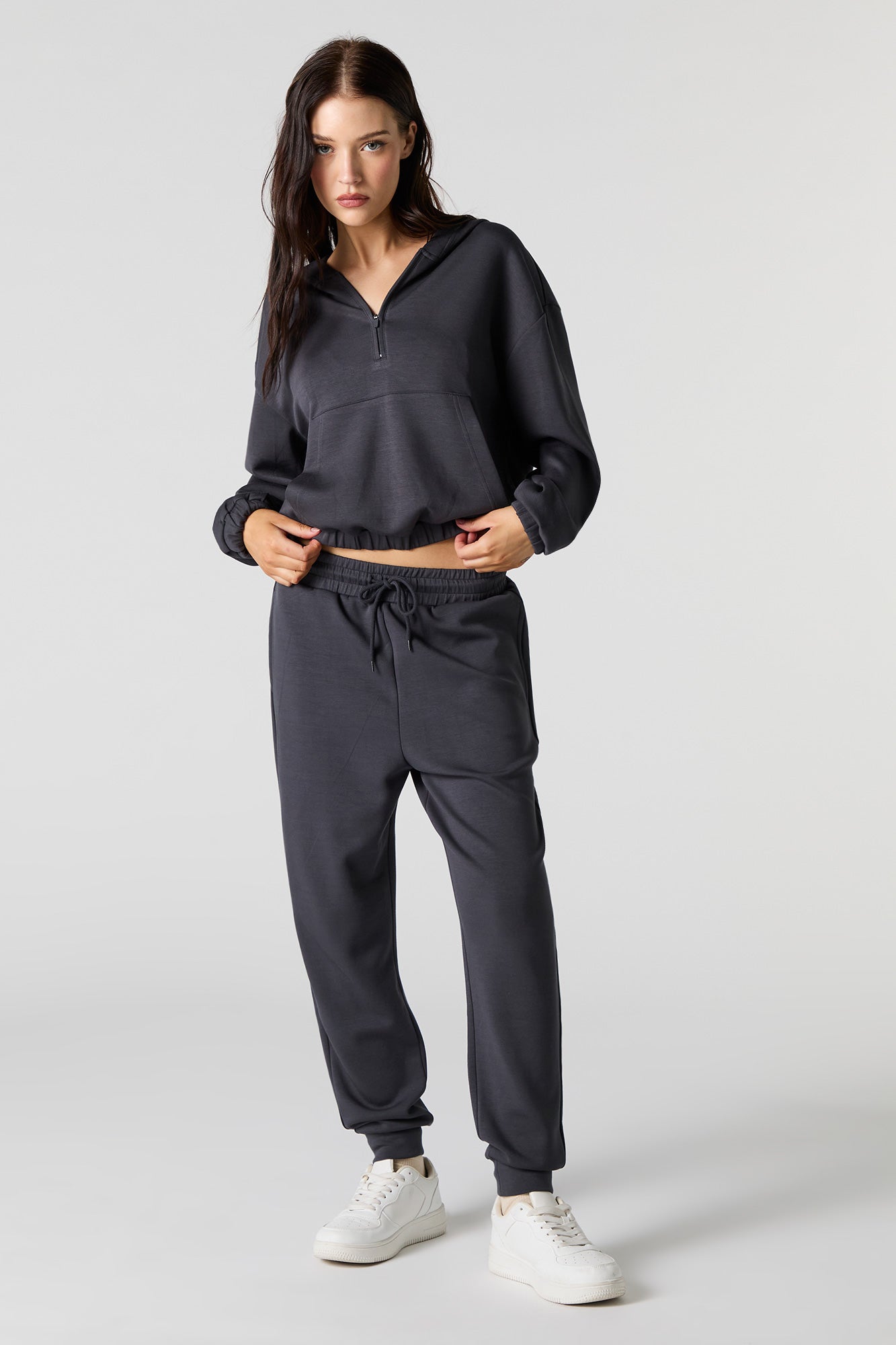 This active hoodie features fleece material, quarter zip neckline , hood, kangaroo pocket, long sleeves, and cinched hem. Pair with our to complete the look.