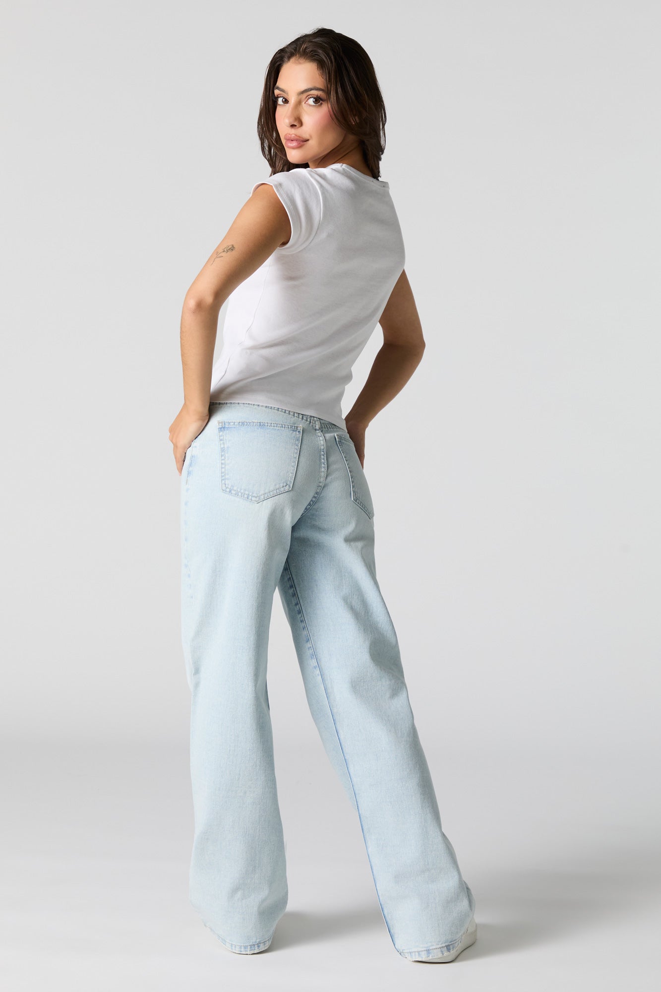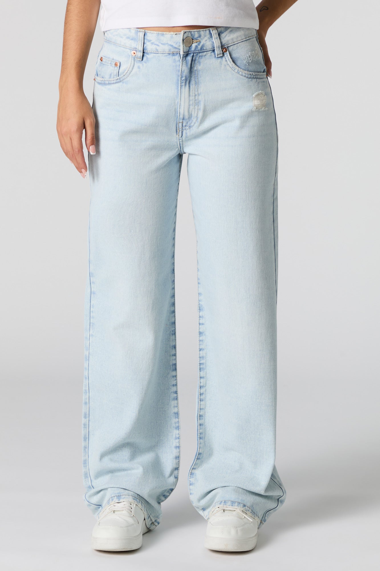 This jean features lightly distressed denim material, high-rise waist, zip-fly button-up closure, 5 pockets, belt loops, and wide leg.