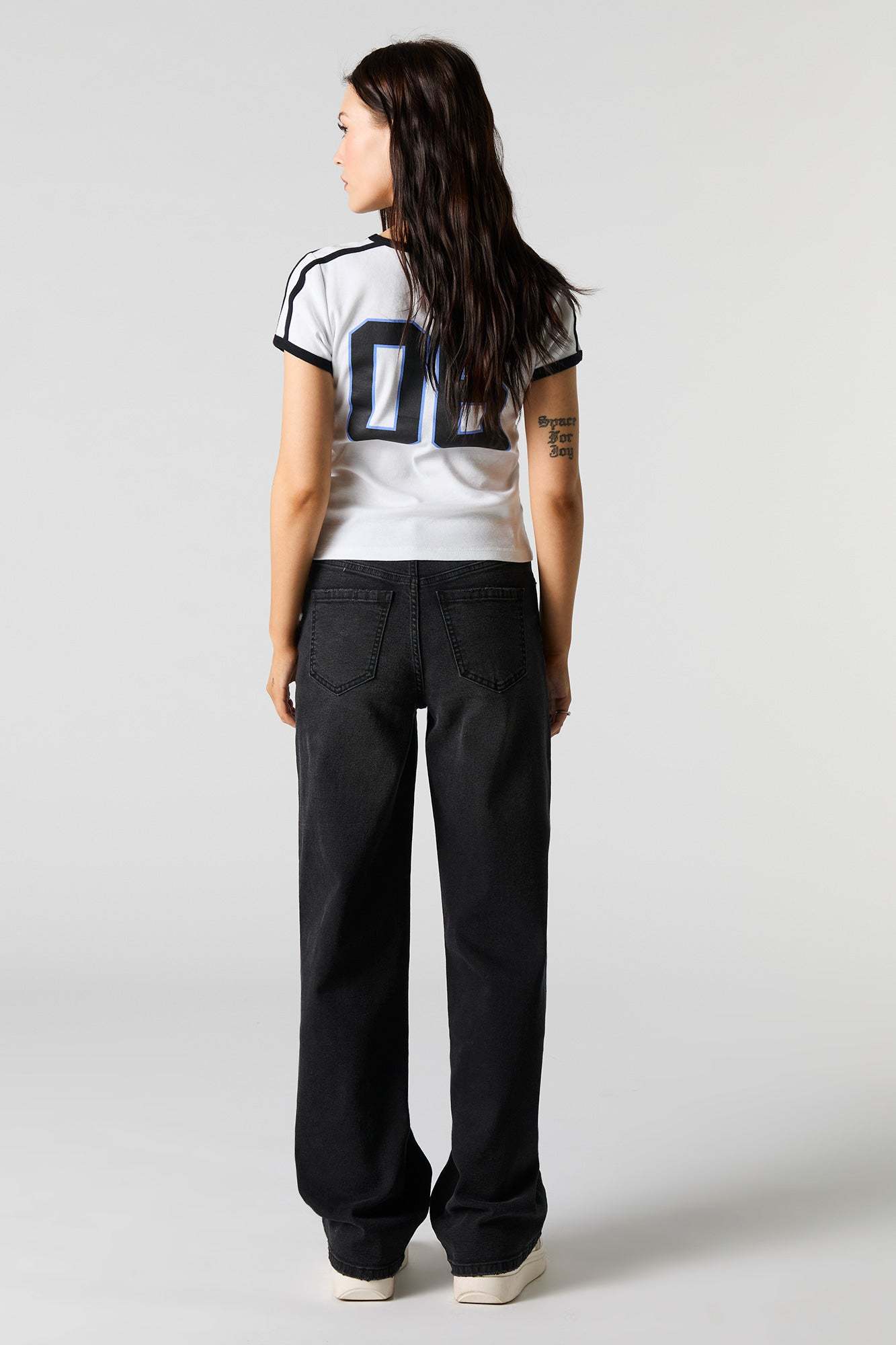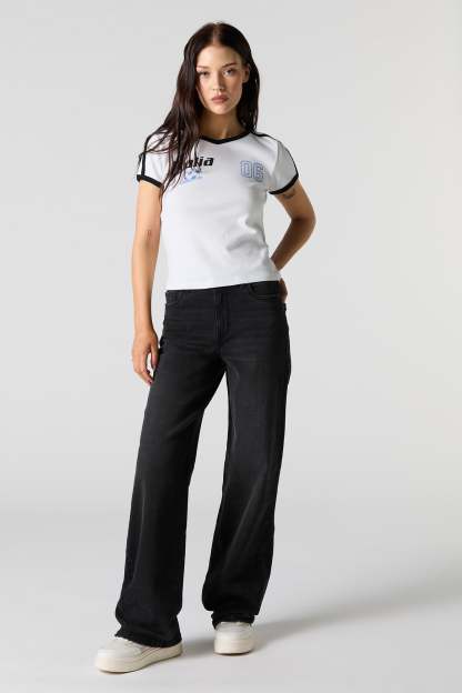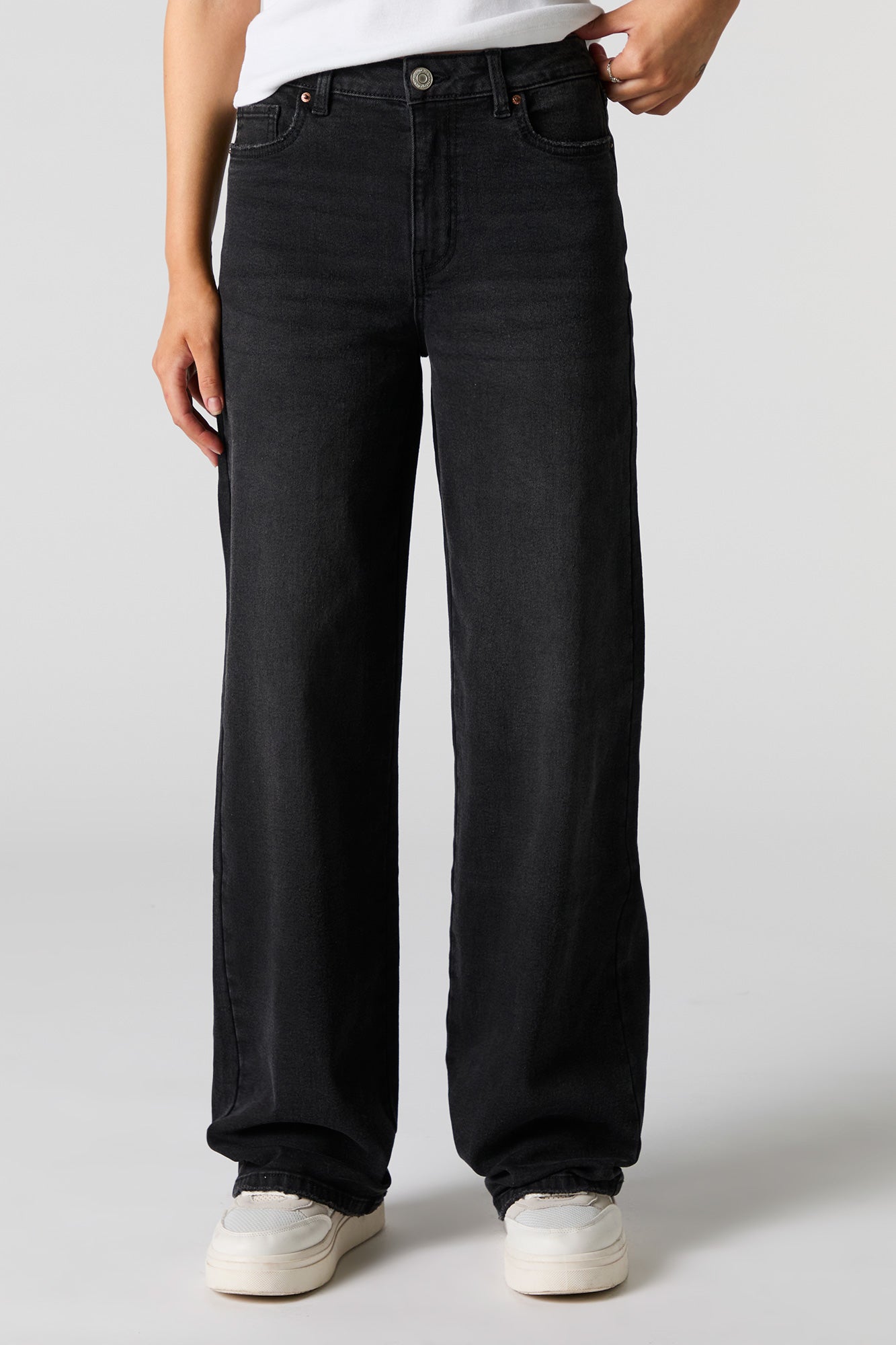 This jean features stretchy denim material, 5 pockets, zip-fly button-up closure, belt loops, and wide leg.