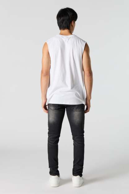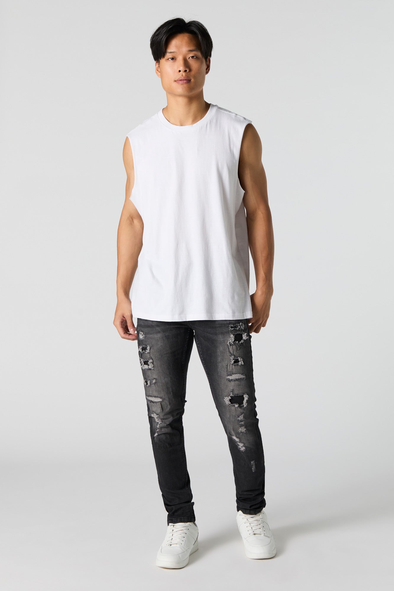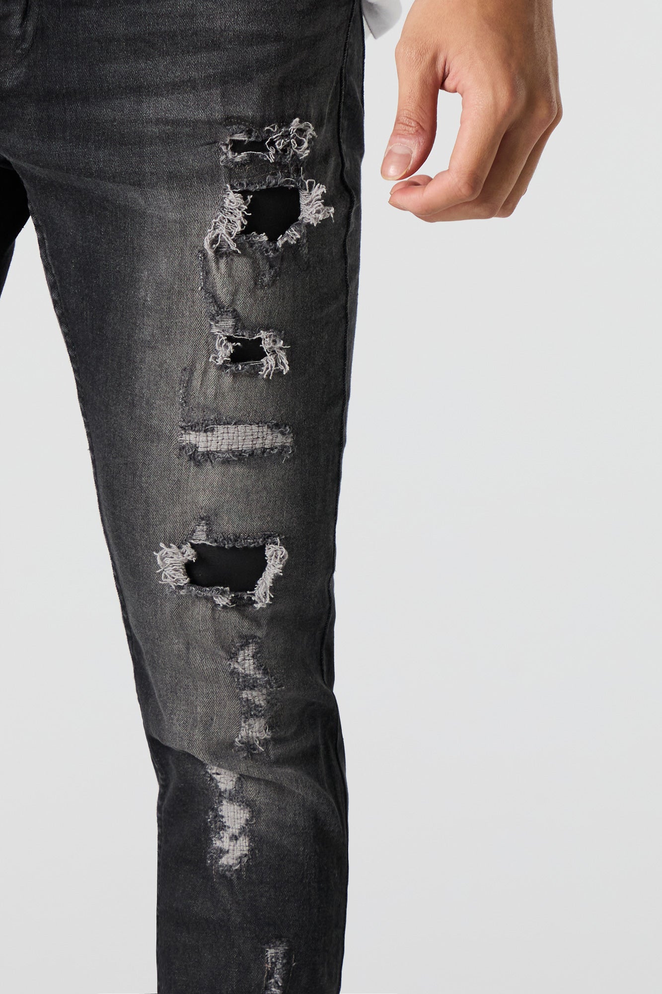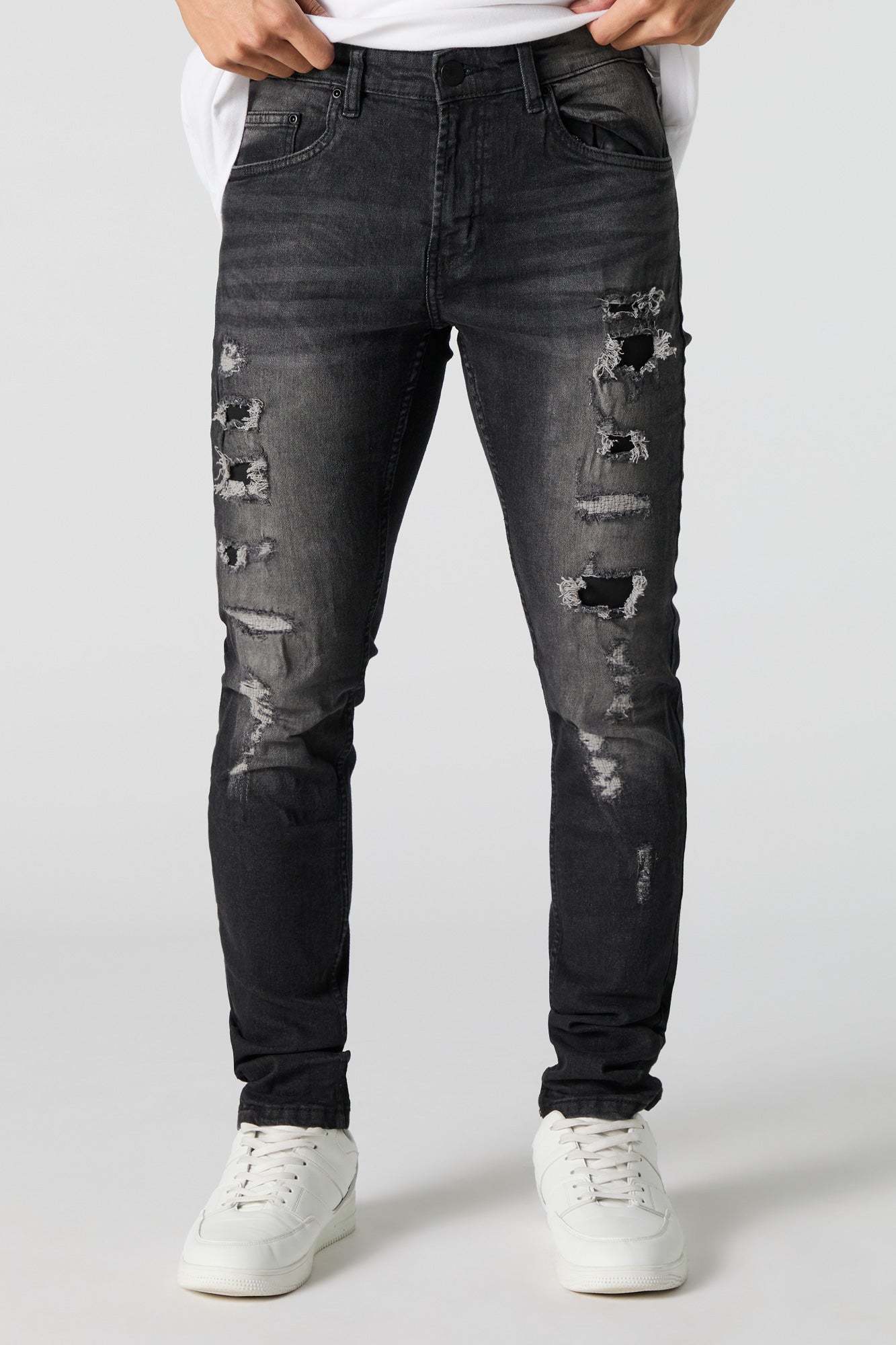 This jean features distressed denim material, zip-fly button-up closure, 5 pockets, belt loops, and skinny leg.