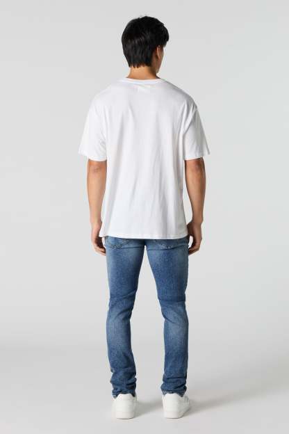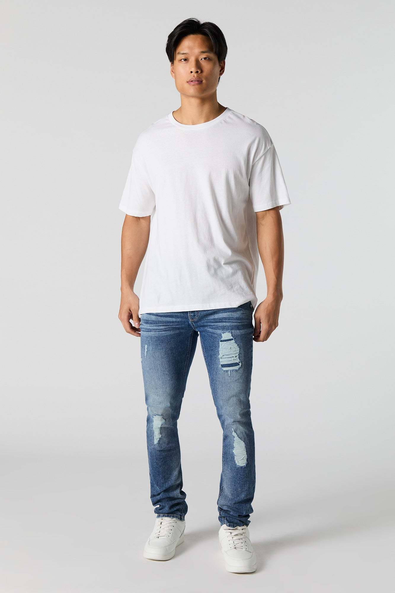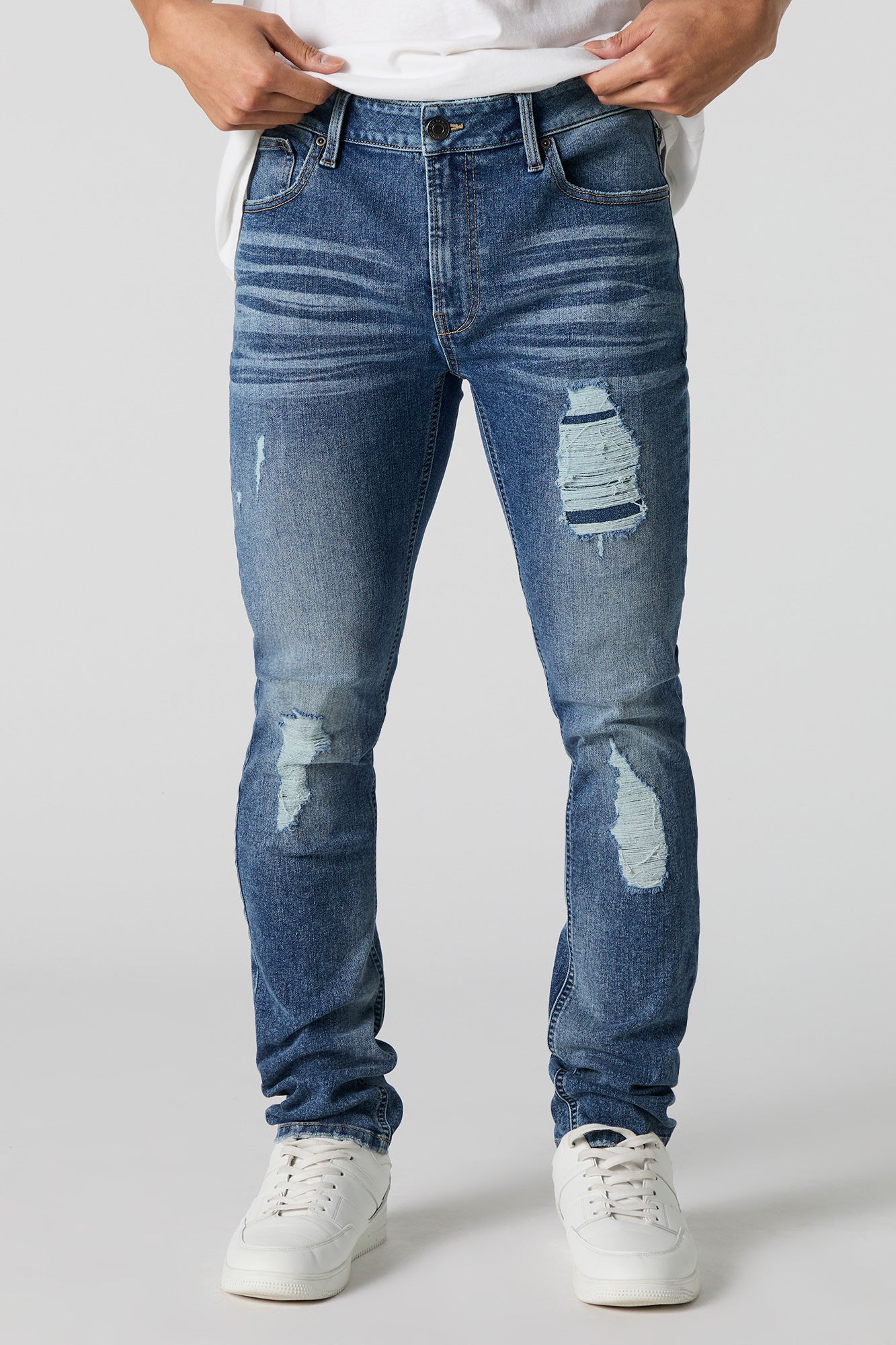 This jean features distressed denim material, zip-fly button-up closure, 5 pockets, belt loops, and slim fit.
