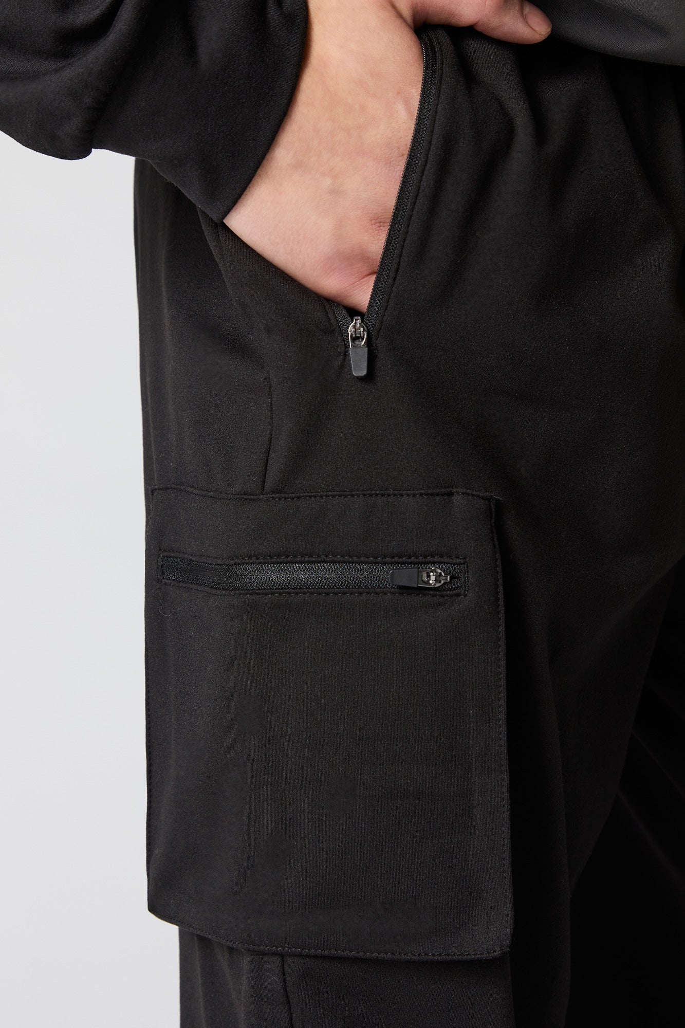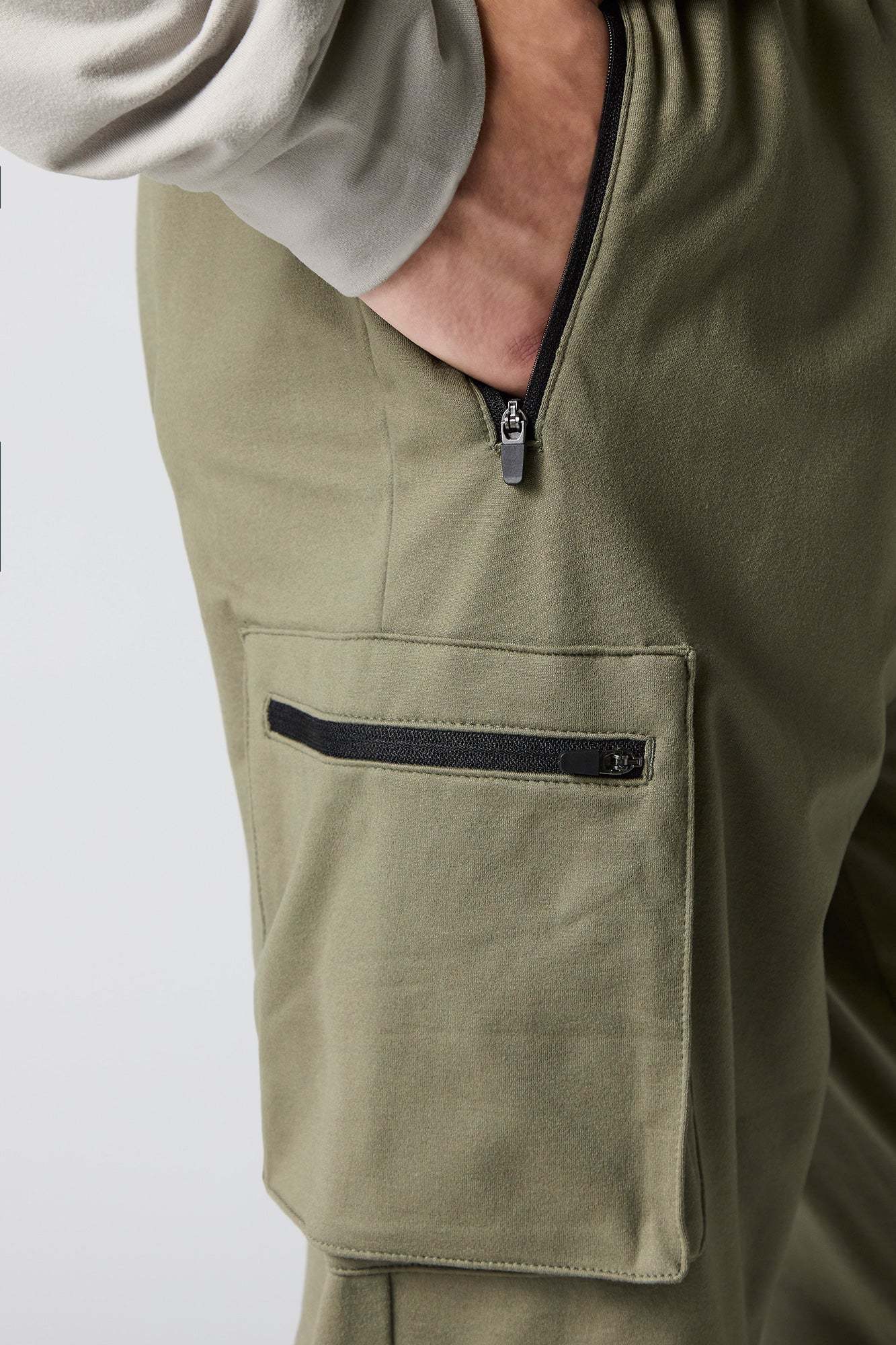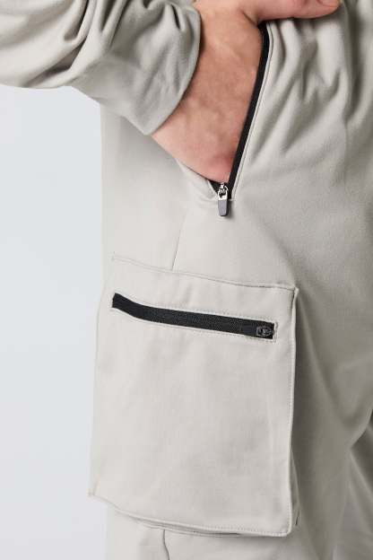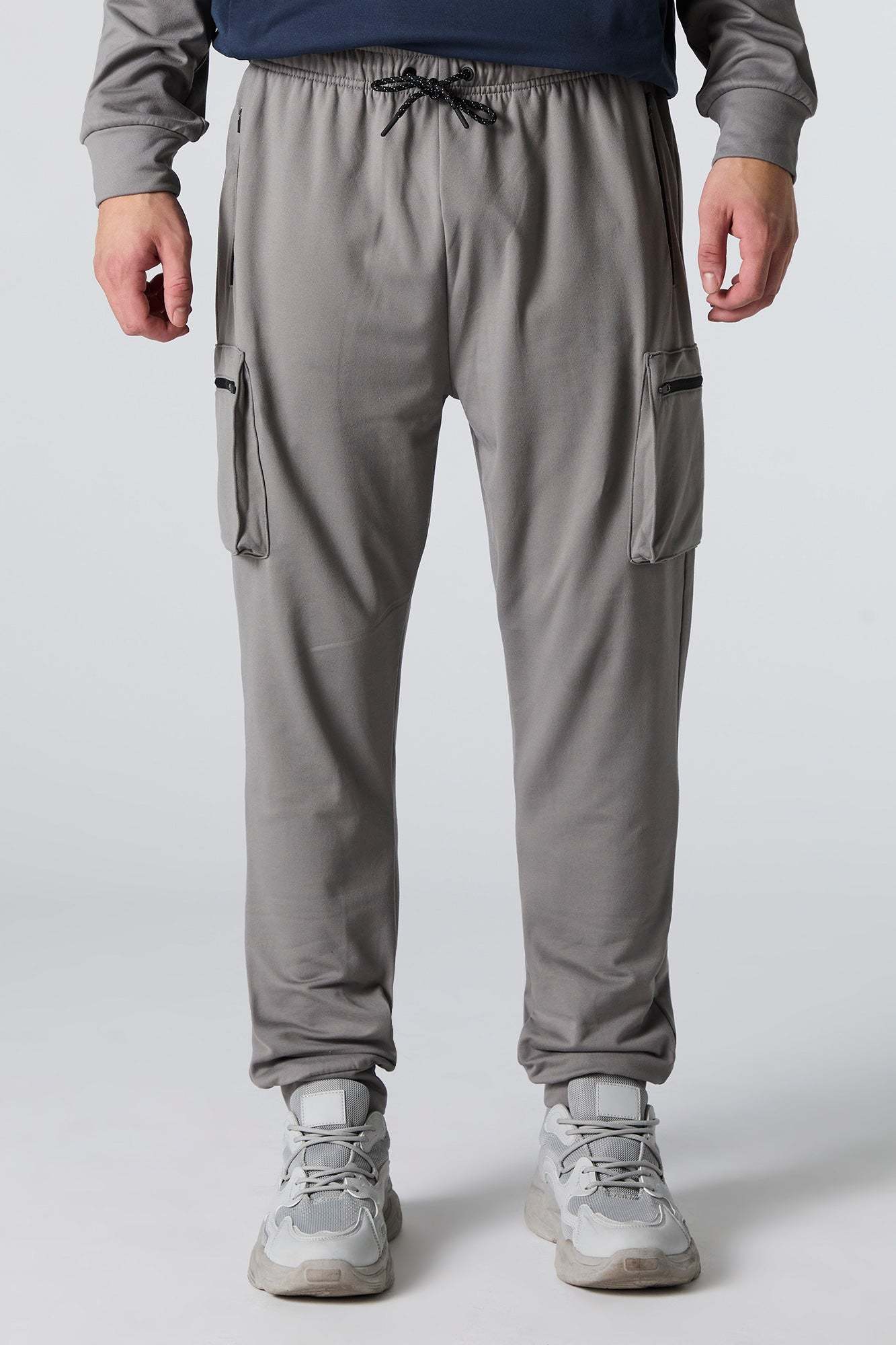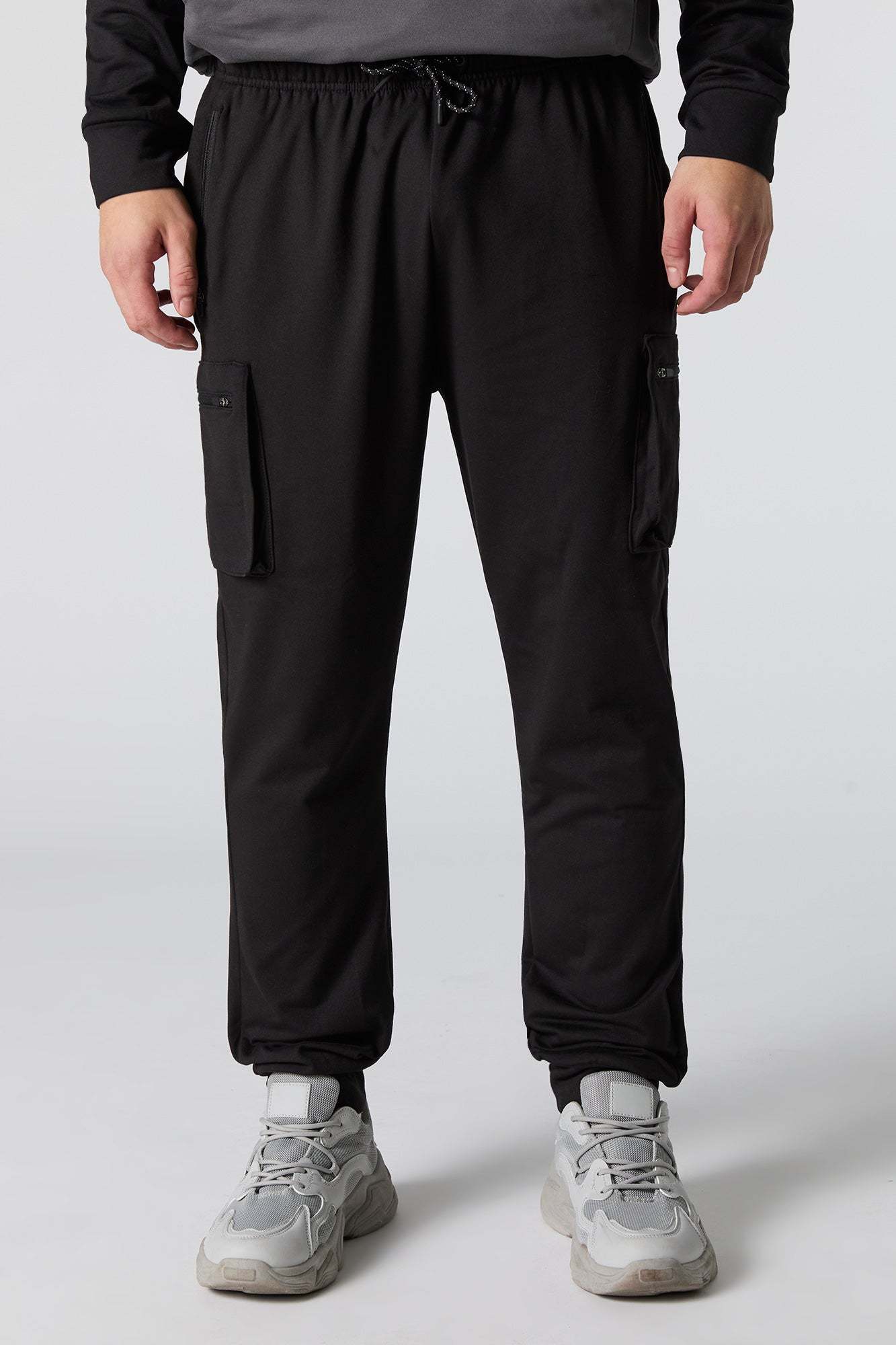 This active jogger features soft material, drawstring waist, zipper pockets, cargo pockets, and cinched ankles.