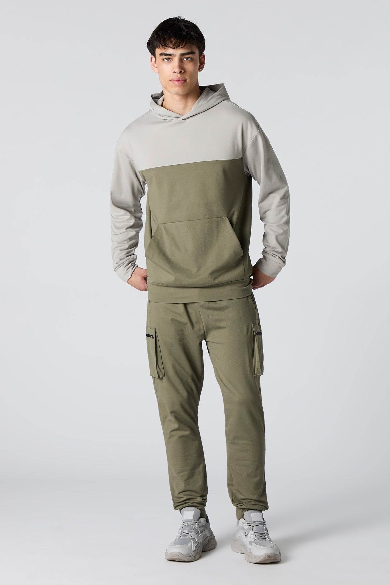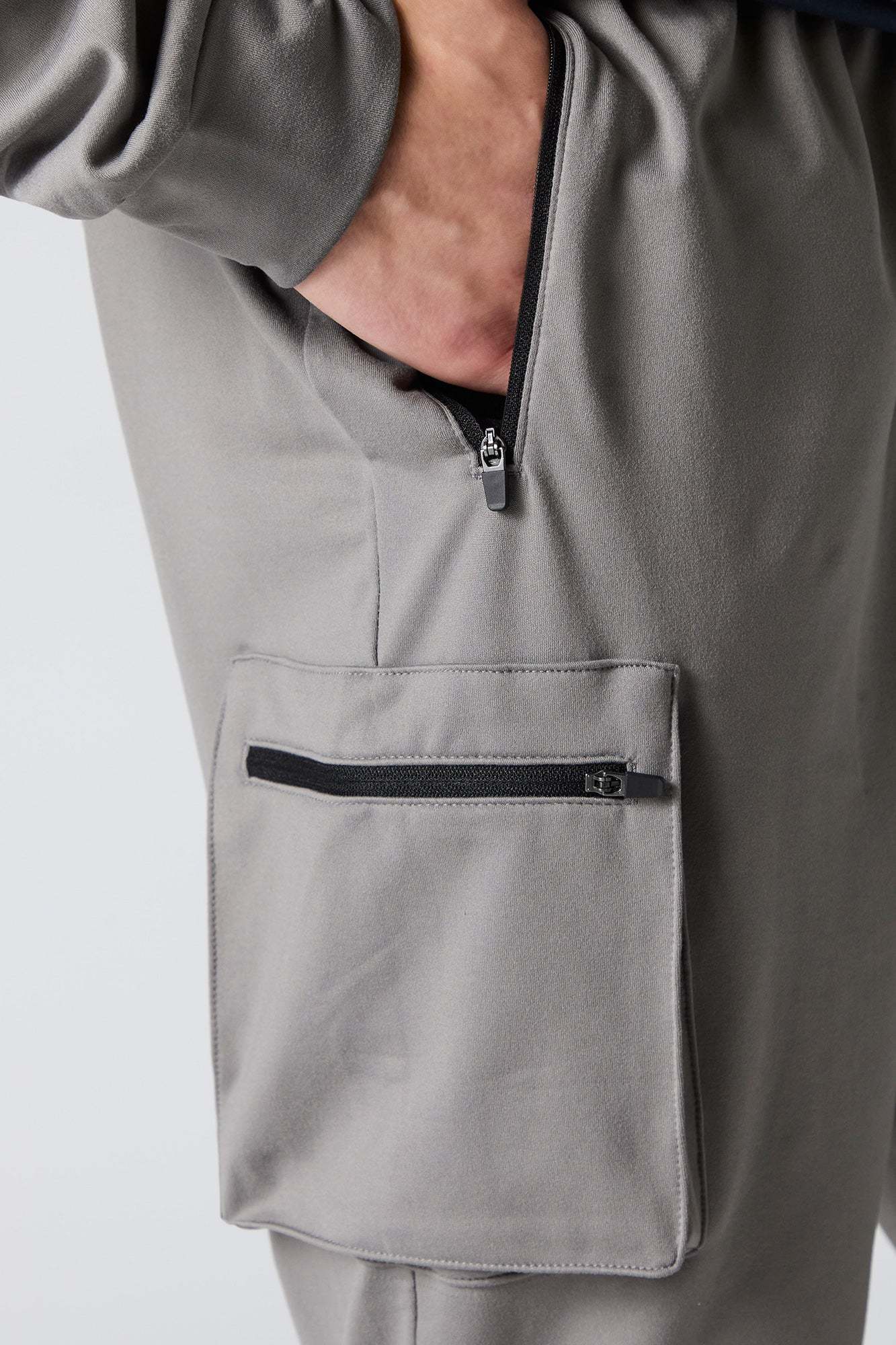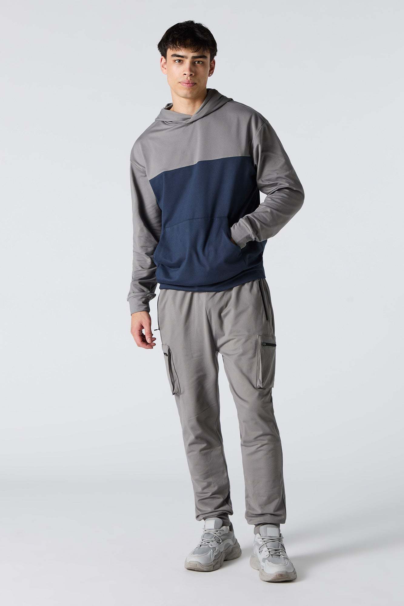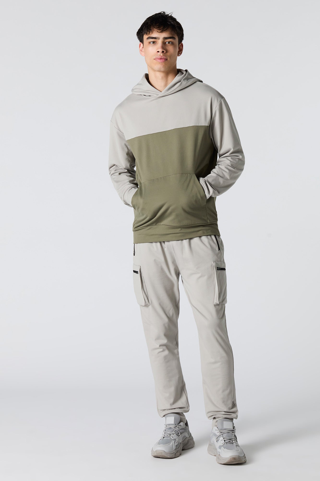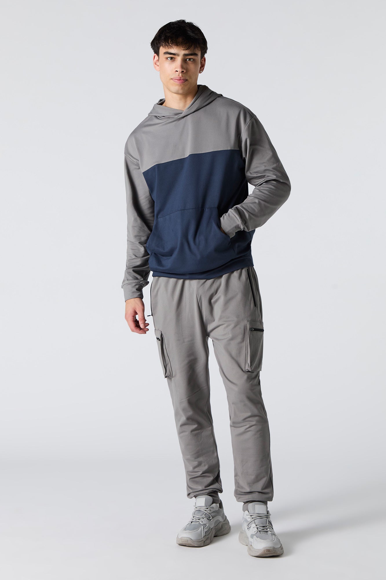 This active jogger features soft material, drawstring waist, zipper pockets, cargo pockets, and cinched ankles.
