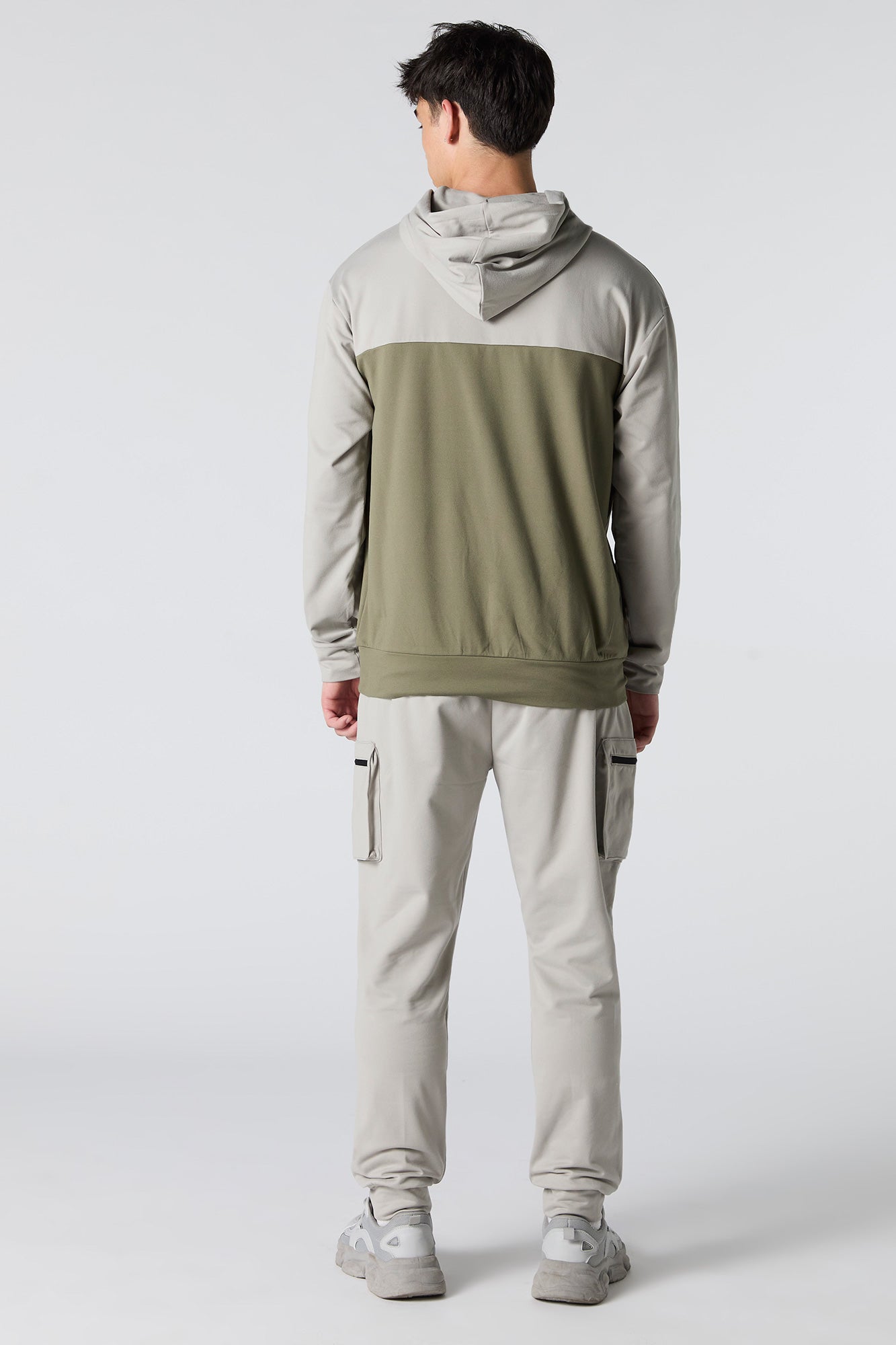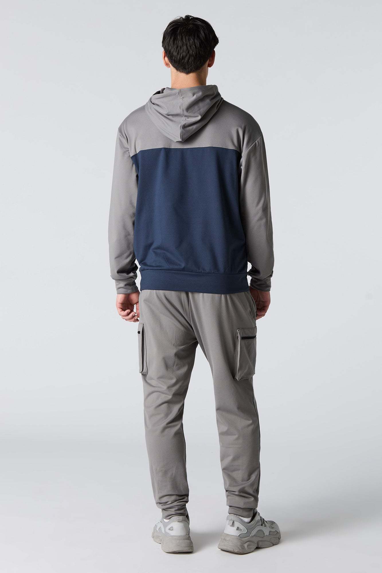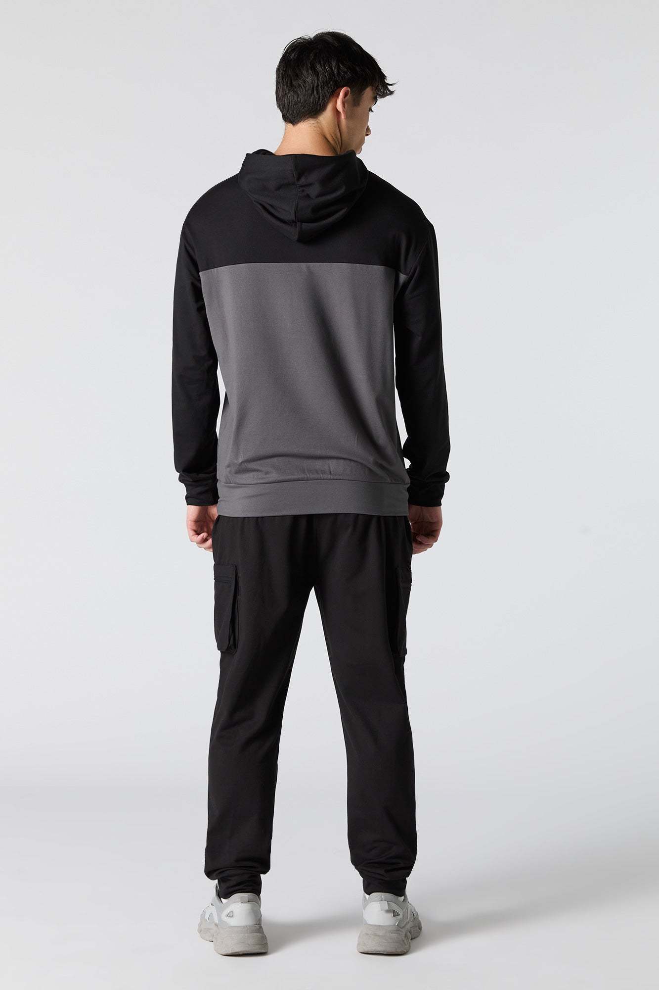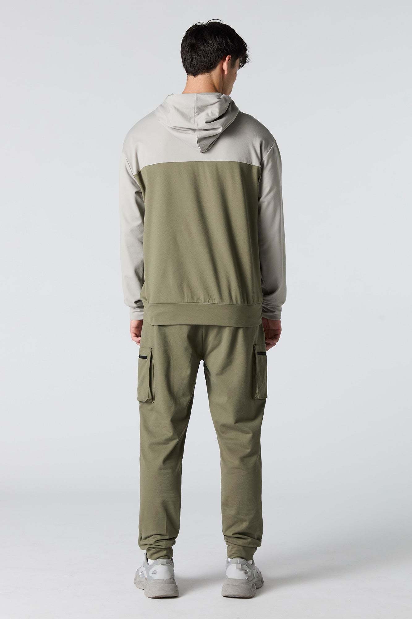 This active jogger features soft material, drawstring waist, zipper pockets, cargo pockets, and cinched ankles.