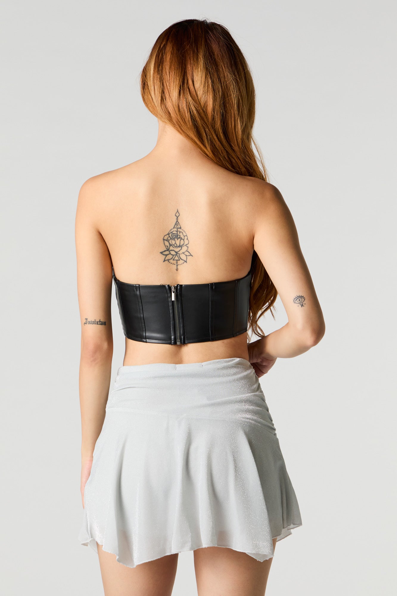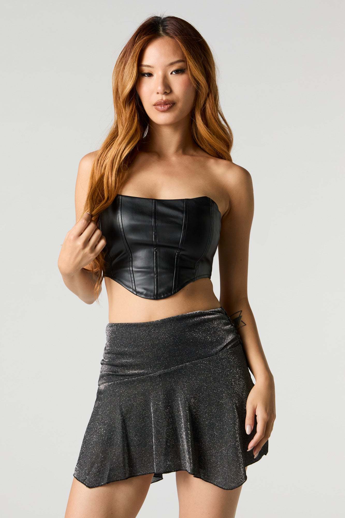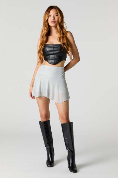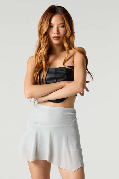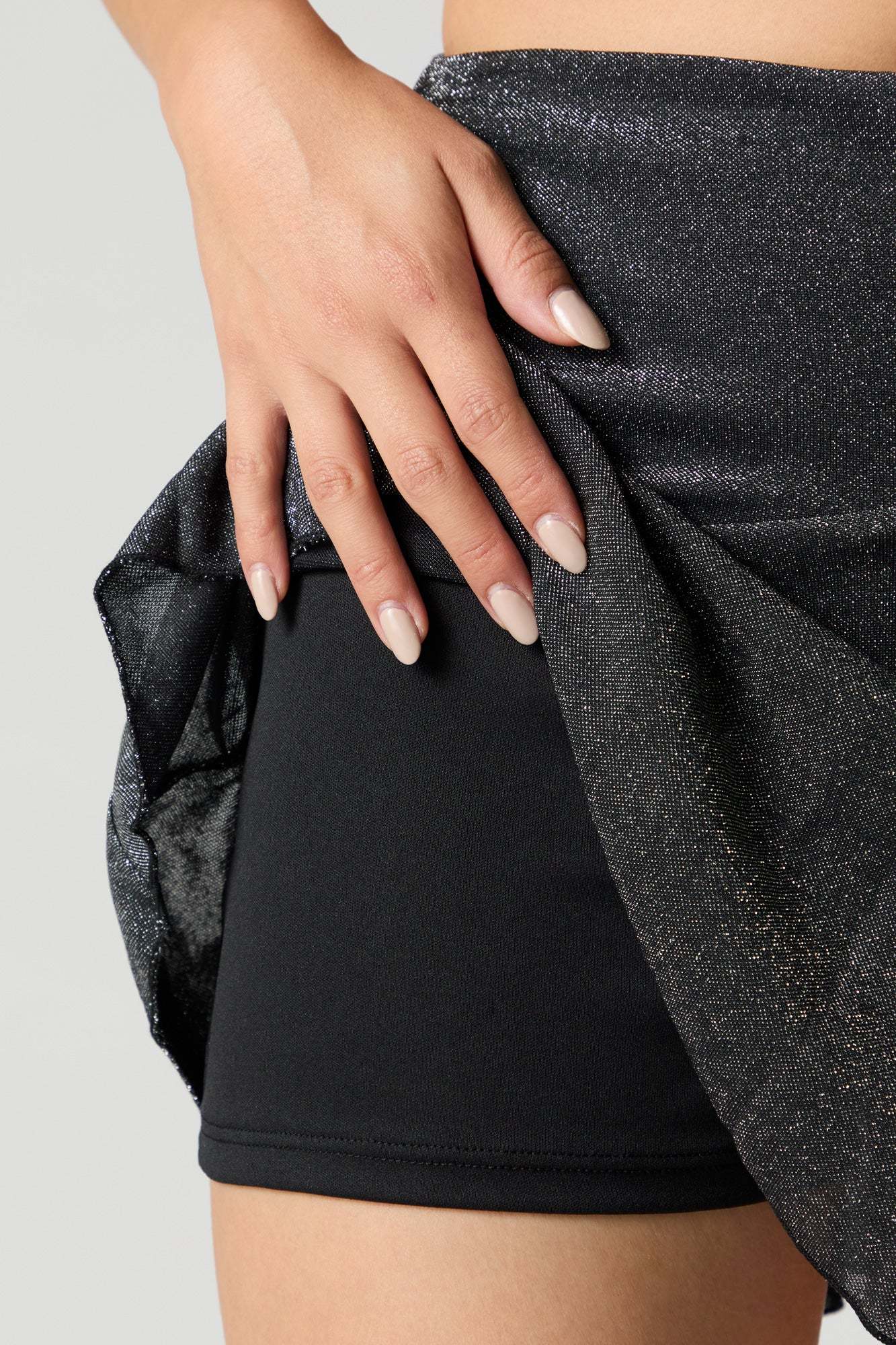 This skort features sparkle finish, elastic waist, asymmetrical design, built-in short, and mini length.