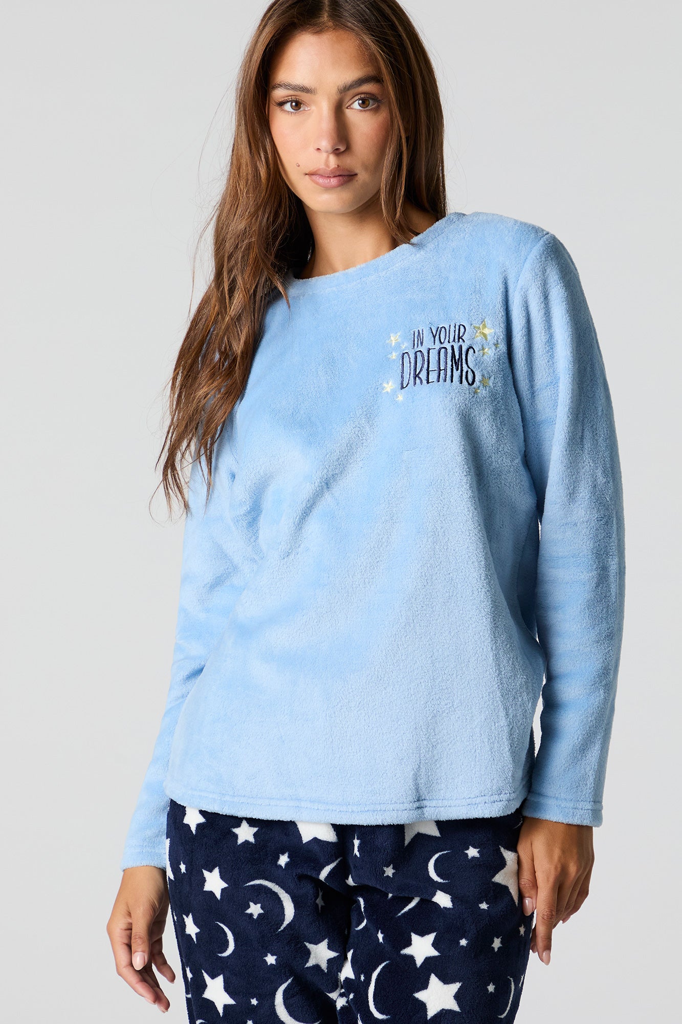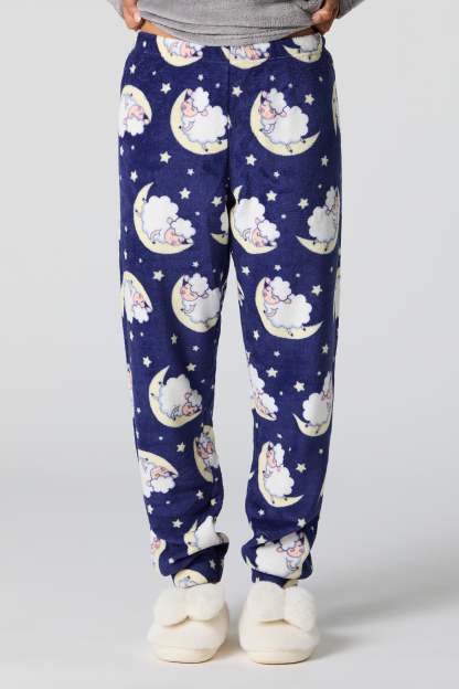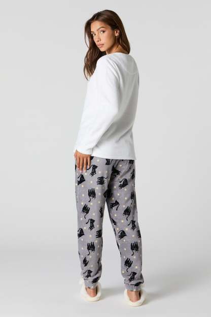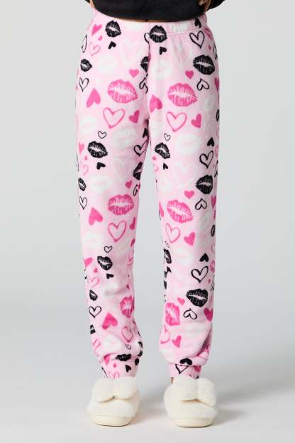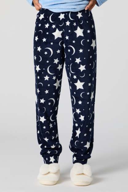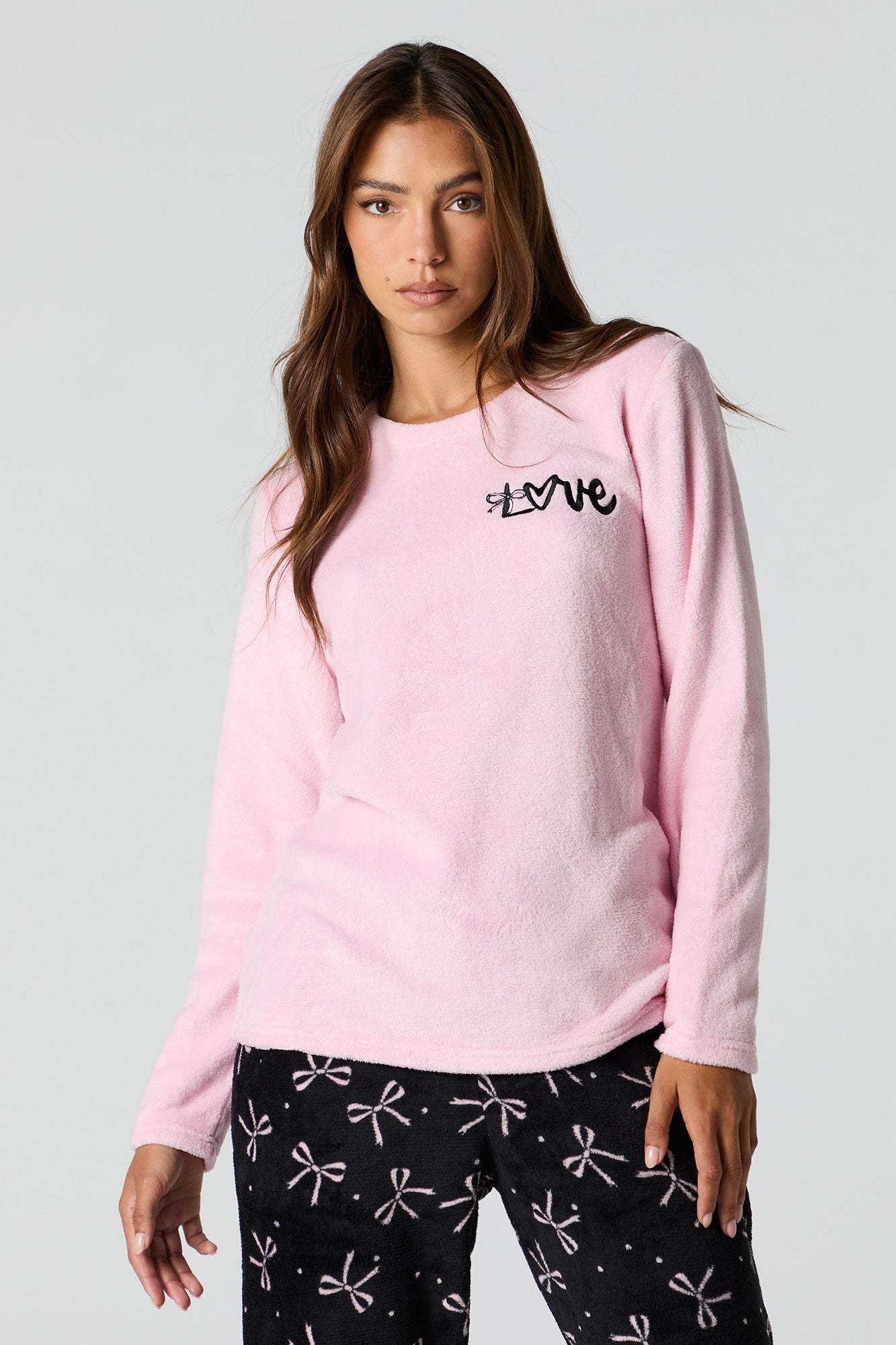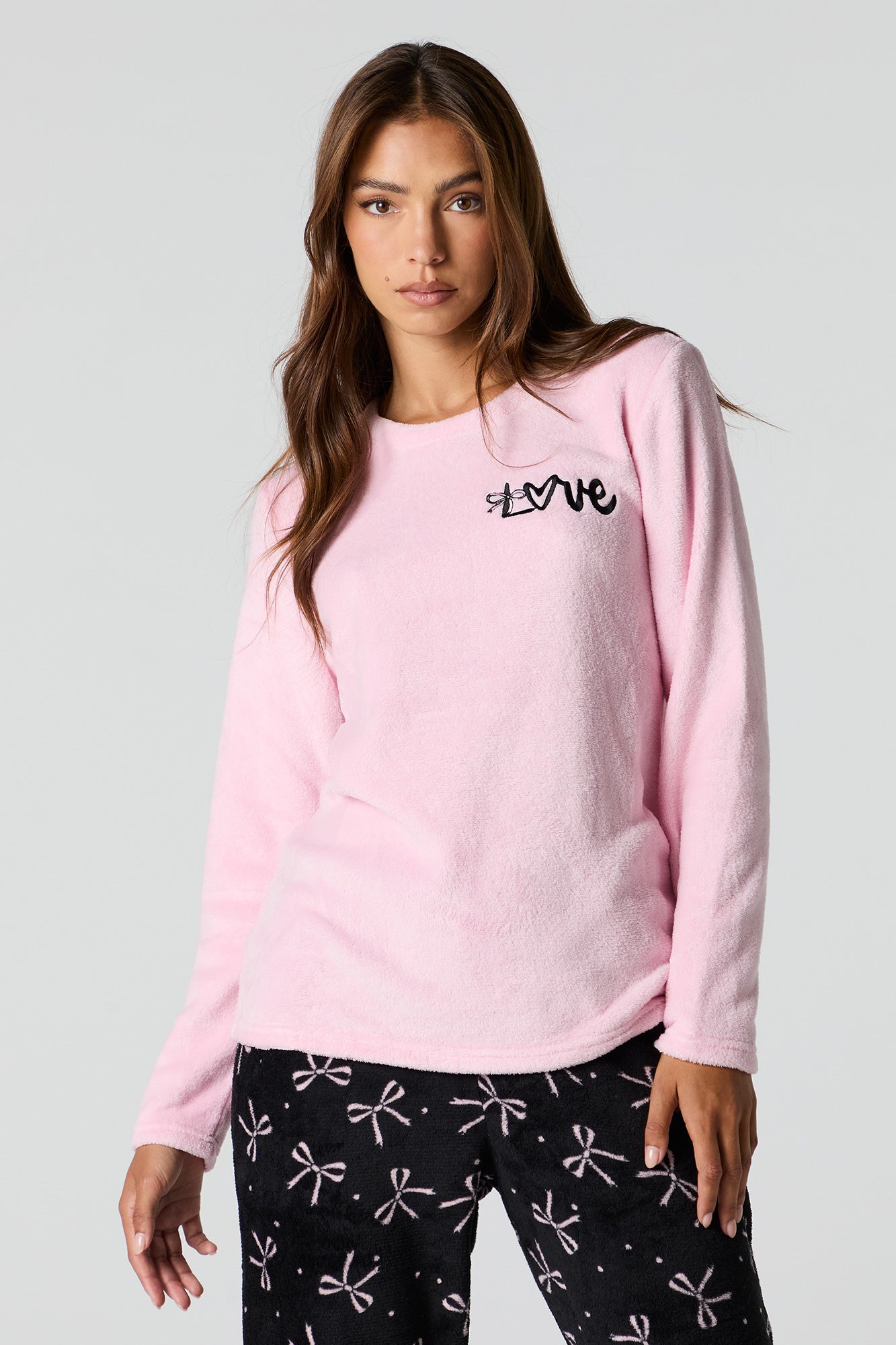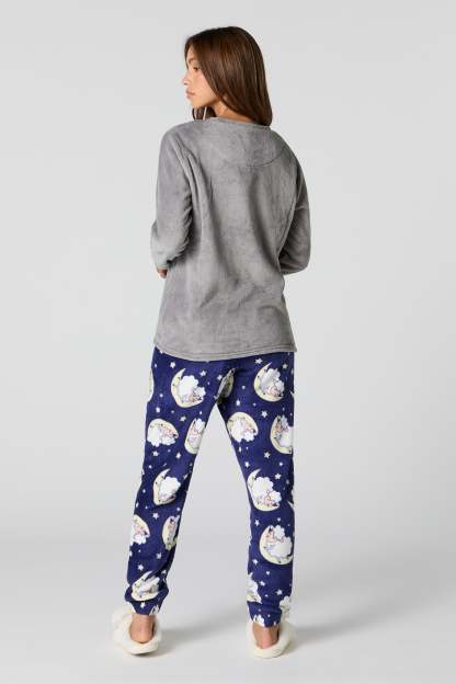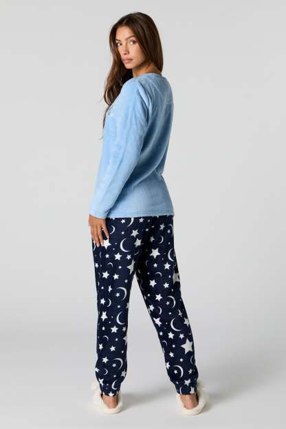 Snuggle up in our plush pajama set. This set comes with a pajama top featuring plush material, embroidered front, crew neckline, long sleeves, and a matching pajama pant featuring plush material, all-over print, and elastic waist.