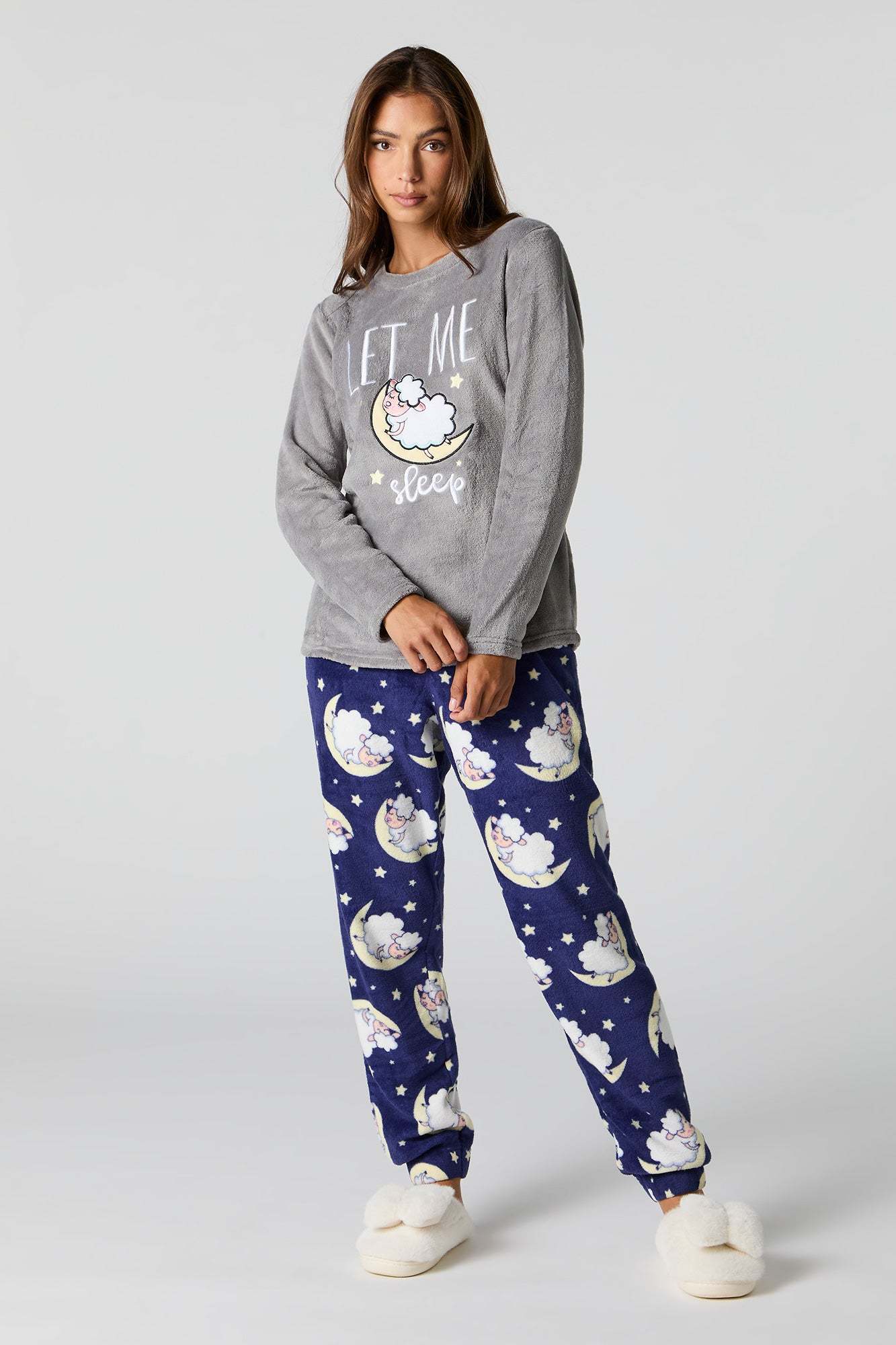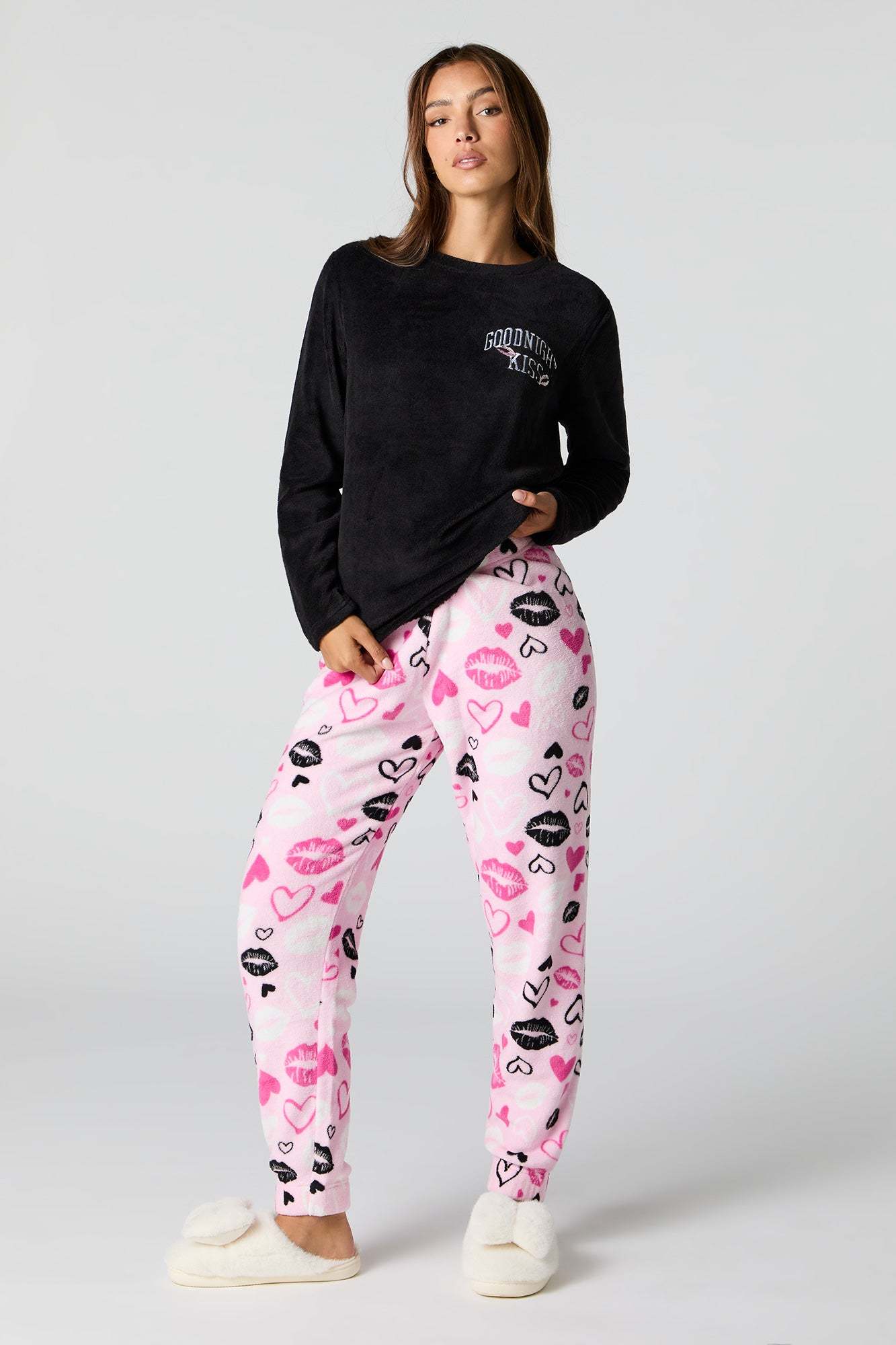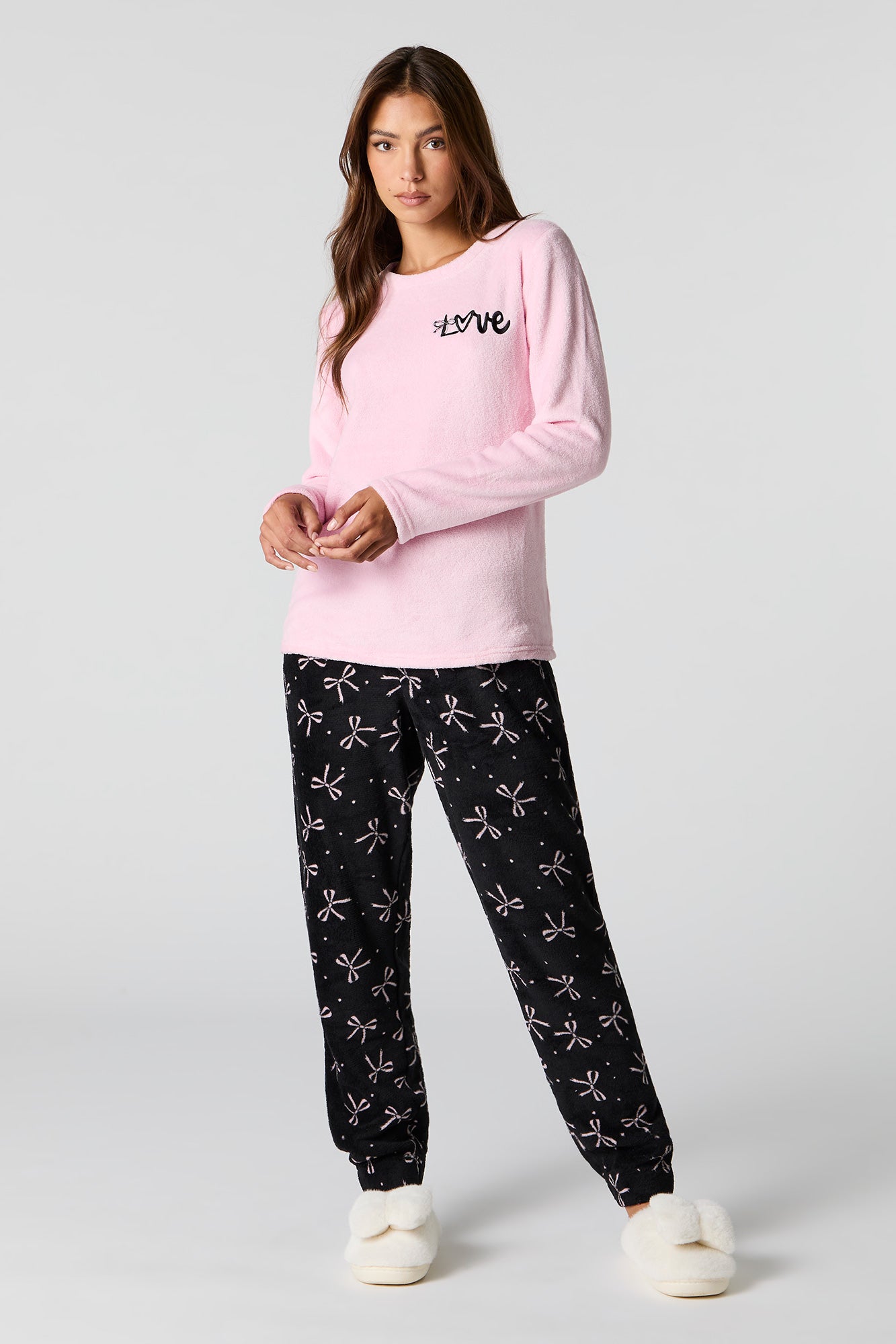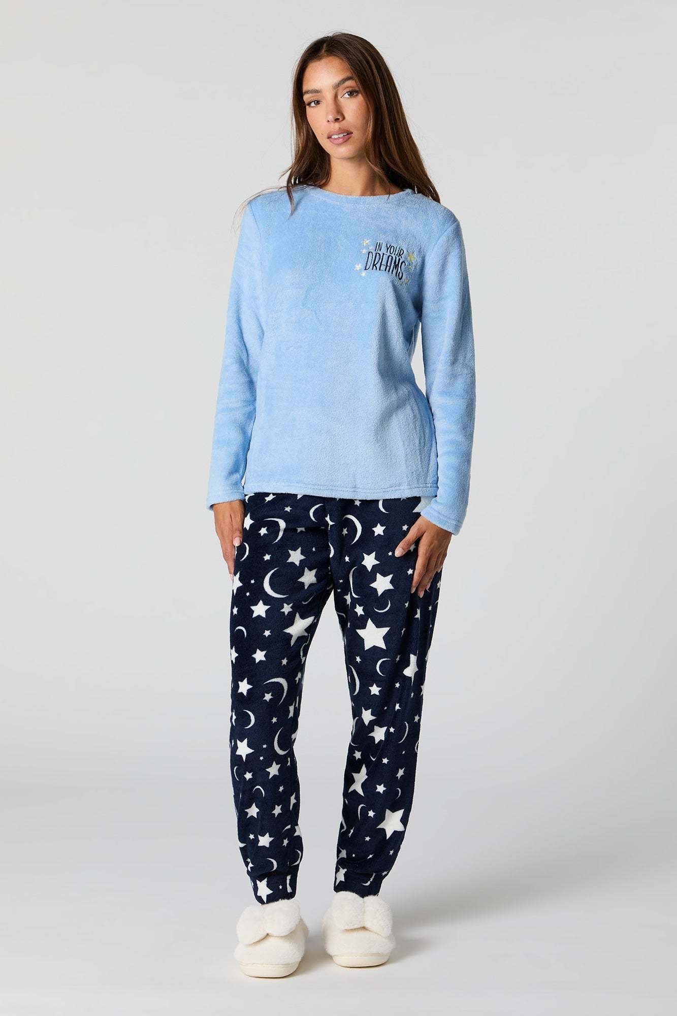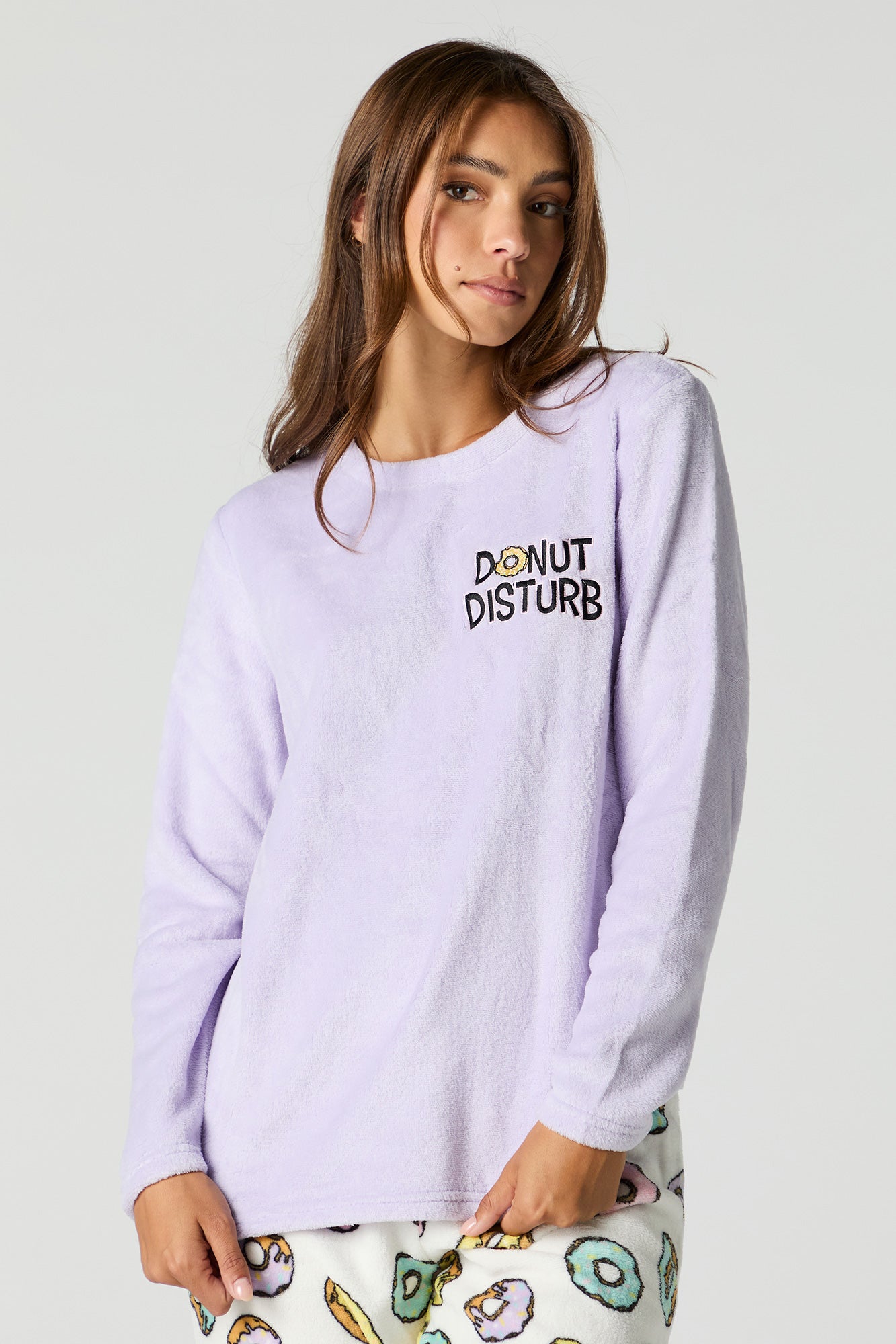 Snuggle up in our plush pajama set. This set comes with a pajama top featuring plush material, embroidered front, crew neckline, long sleeves, and a matching pajama pant featuring plush material, all-over print, and elastic waist.