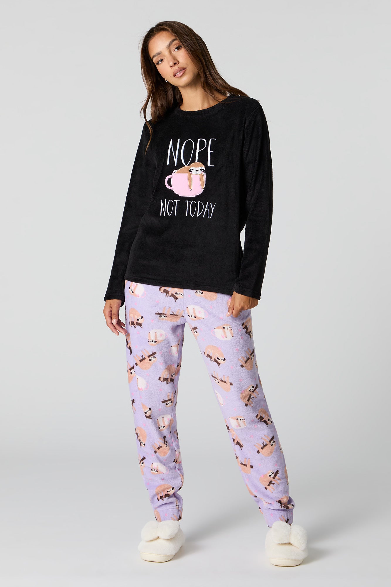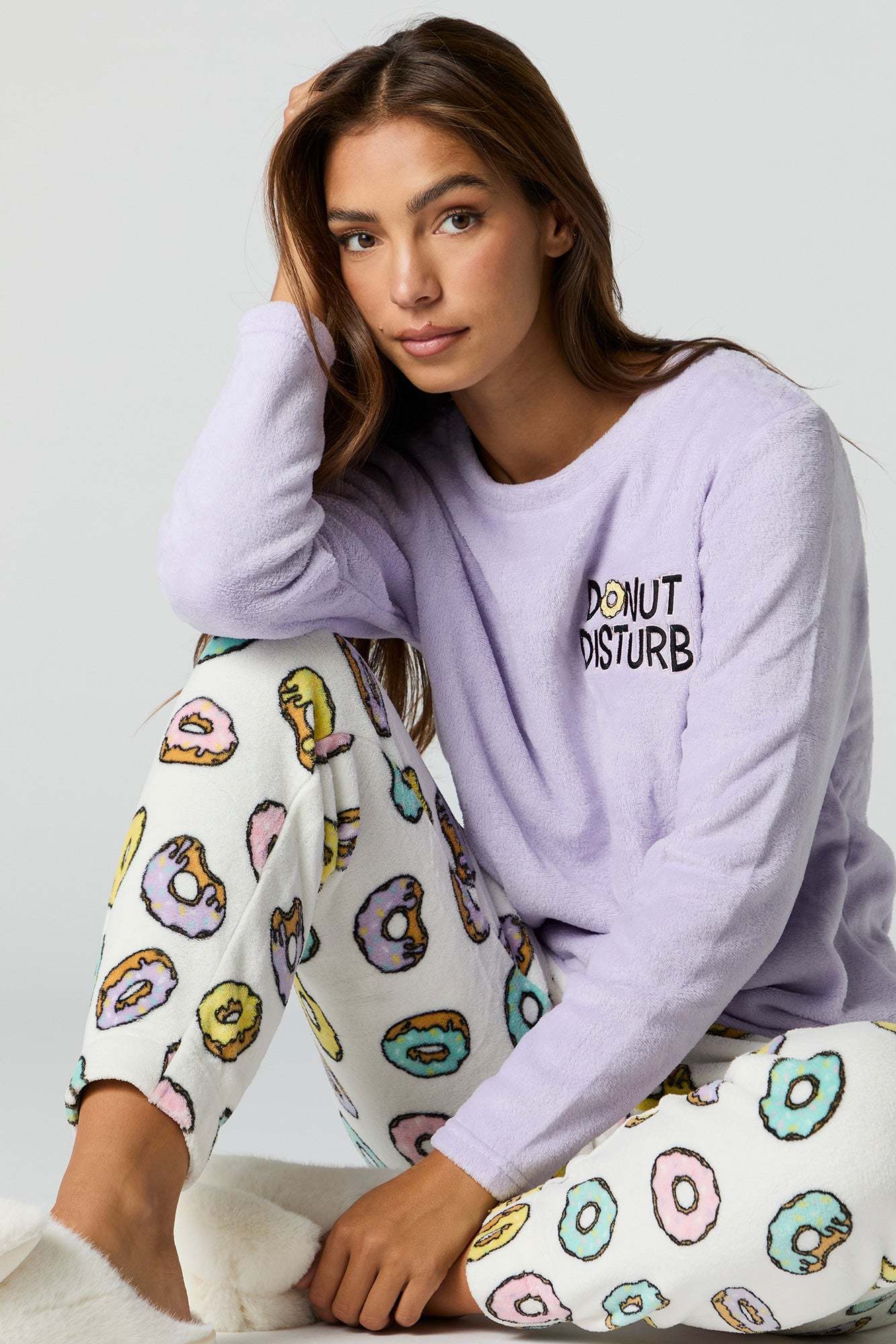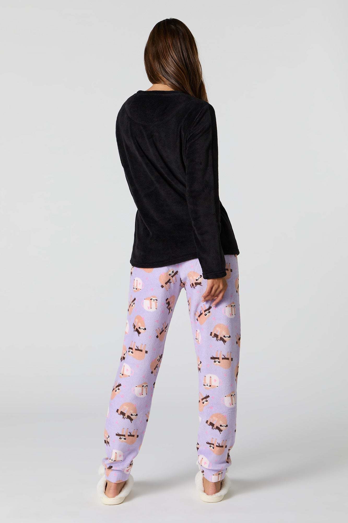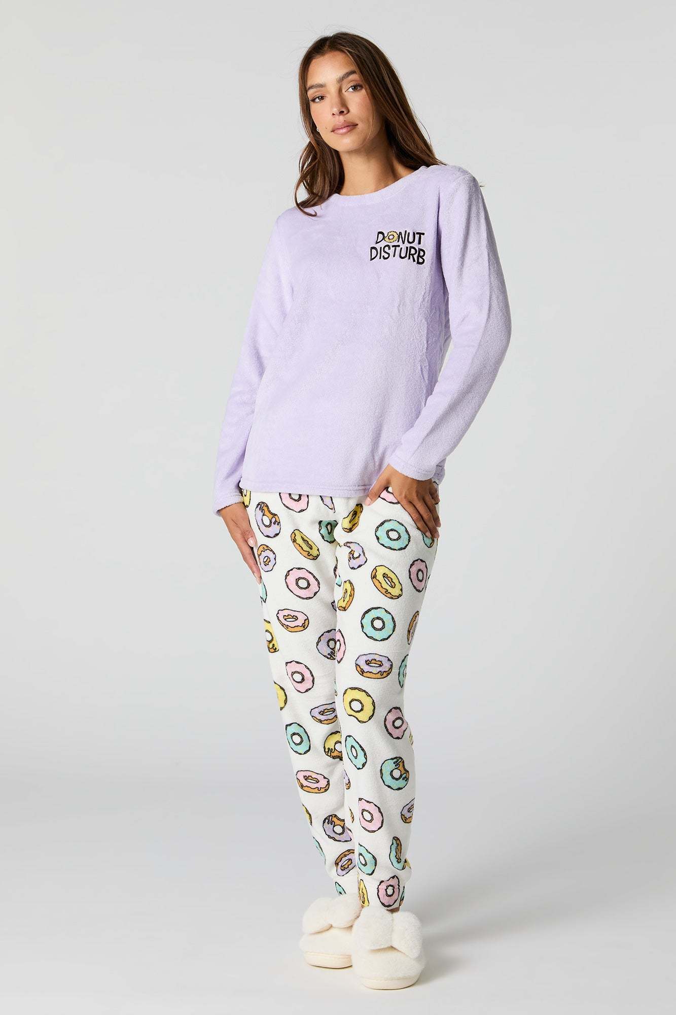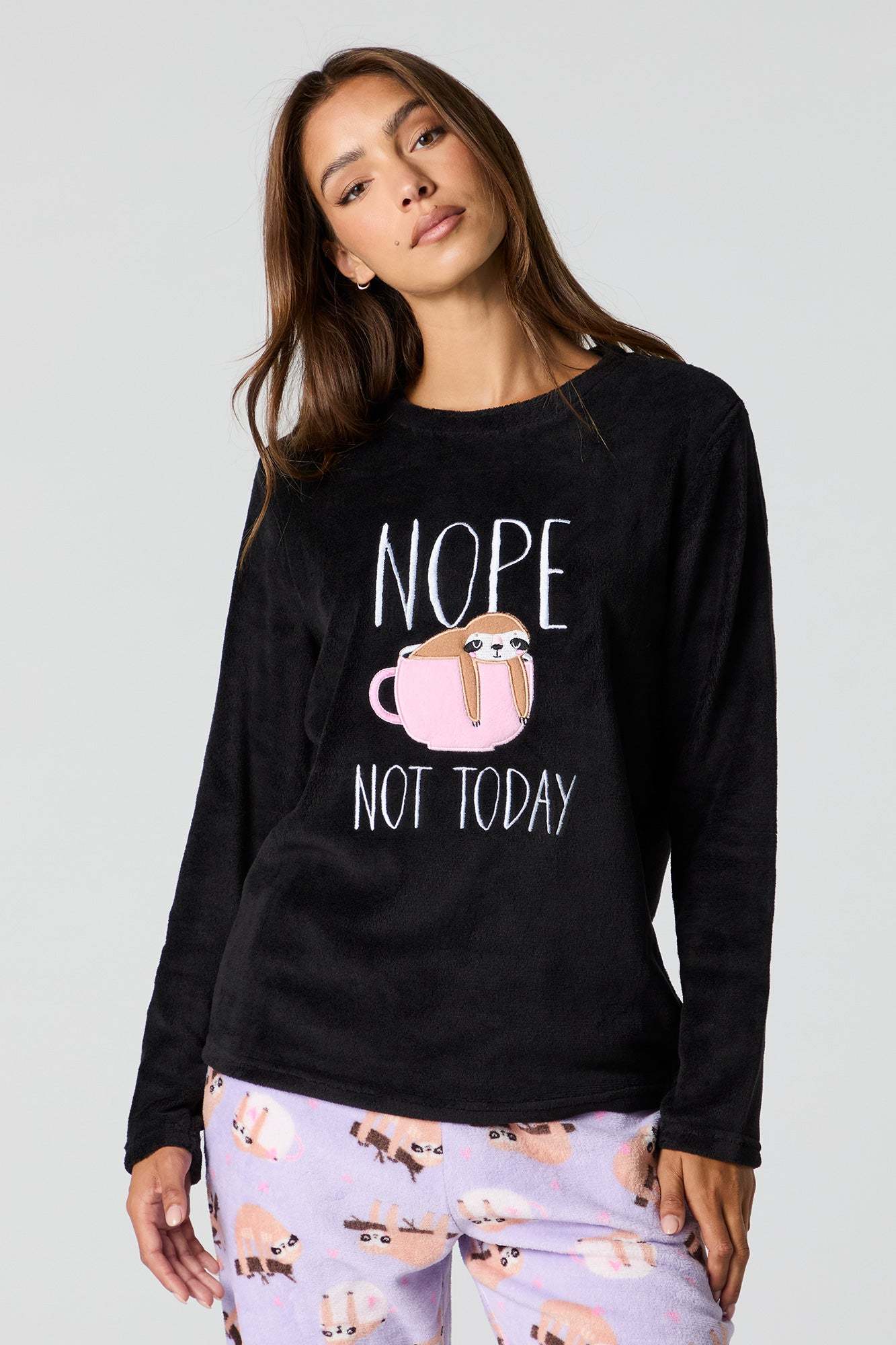 Snuggle up in our plush pajama set. This set comes with a pajama top featuring plush material, embroidered front, crew neckline, long sleeves, and a matching pajama pant featuring plush material, all-over print, and elastic waist.