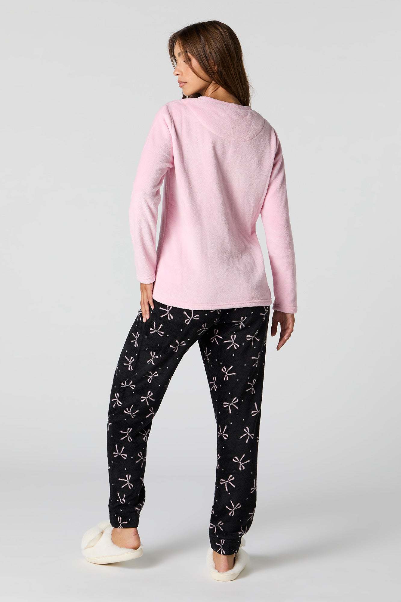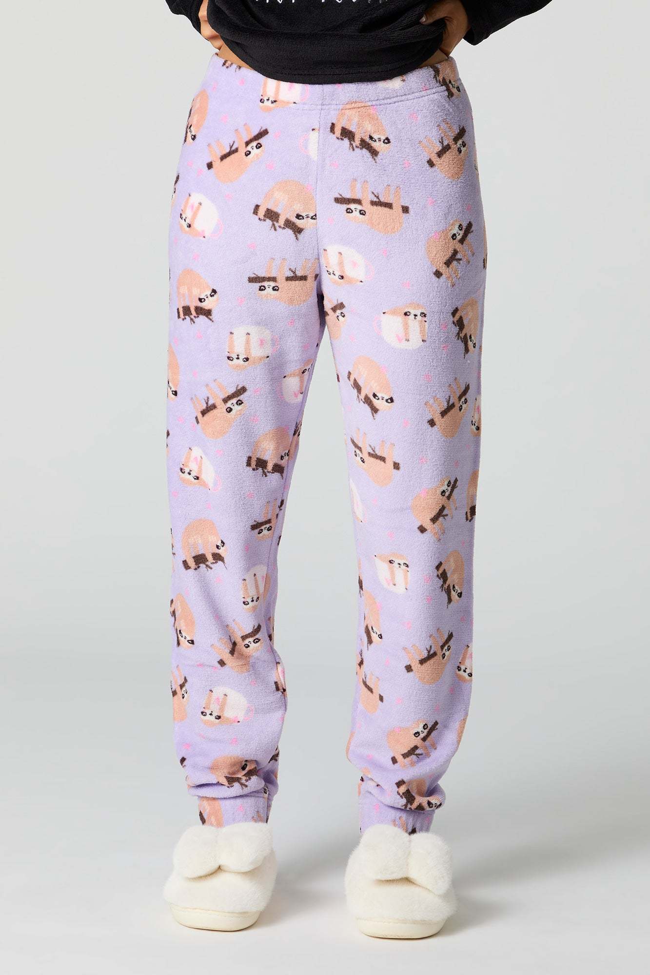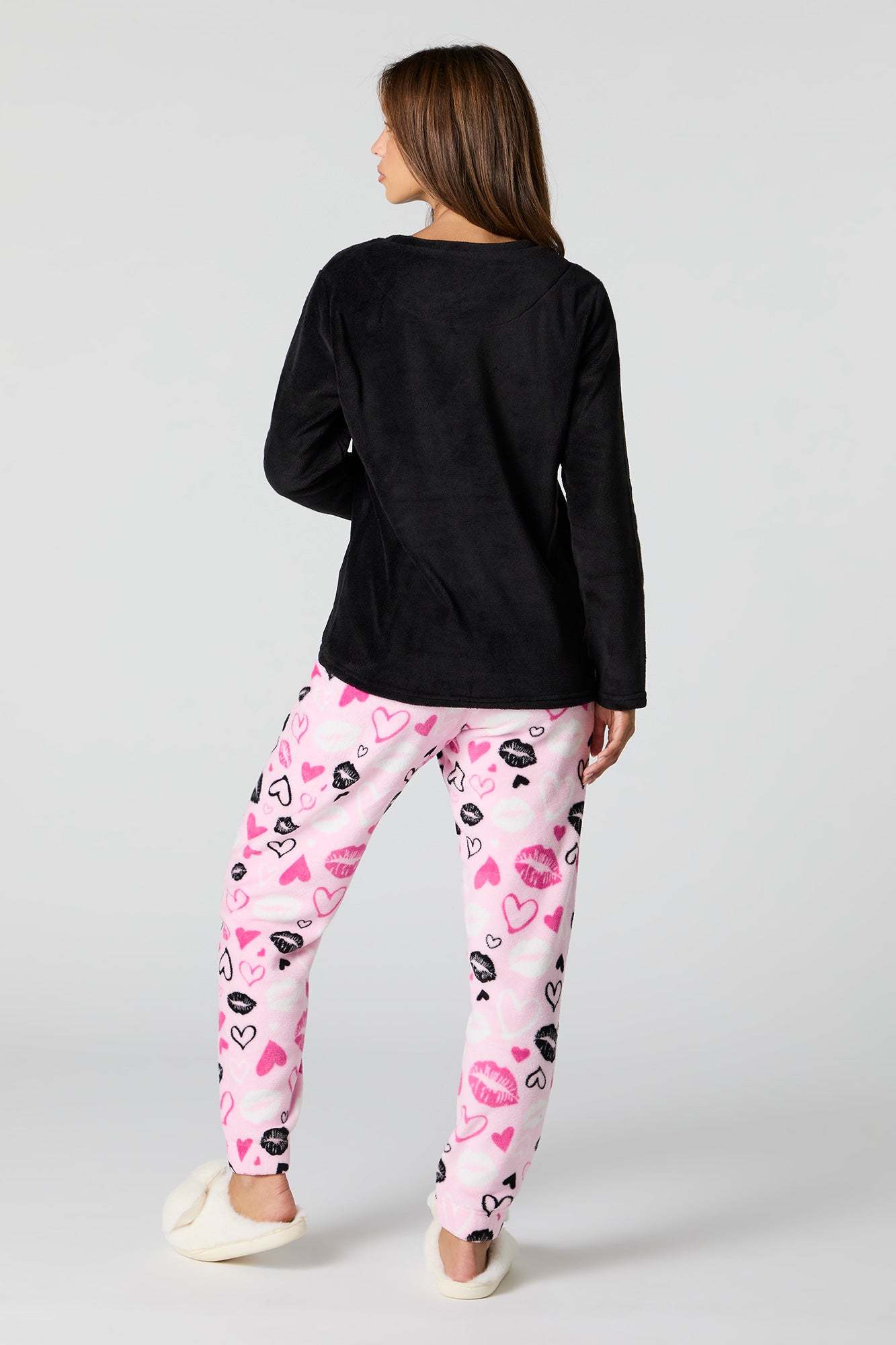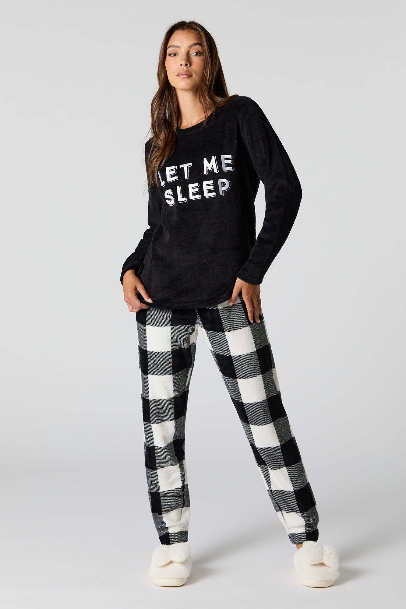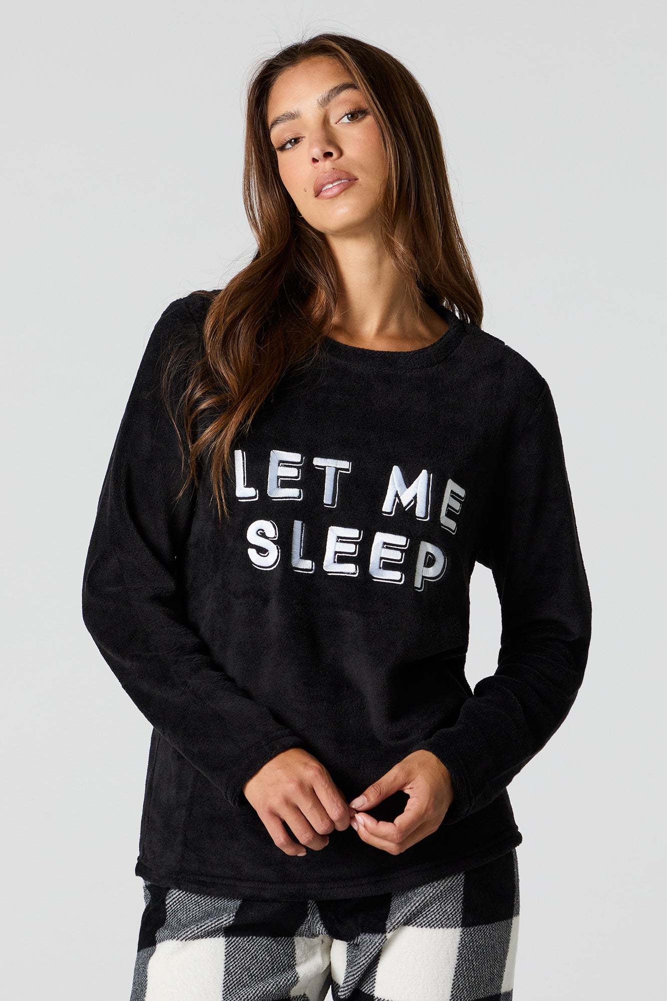Snuggle up in our plush pajama set. This set comes with a pajama top featuring plush material, embroidered front, crew neckline, long sleeves, and a matching pajama pant featuring plush material, all-over print, and elastic waist.