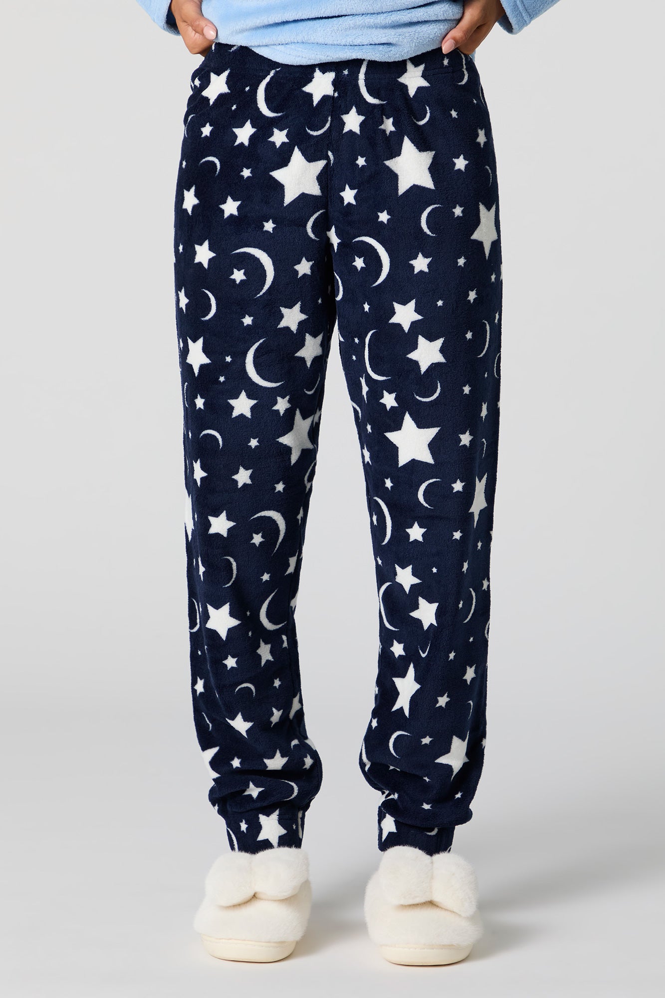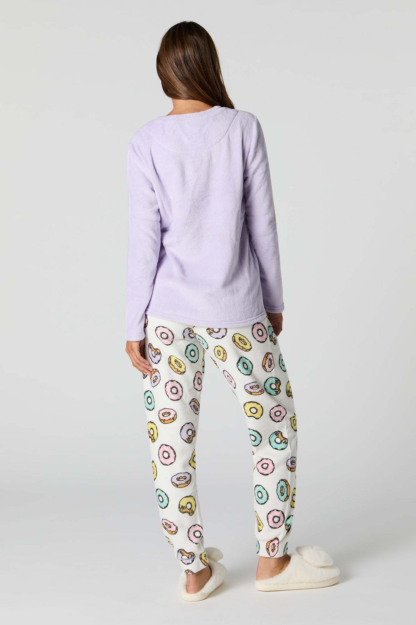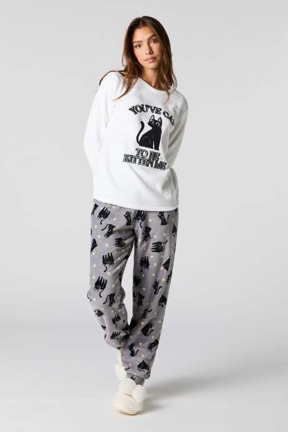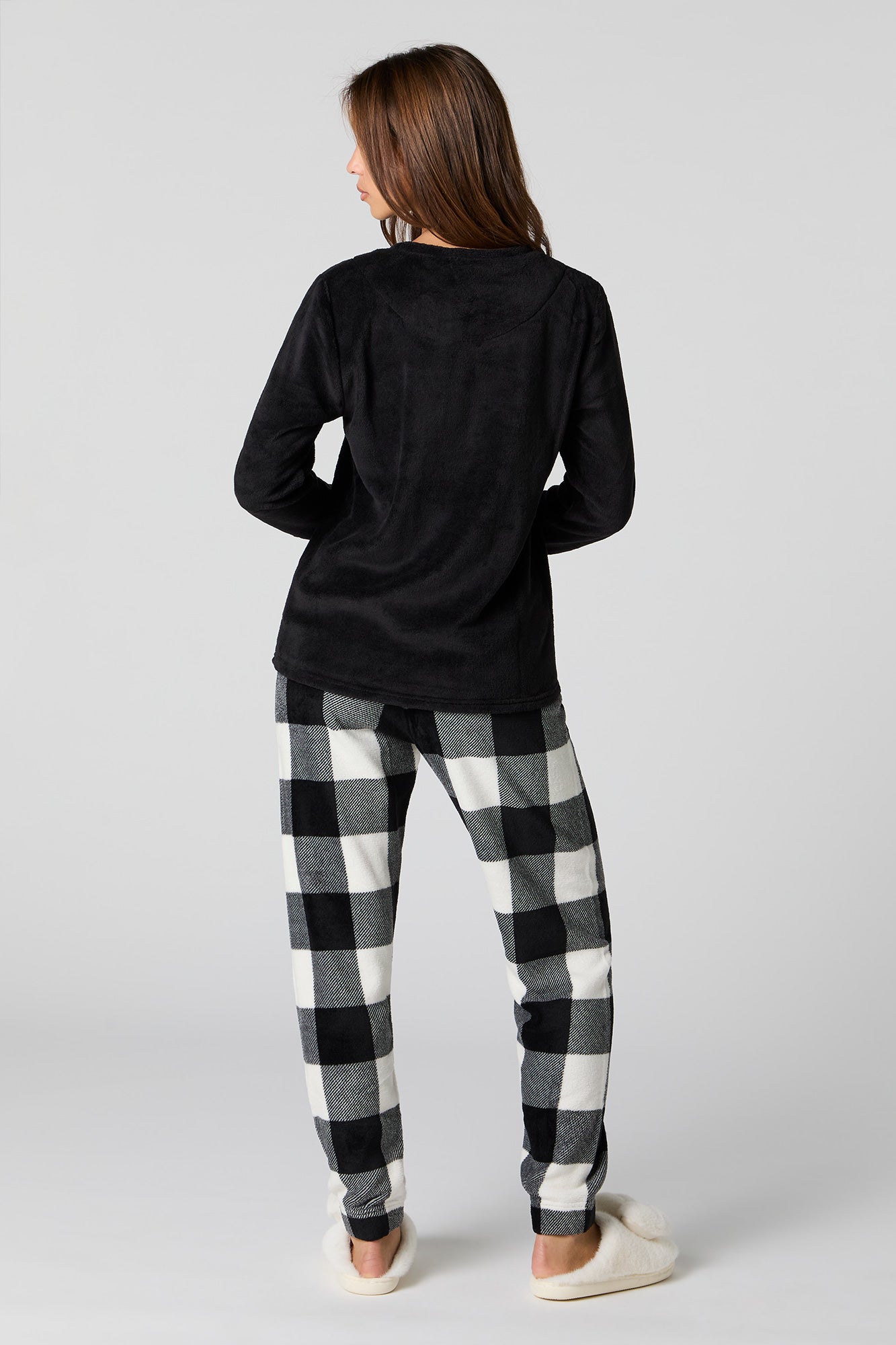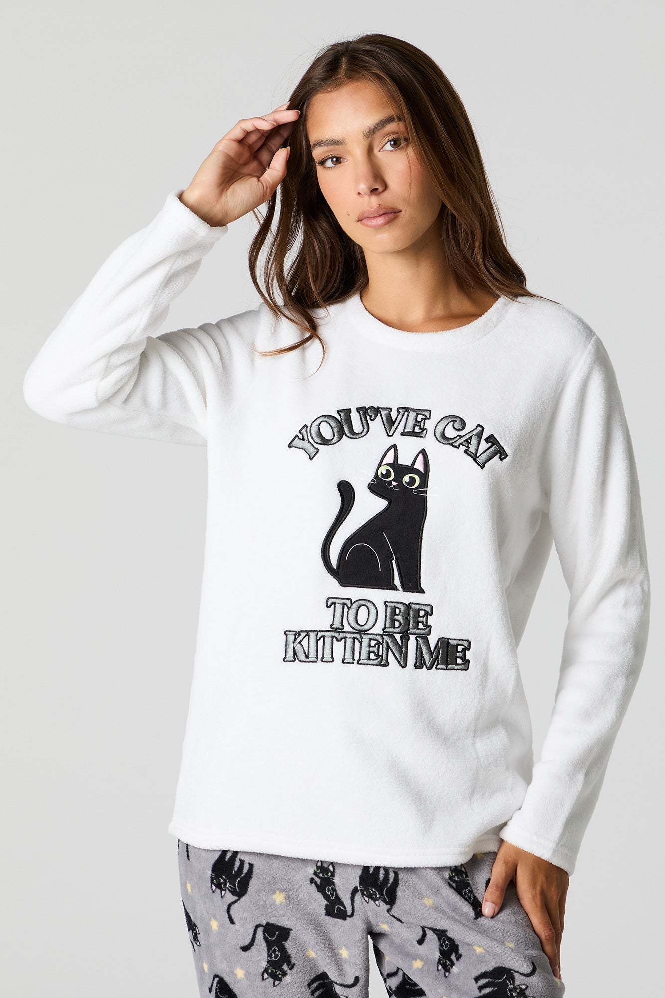 Snuggle up in our plush pajama set. This set comes with a pajama top featuring plush material, embroidered front, crew neckline, long sleeves, and a matching pajama pant featuring plush material, all-over print, and elastic waist.