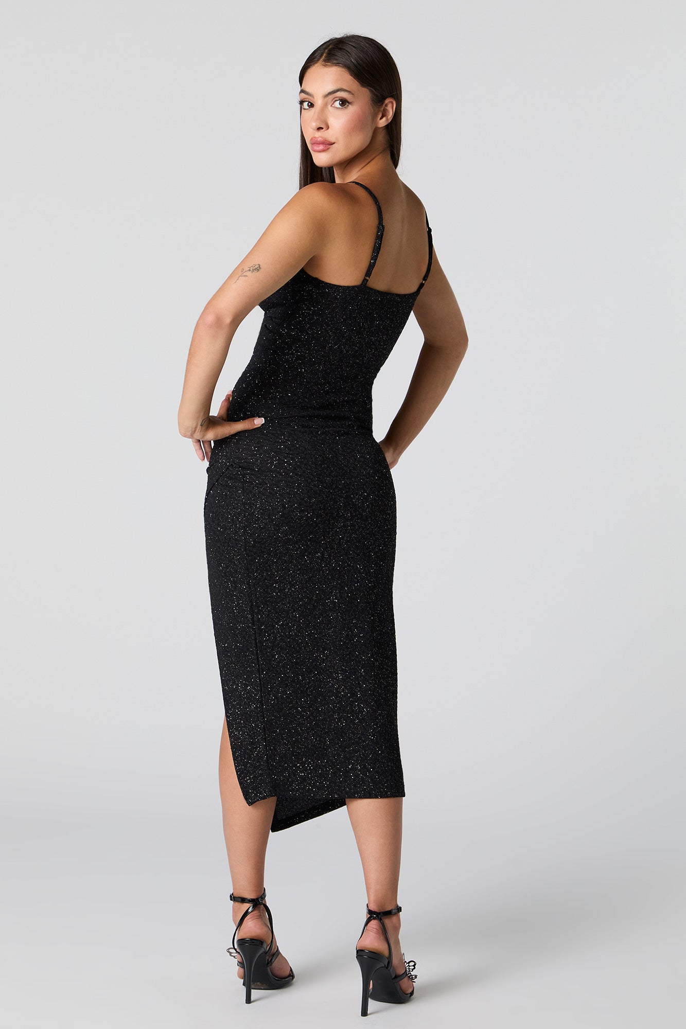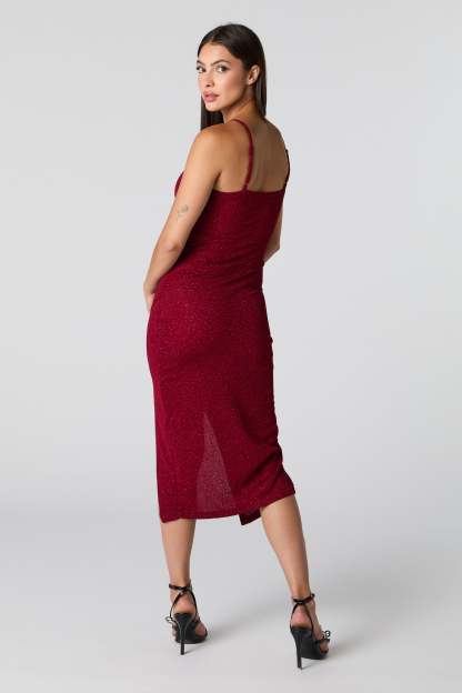 Why stay in when you could wear this? This dress features textured material, sparkle finish, surplice neckline, adjustable straps, wrapped construction, leg slit, and midi length.
