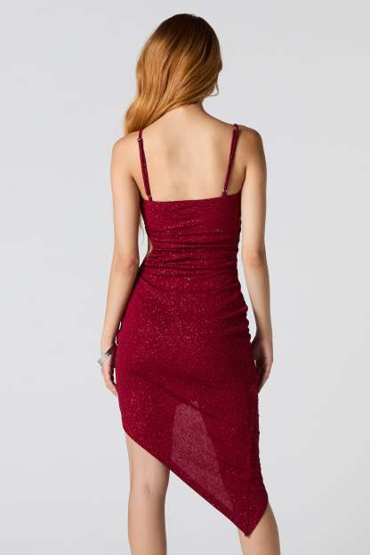 Outshine the crowd at your next holiday party. This jumpsuit features sparkly material, straight cut neckline, adjustable straps, cut-out drawstring side, asymmetrical design, and midi length.