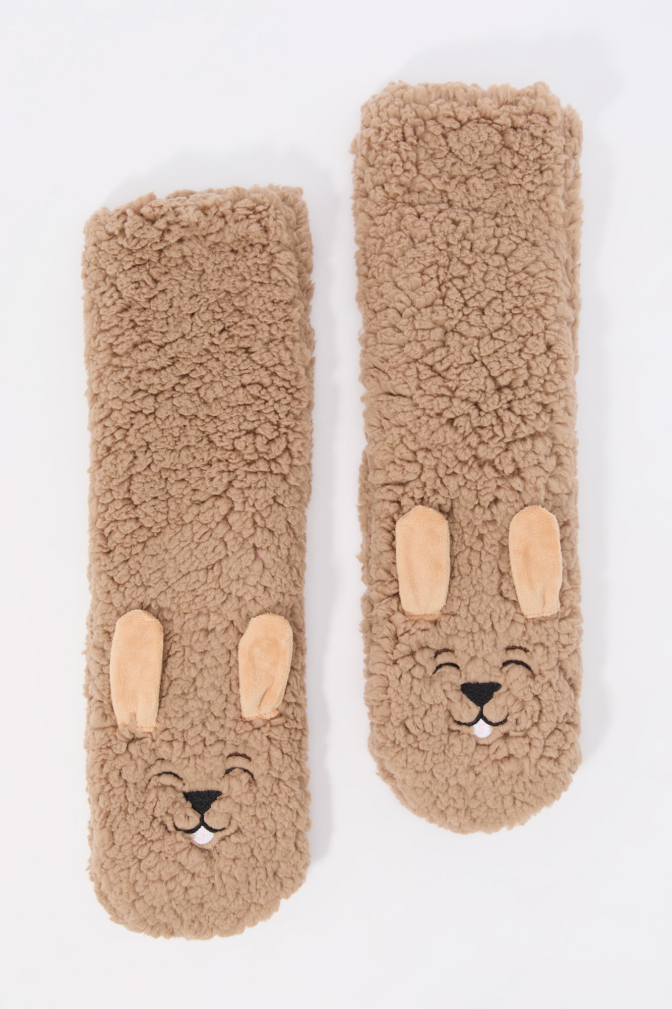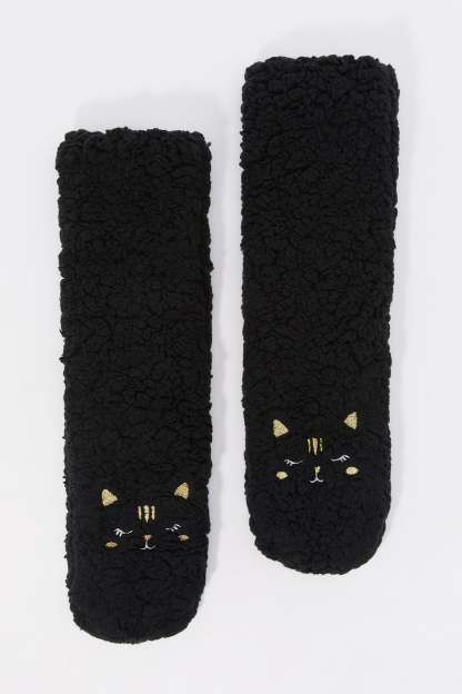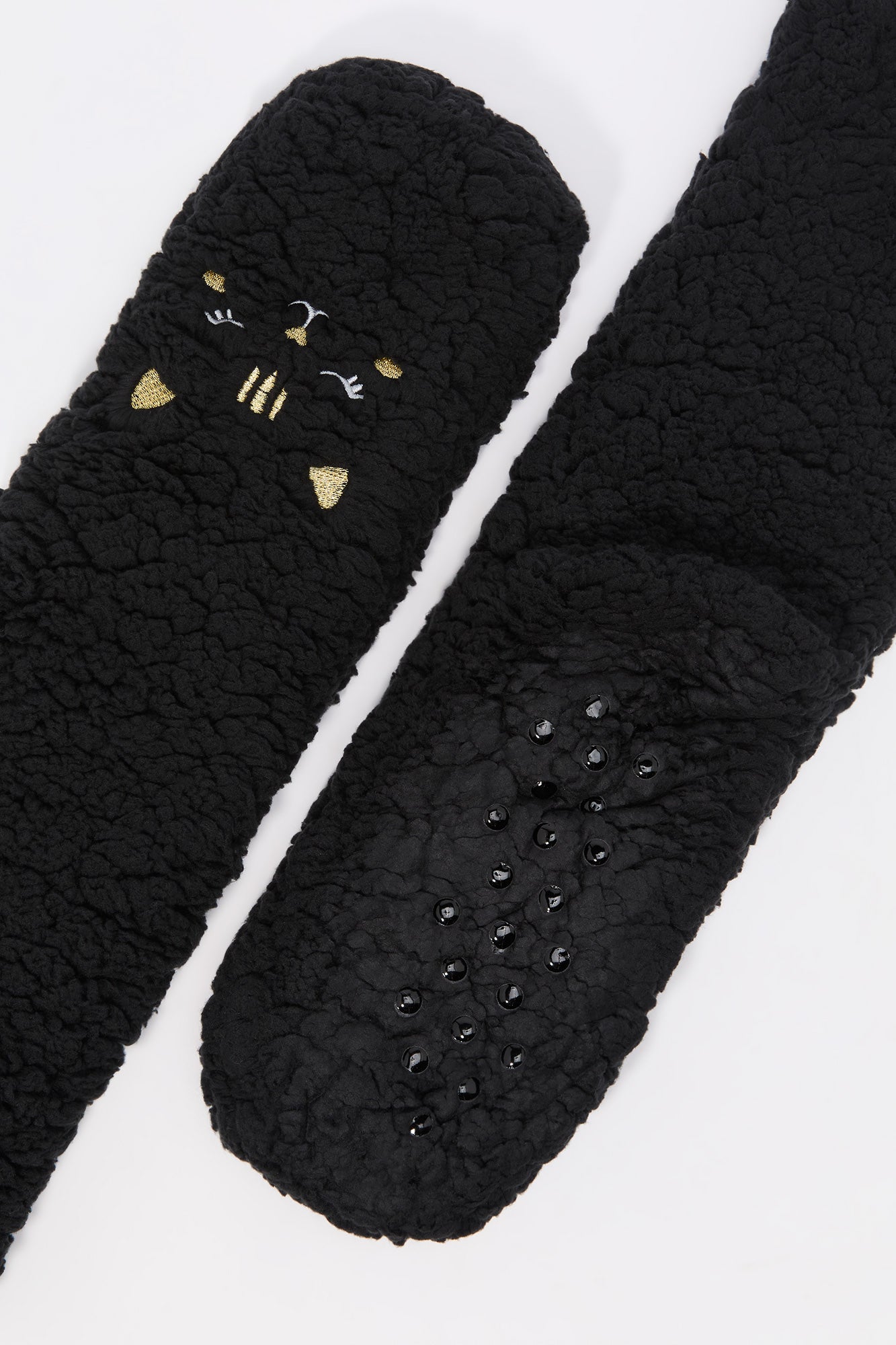 These slipper socks feature Sherpa material, no-slip soles, and crew length.
