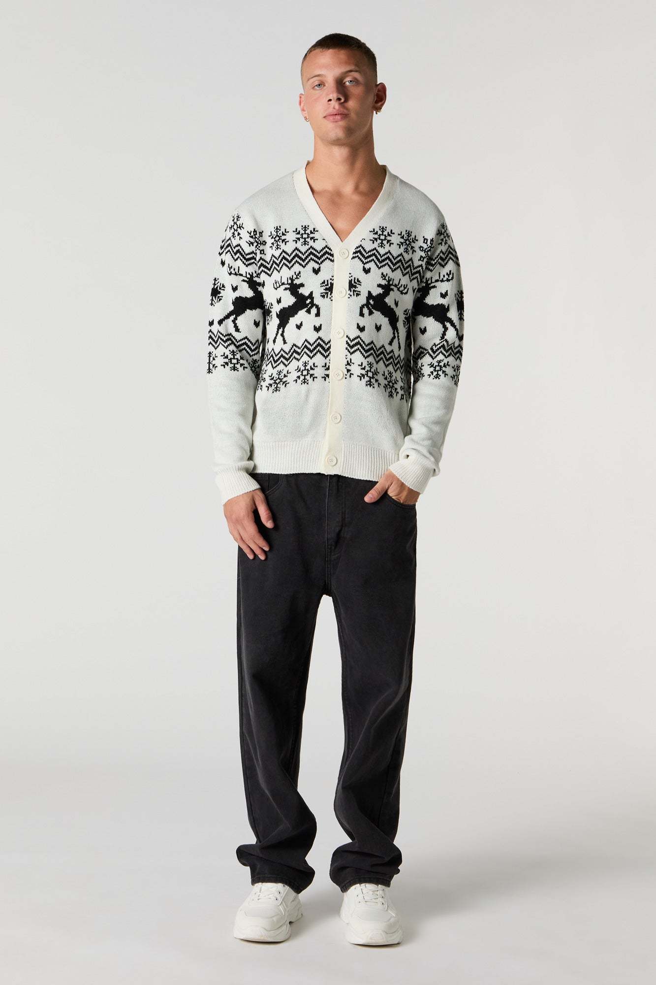 This cardigan features Fairisle jacquard knit material, V-neckline, button-up front, long sleeves, and ribbed knit trim.