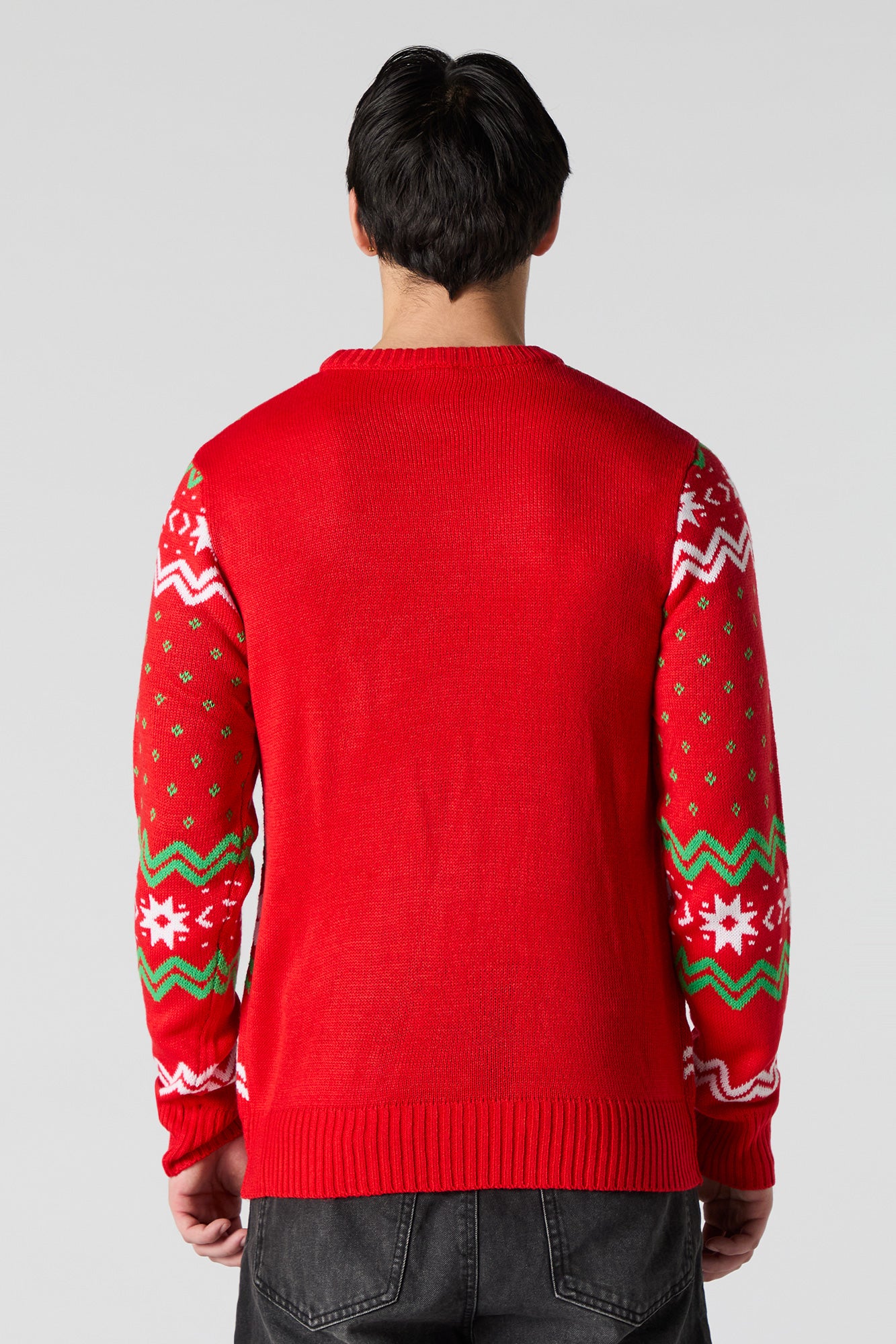 This Christmas sweater features jacquard knit material, crew neckline, long sleeves, and ribbed knit trim.