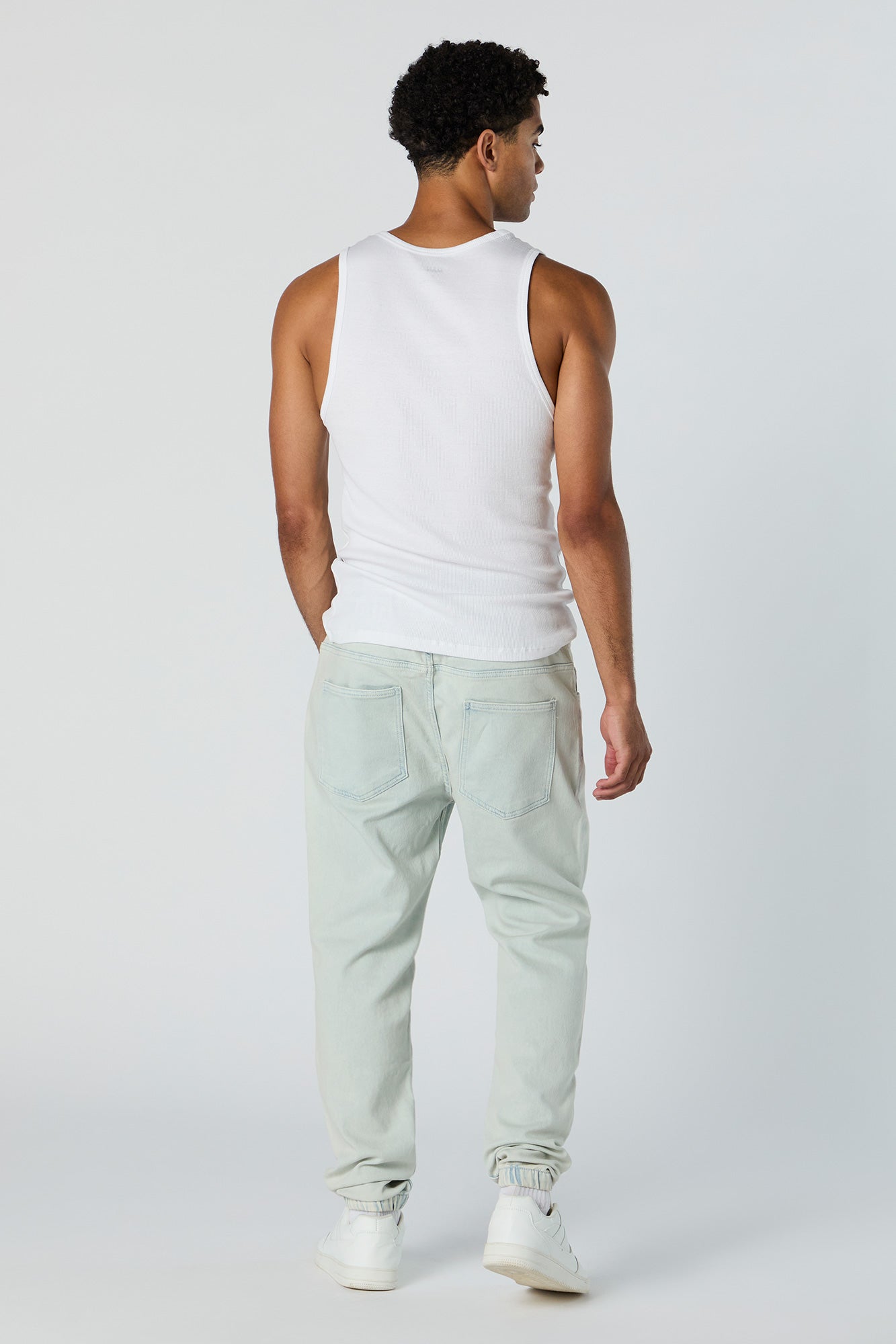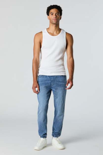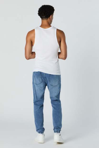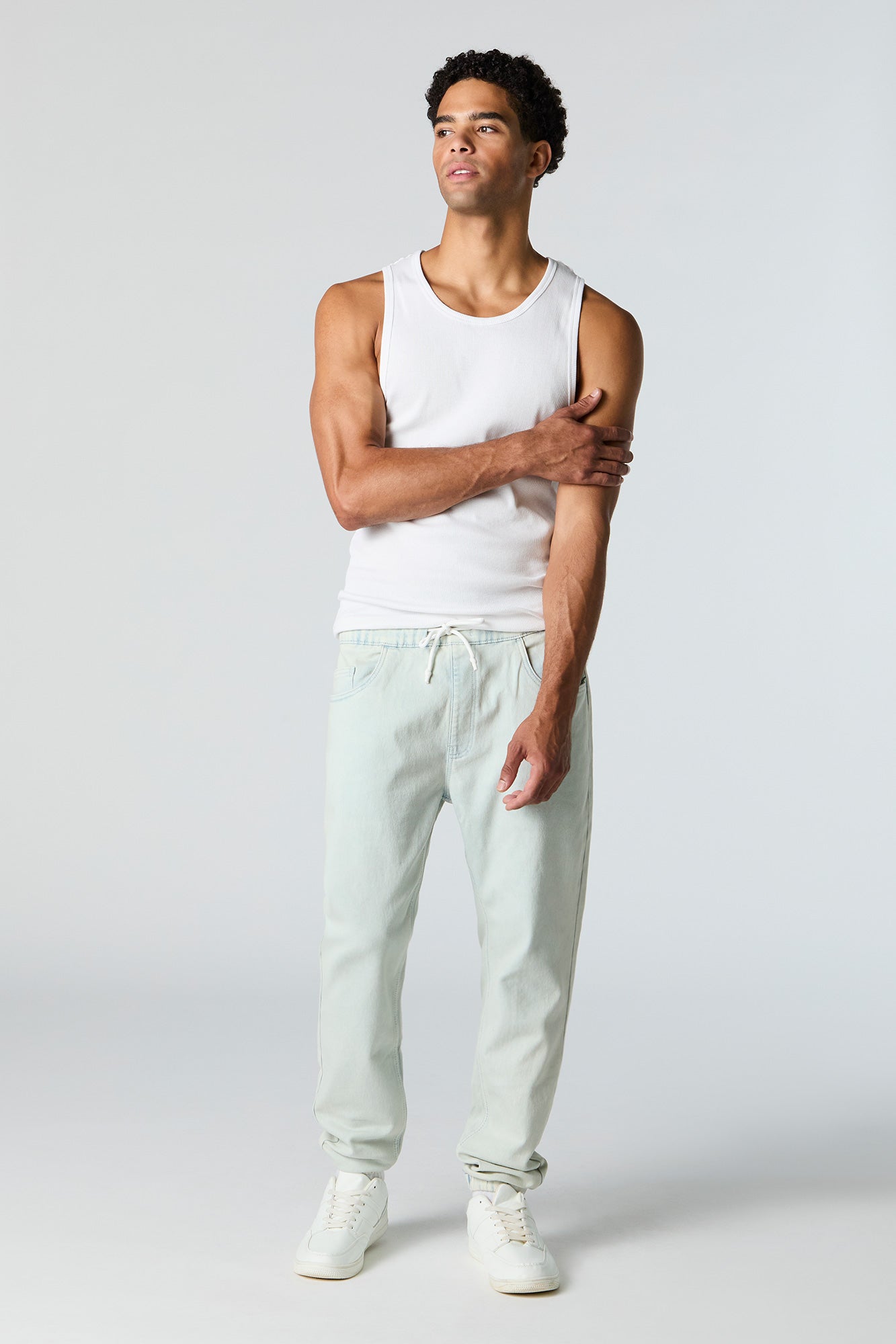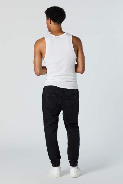 Our new season obsession? Denim everything. This jogger features denim material, drawstring waist, slide-in pockets, and slide-in pockets.
