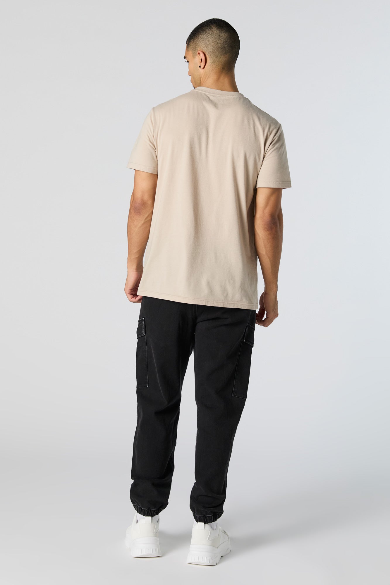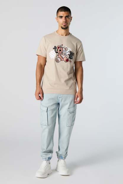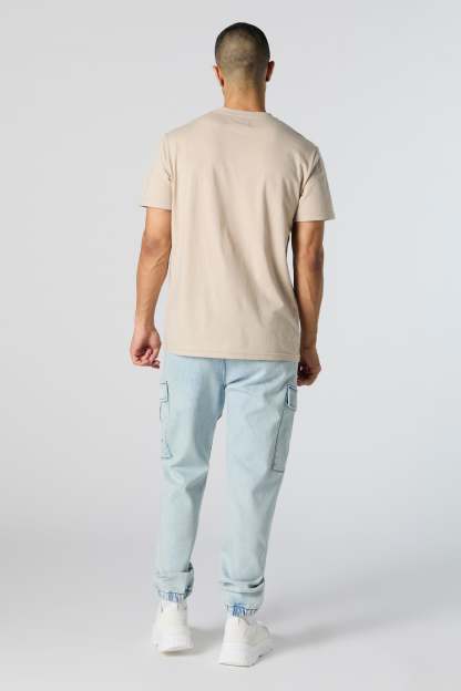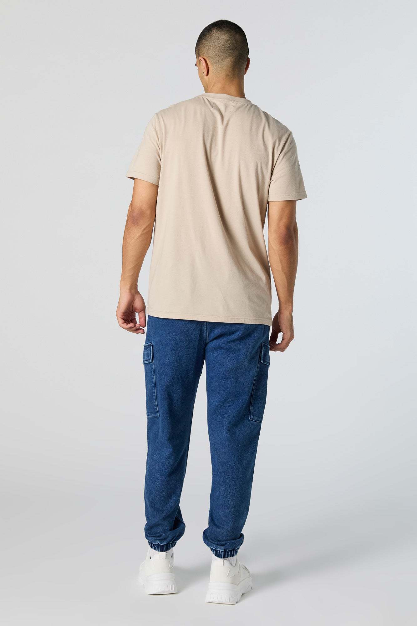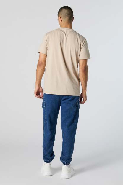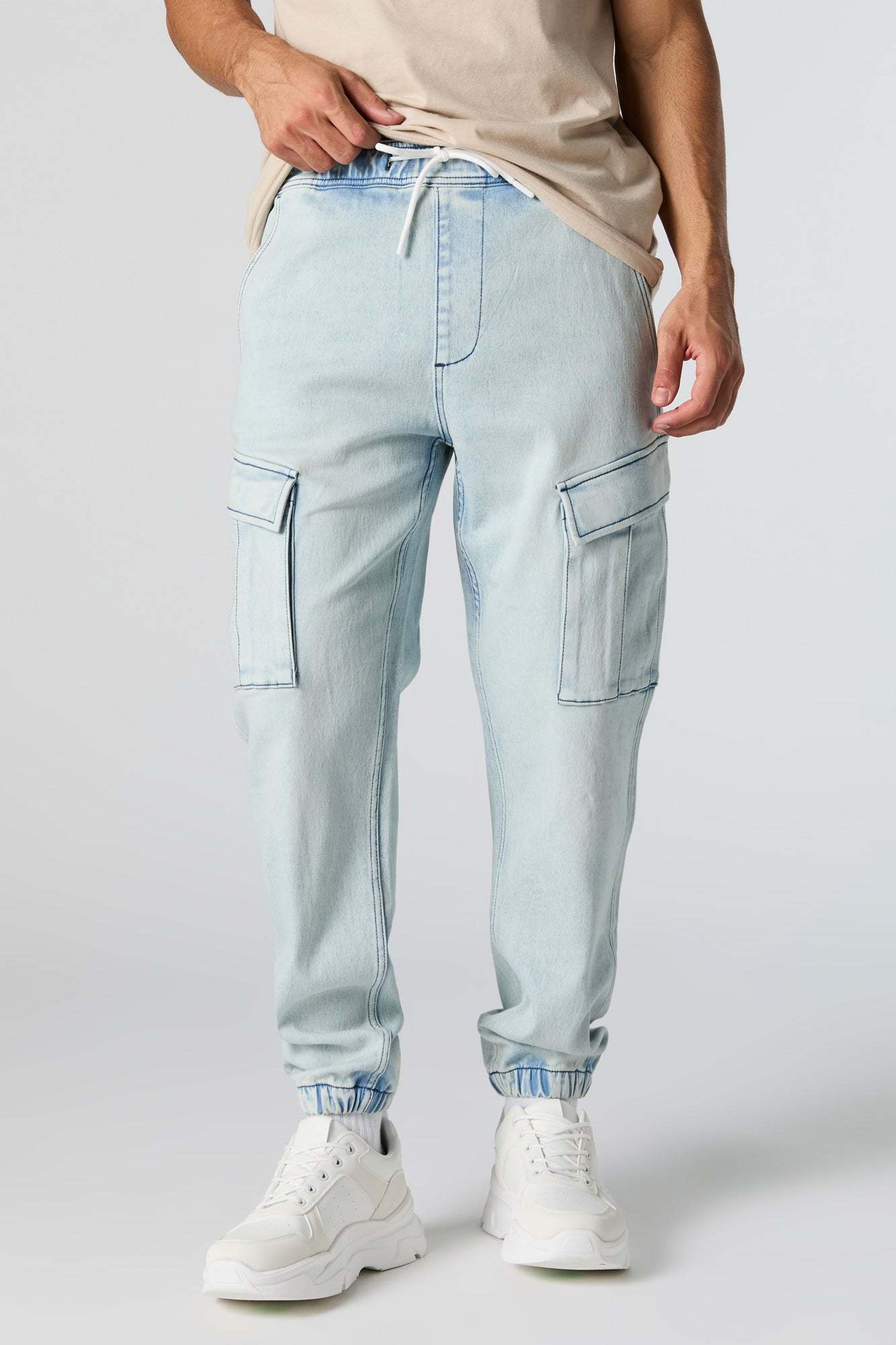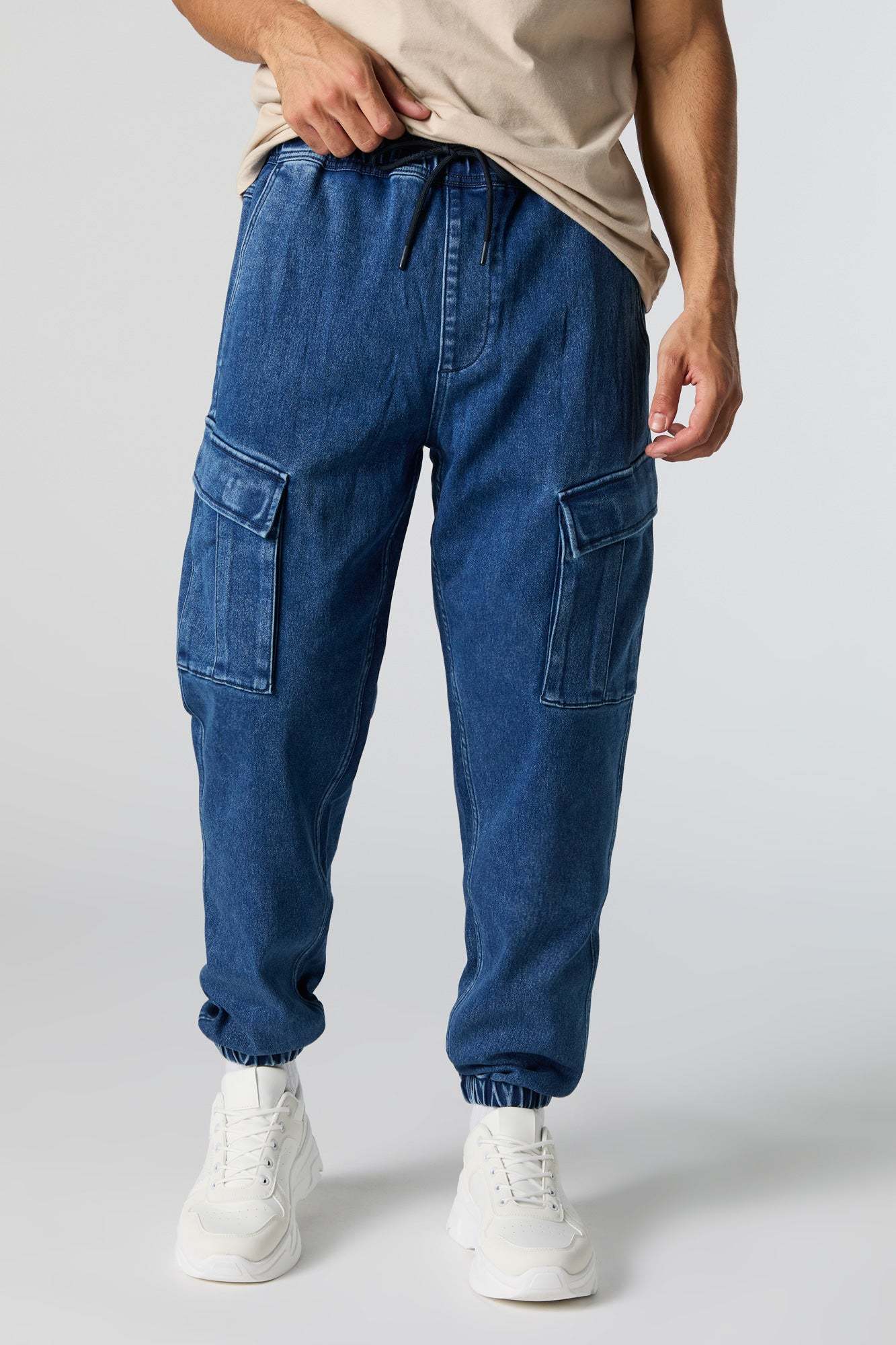 This jogger features denim material, drawstring waist, slide-in pockets, cargo pockets, and cinched ankles.
